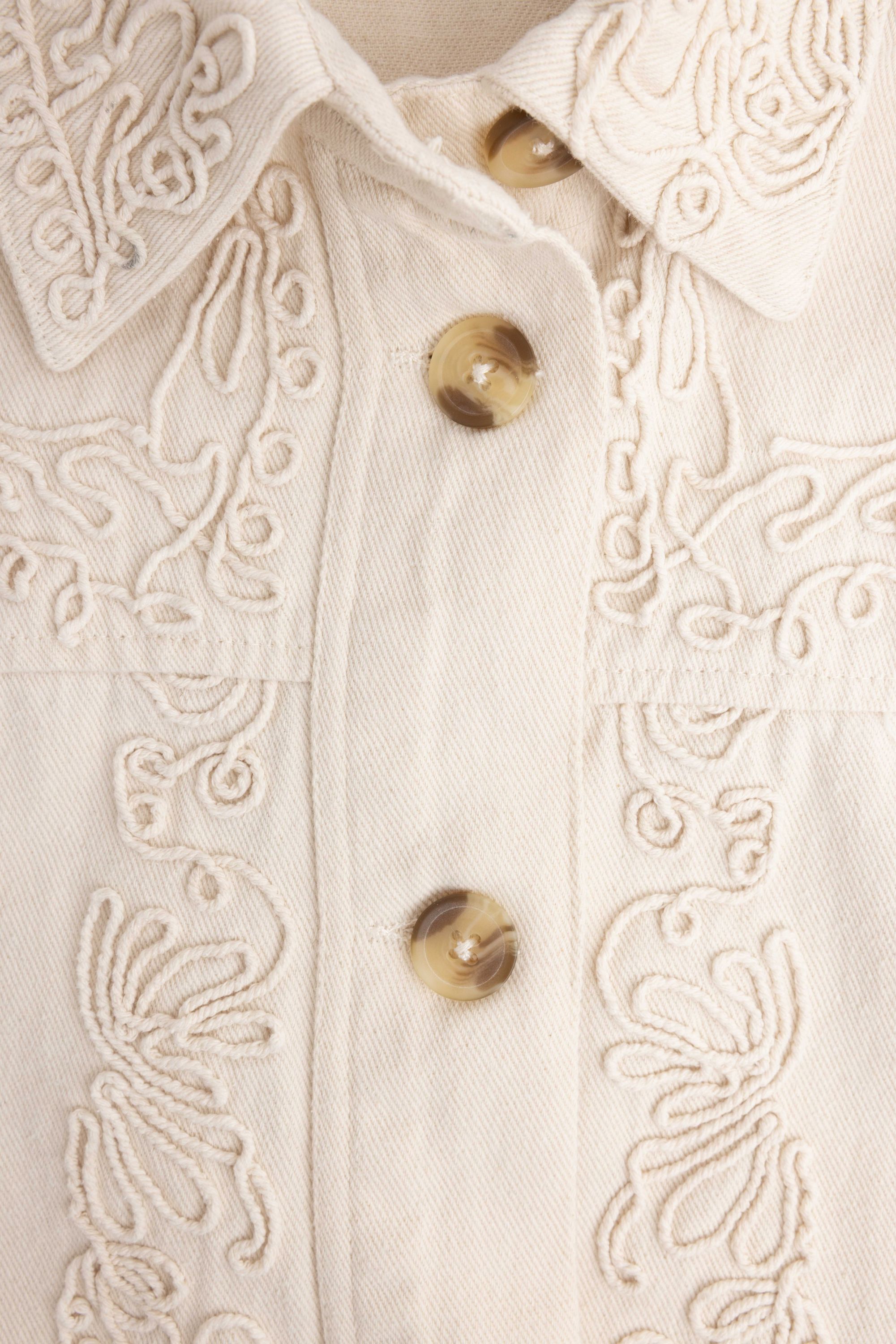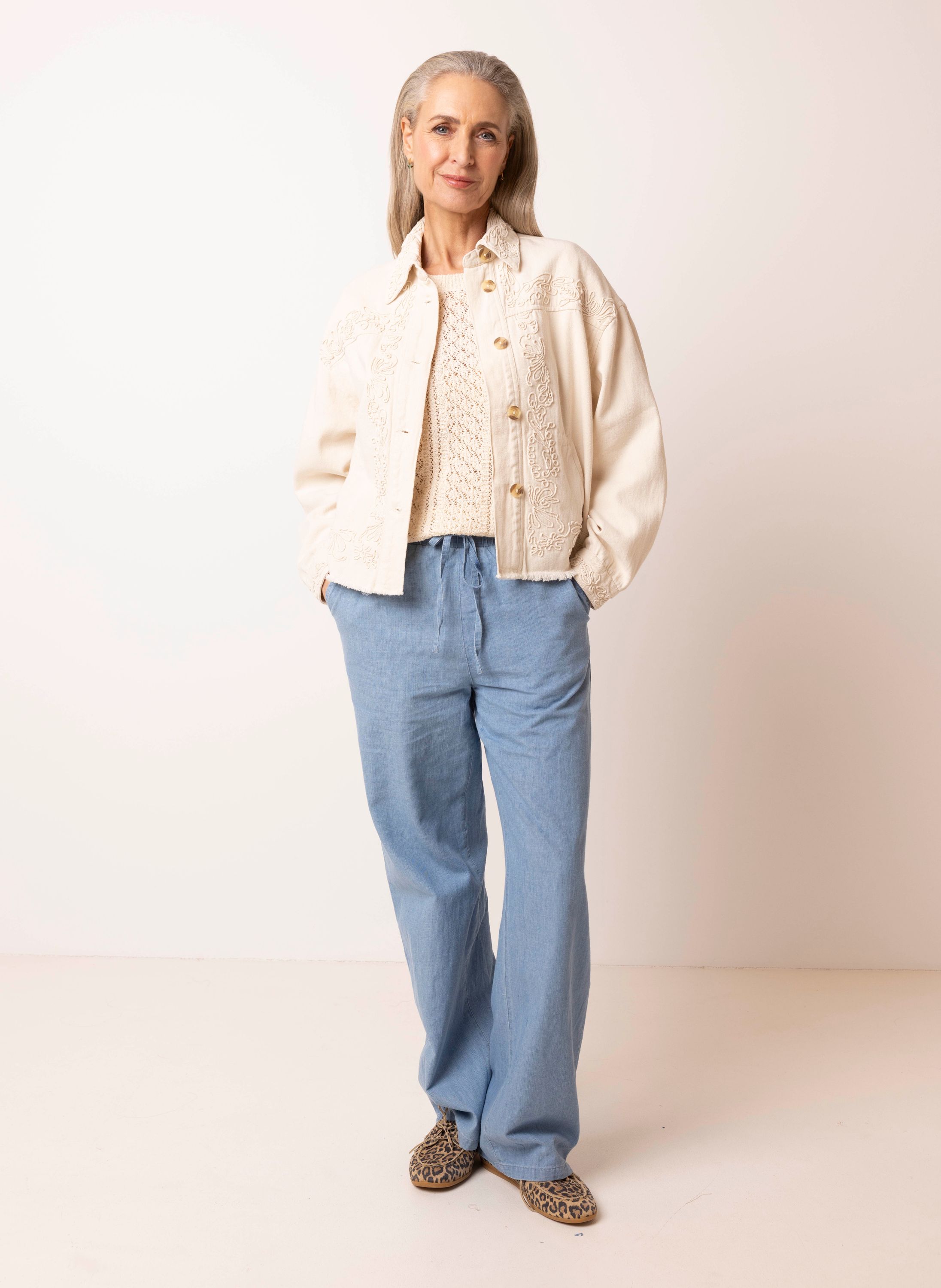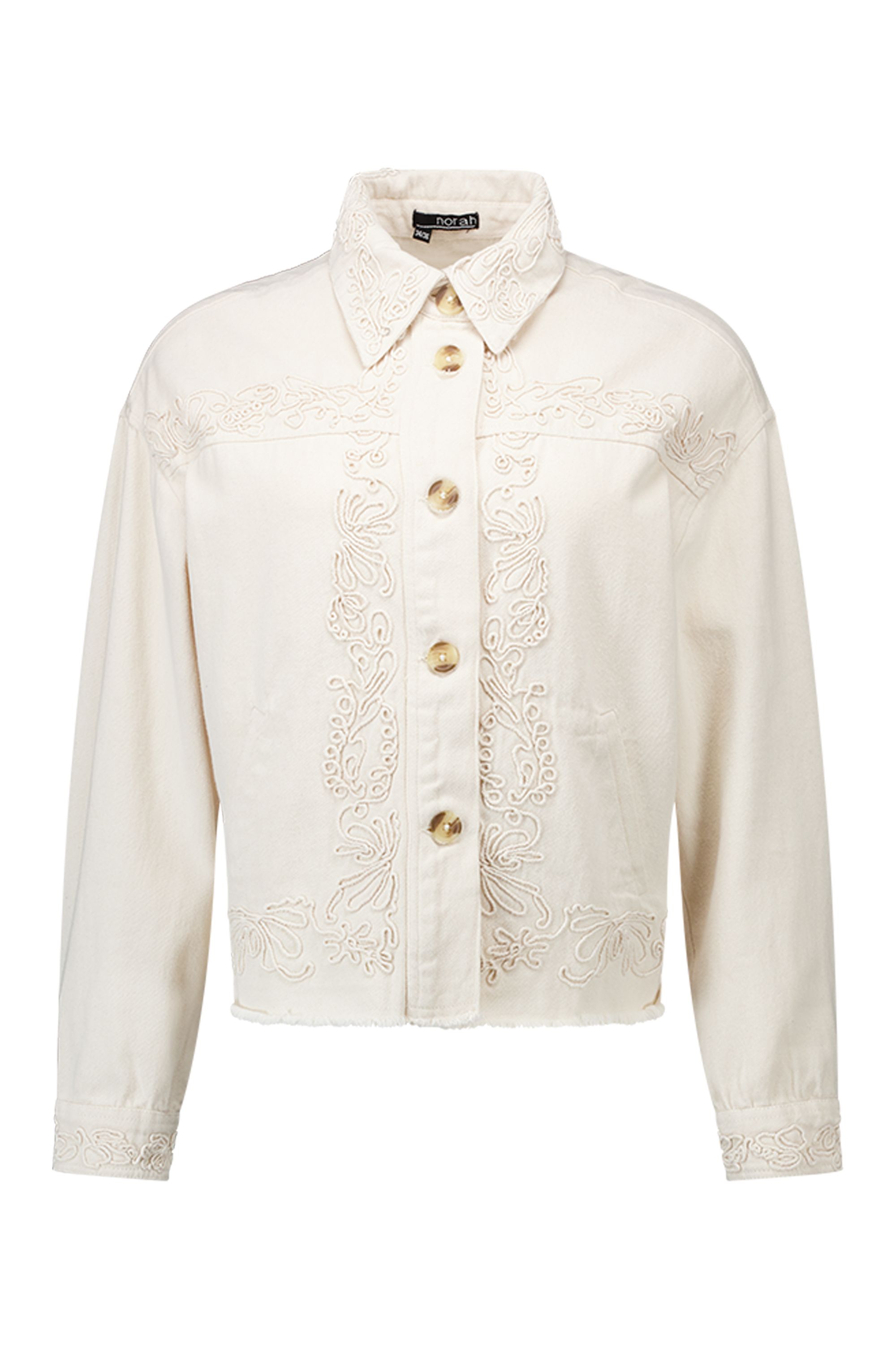 Deze denim jas met klassieke kraag, lange mouwen, knoopsluiting, borduursels en rafelrand aan de onderzijde heeft een stoere uitstraling.
