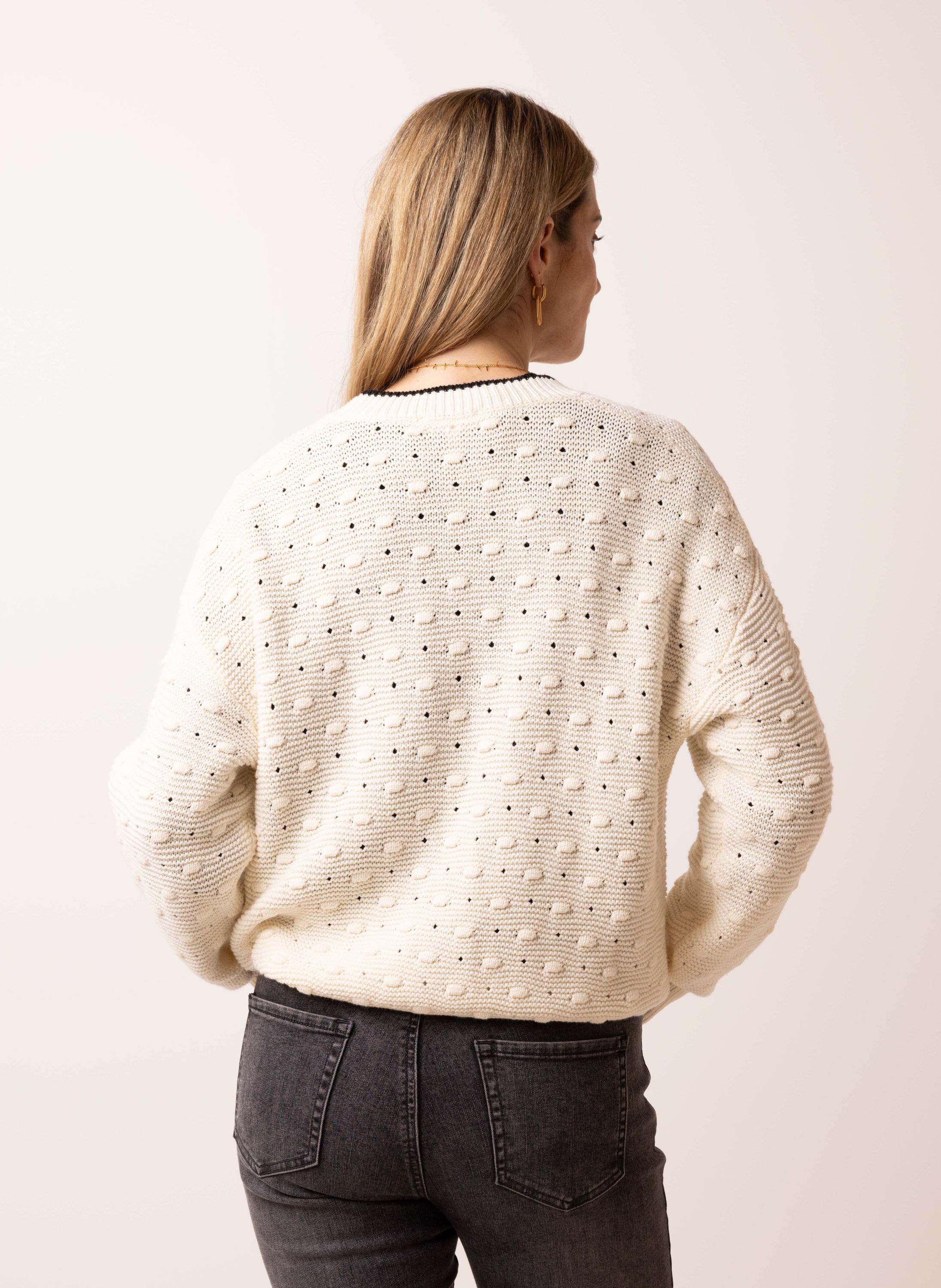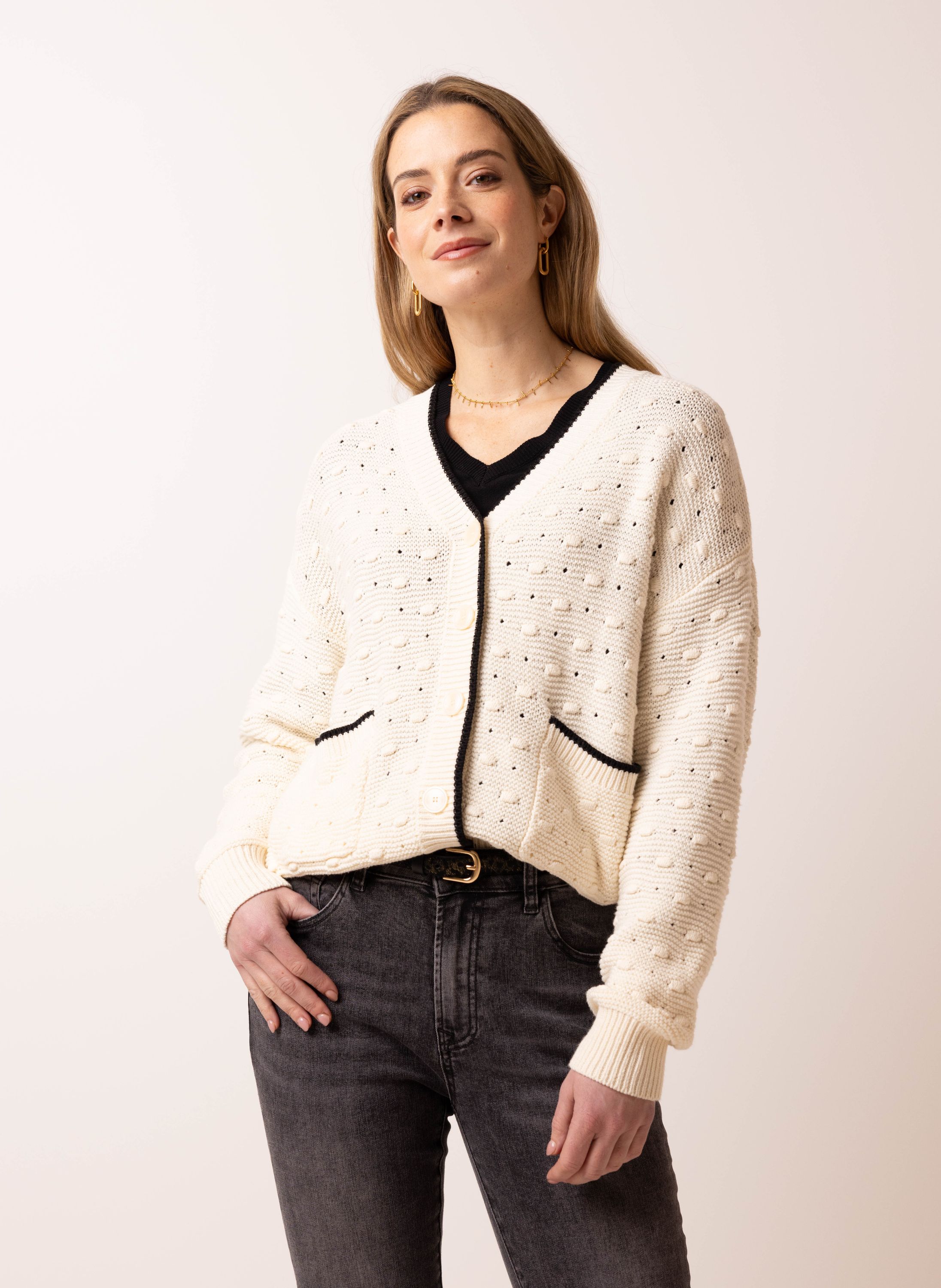 Dit gebreide vest met V-hals heeft lange mouwen, open zakken en een ingebreid structuurpatroon.