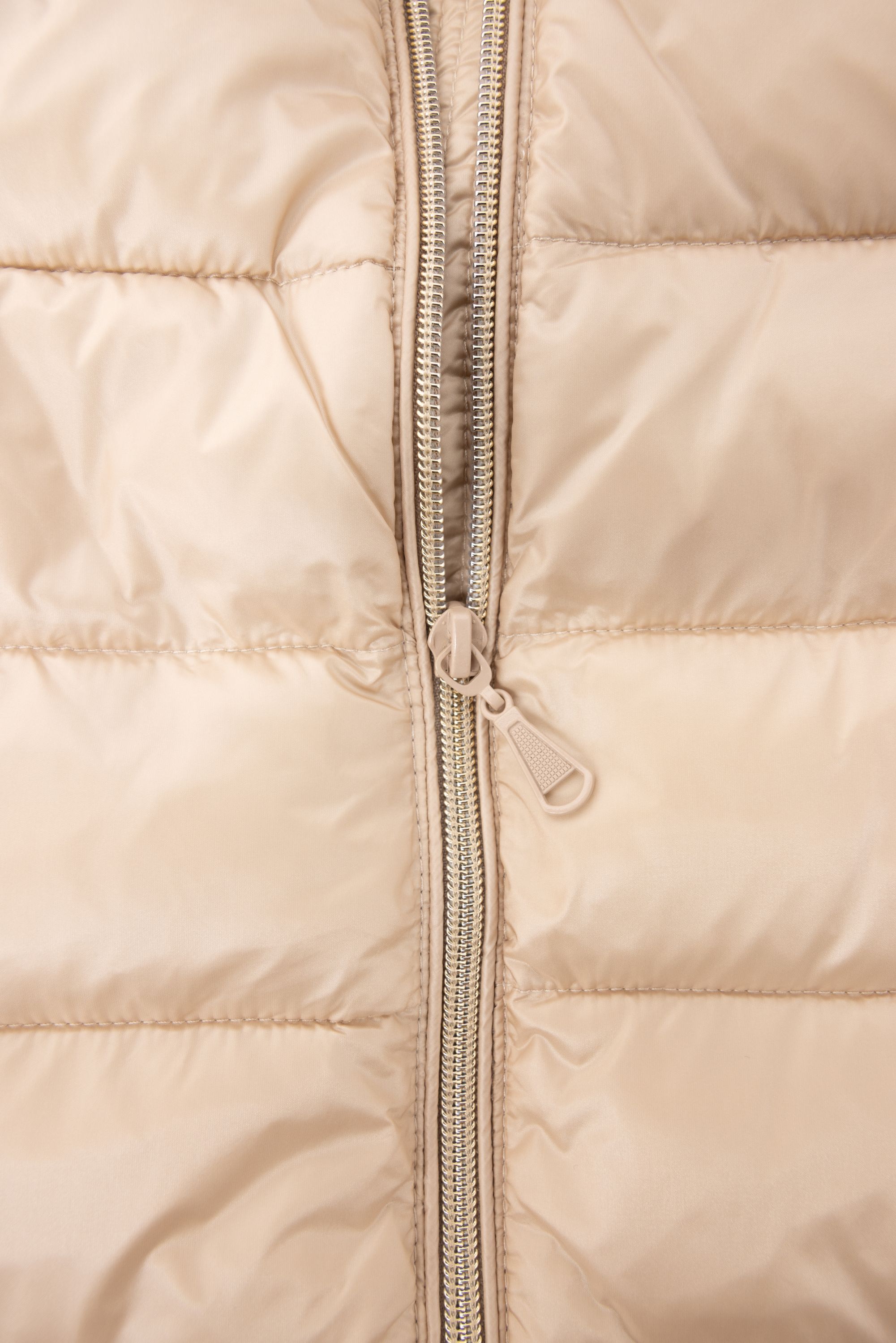 Deze gewatteerde jas met opstaande kraag heeft een goudkleurige ritssluiting, steekzakken met ritssluiting en lange mouwen.