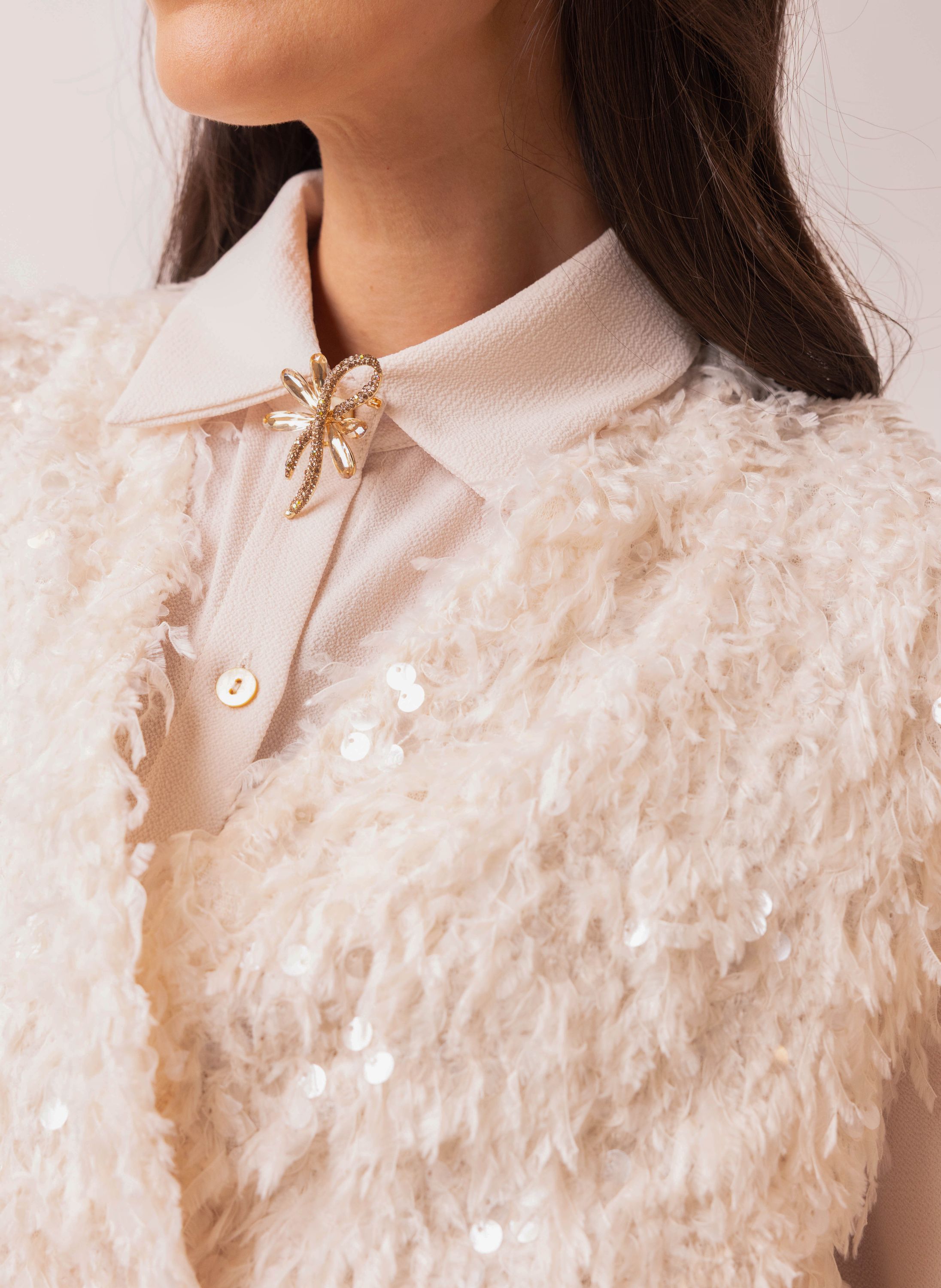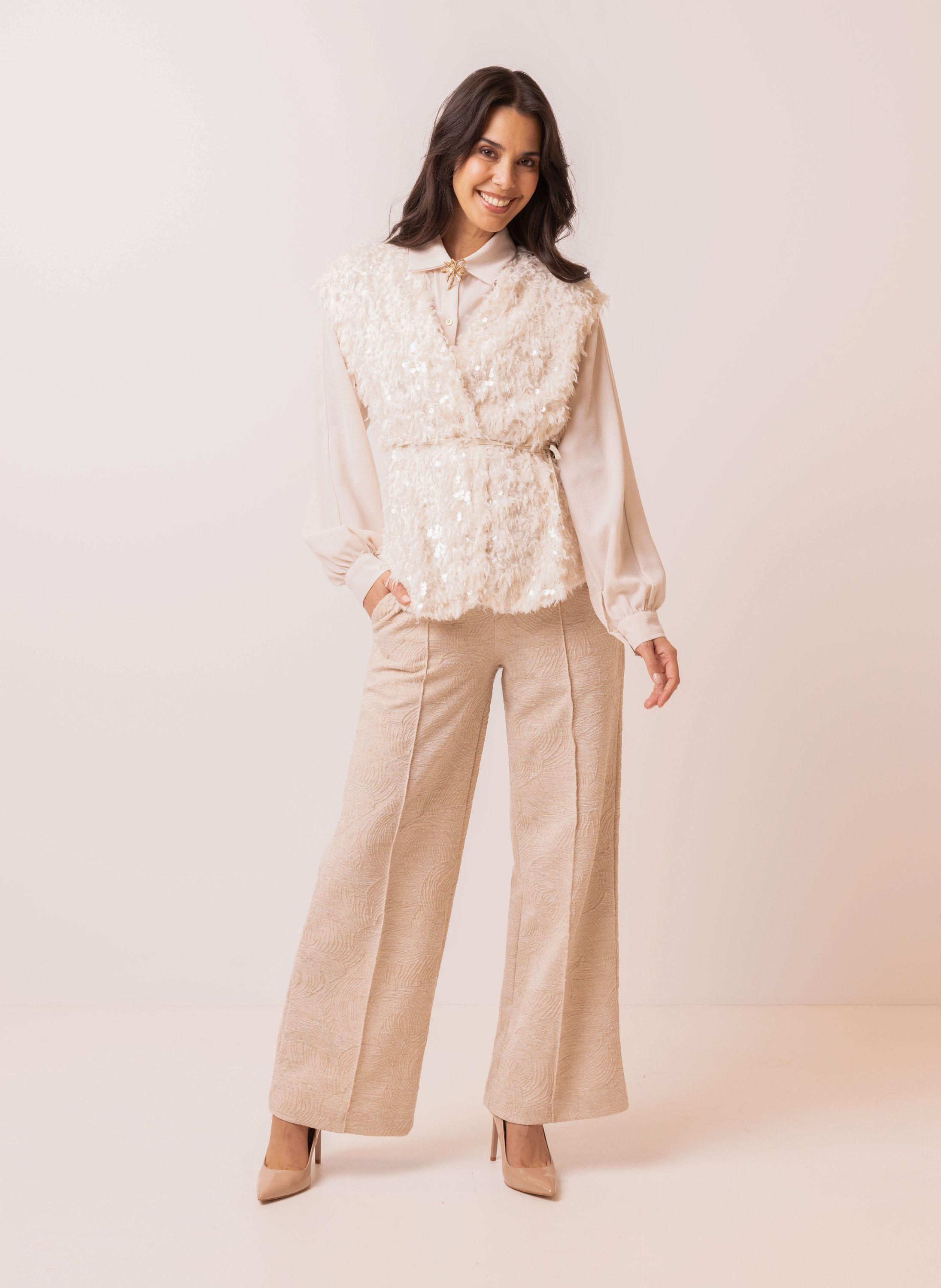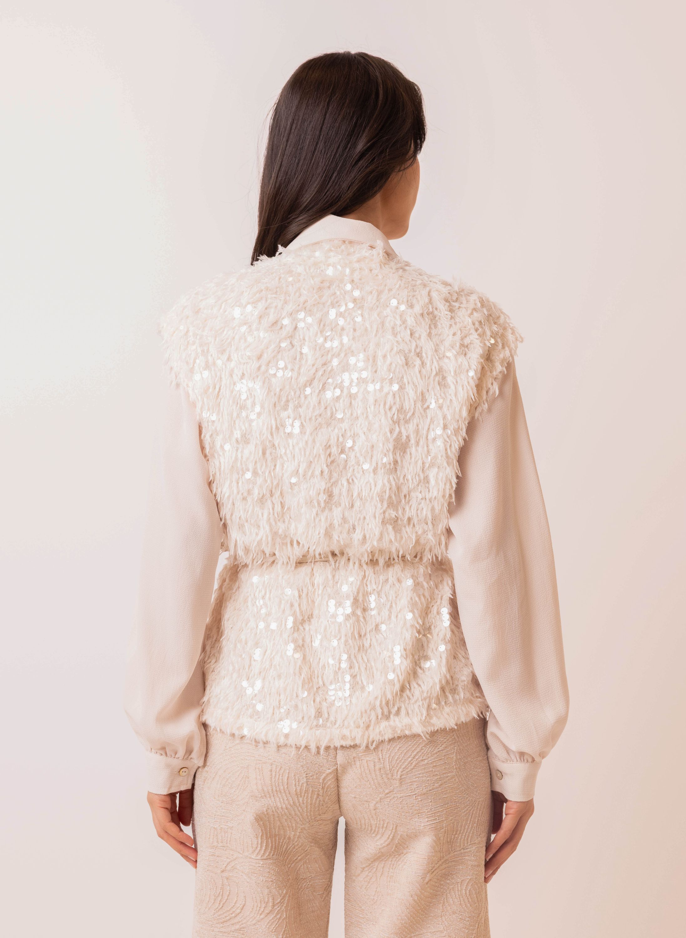 Ecru gilet met imitatieveren en pailletten