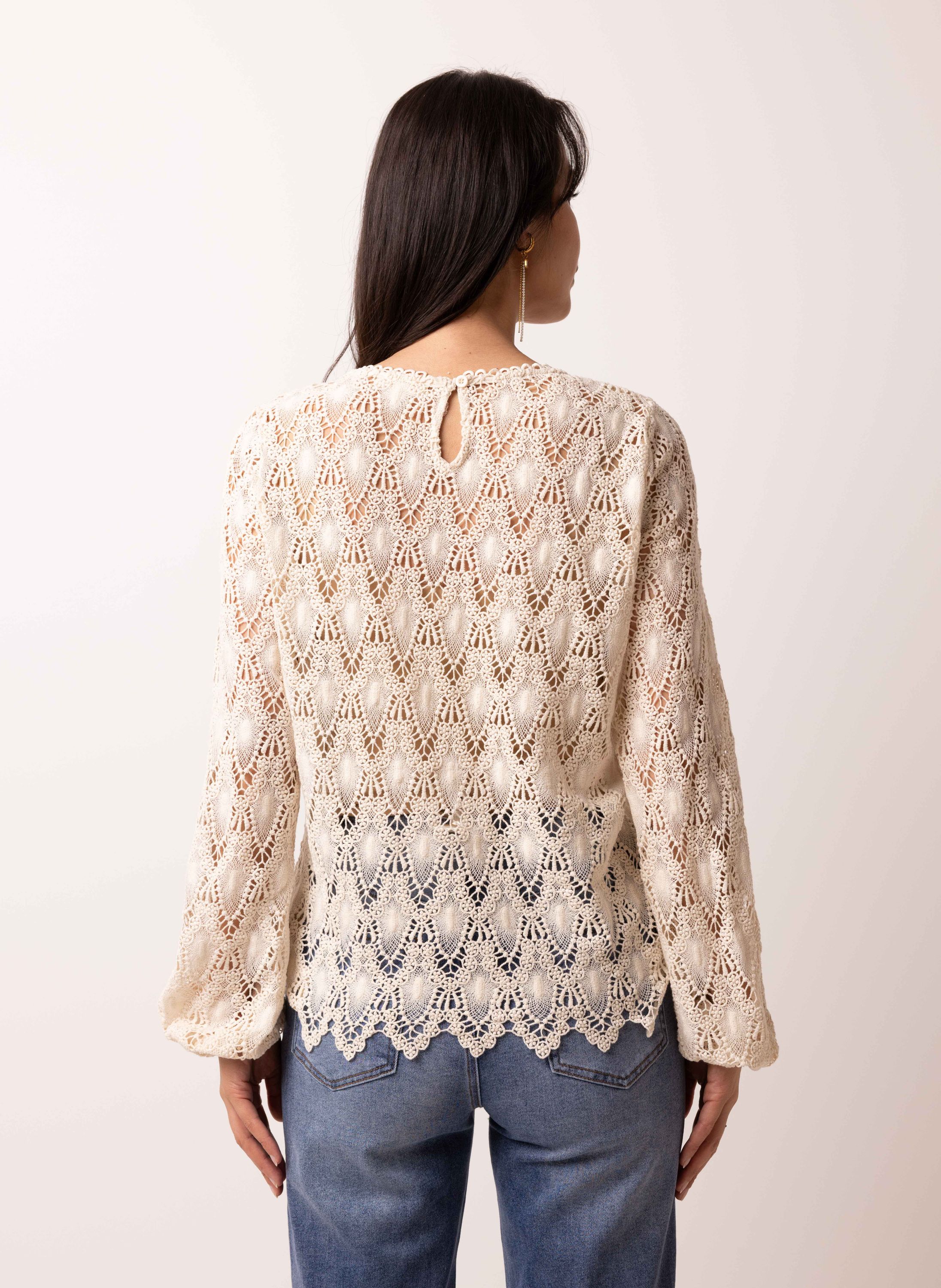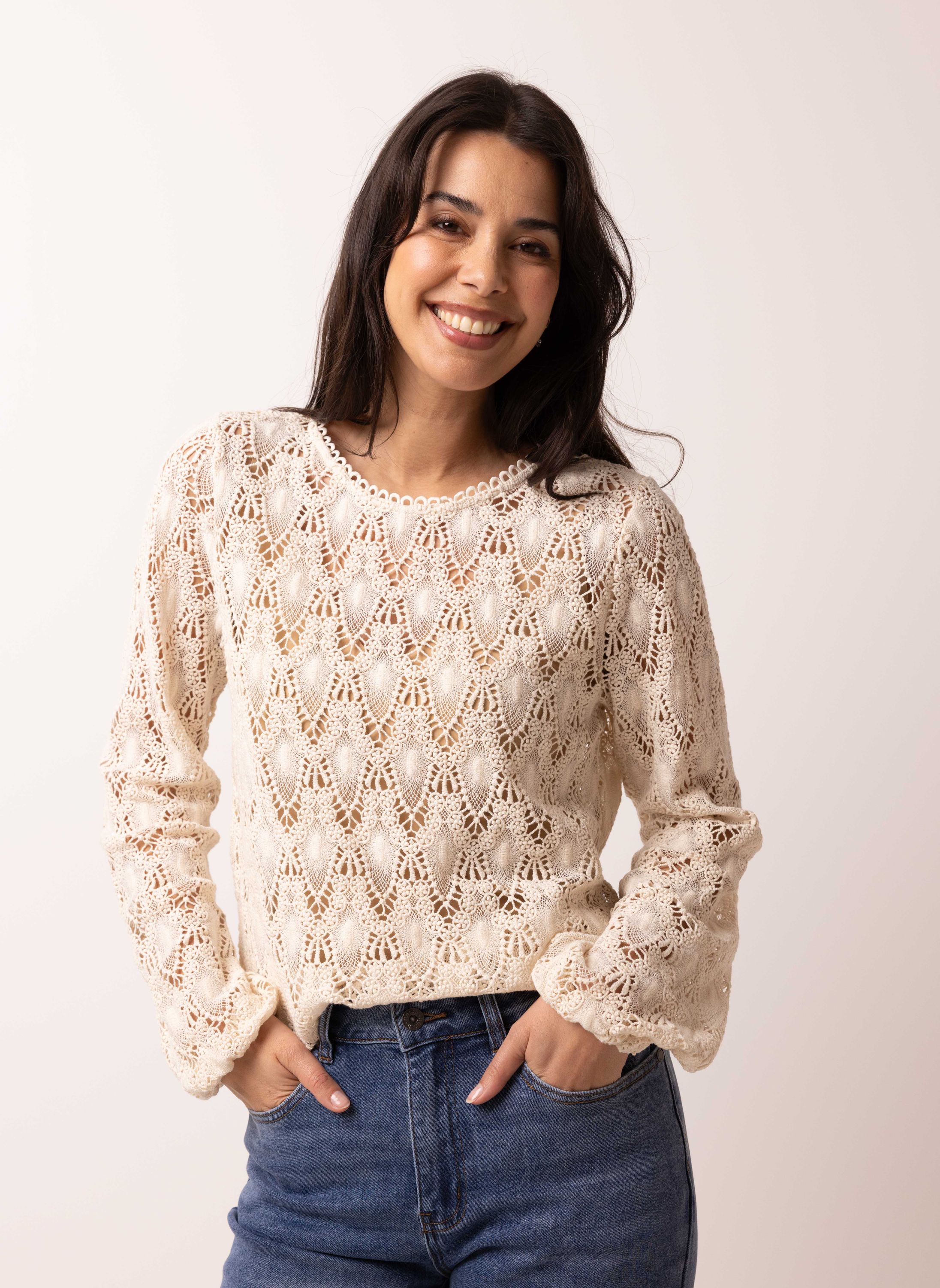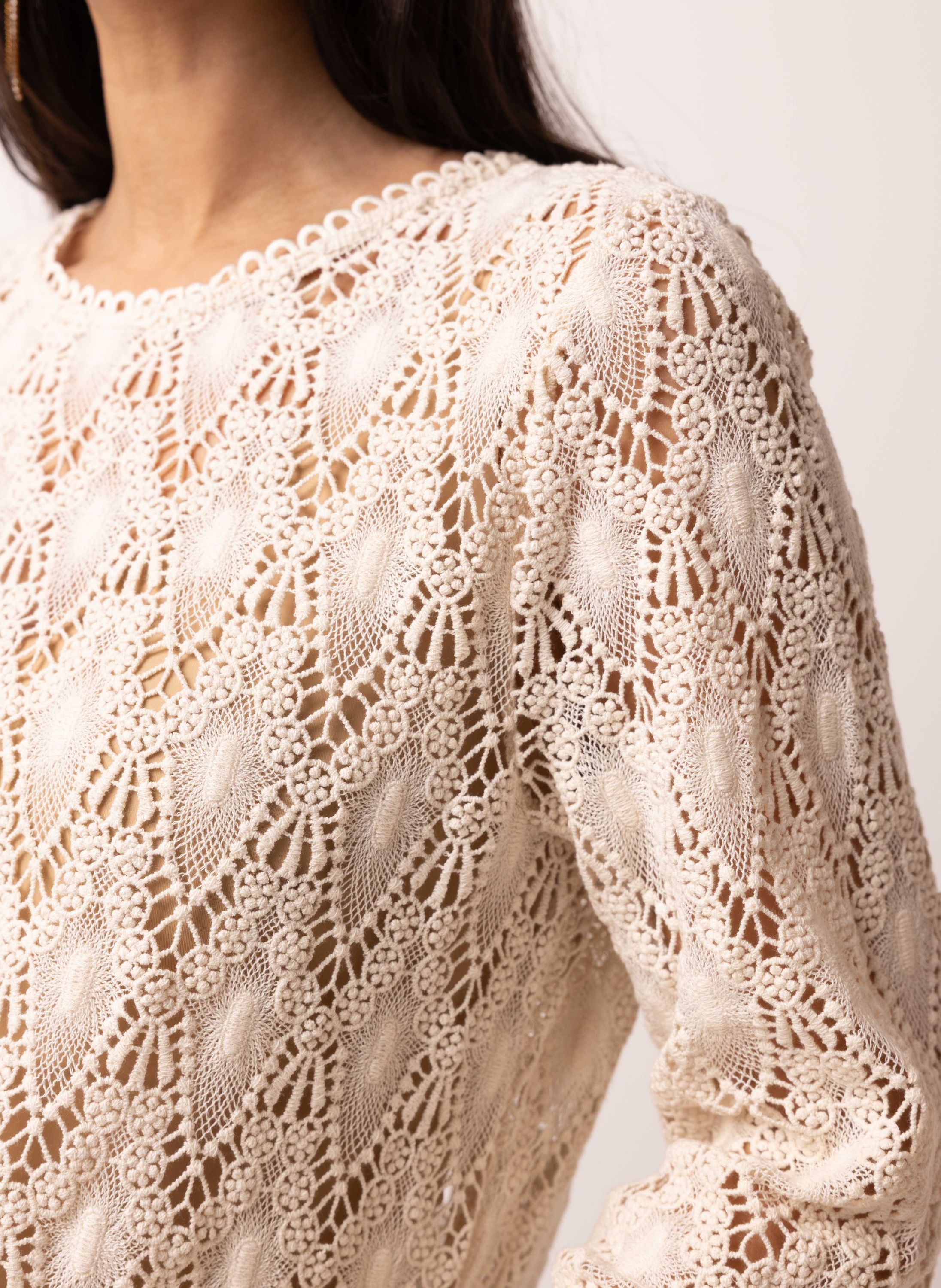 Deze kanten top met ronde hals heeft lange mouwen met een elastische band aan de onderzijde en een knoopsluiting in de nek. De top schijnt door. We adviseren je er een Marianne top onder te dragen.
