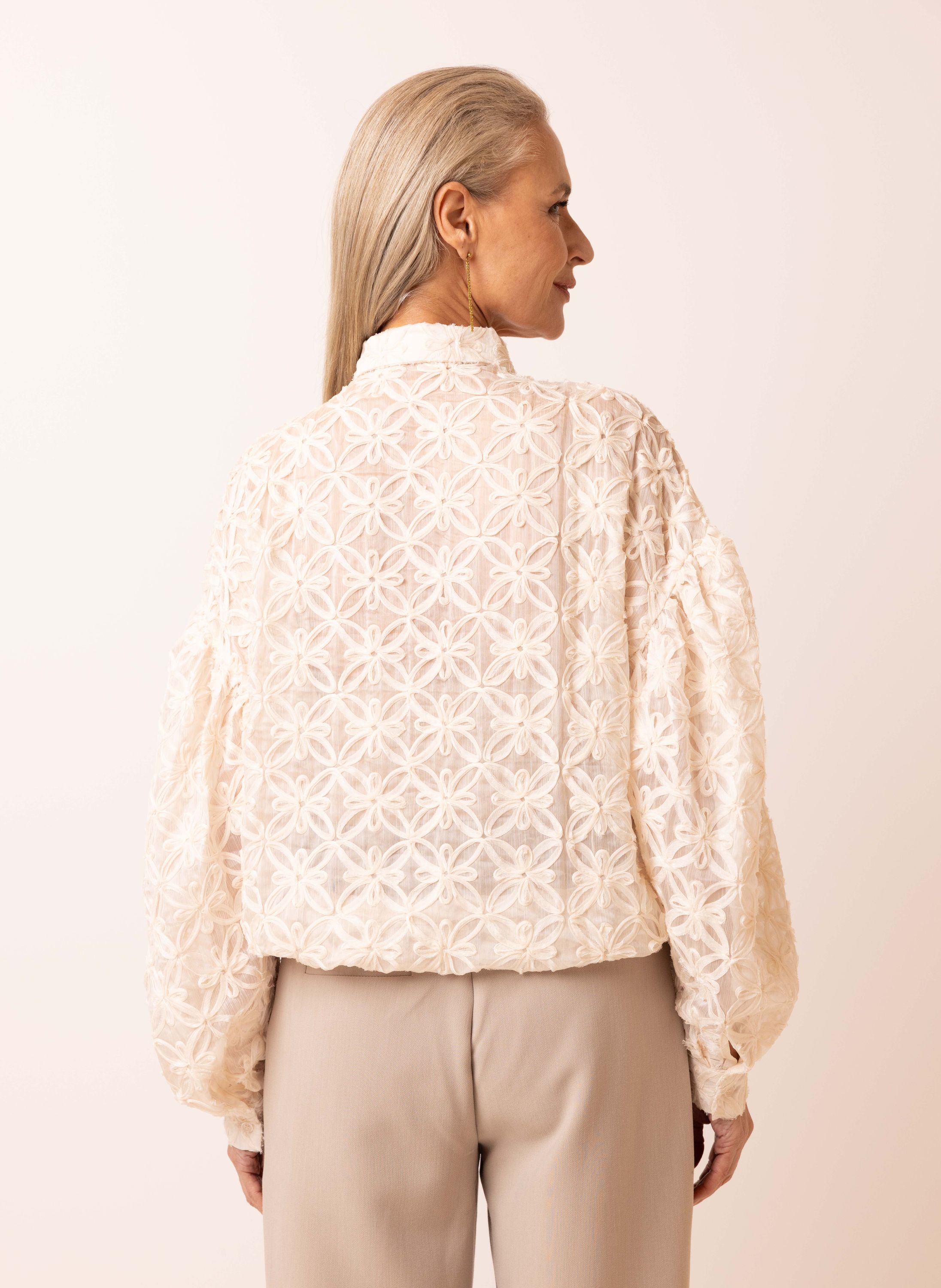 Deze blouse met klassieke kraag, knoopsluiting, lange pofmouwen en trekkoord aan de onderzijde is licht doorschijnend. We adviseren je er een Marianne top onder te dragen.