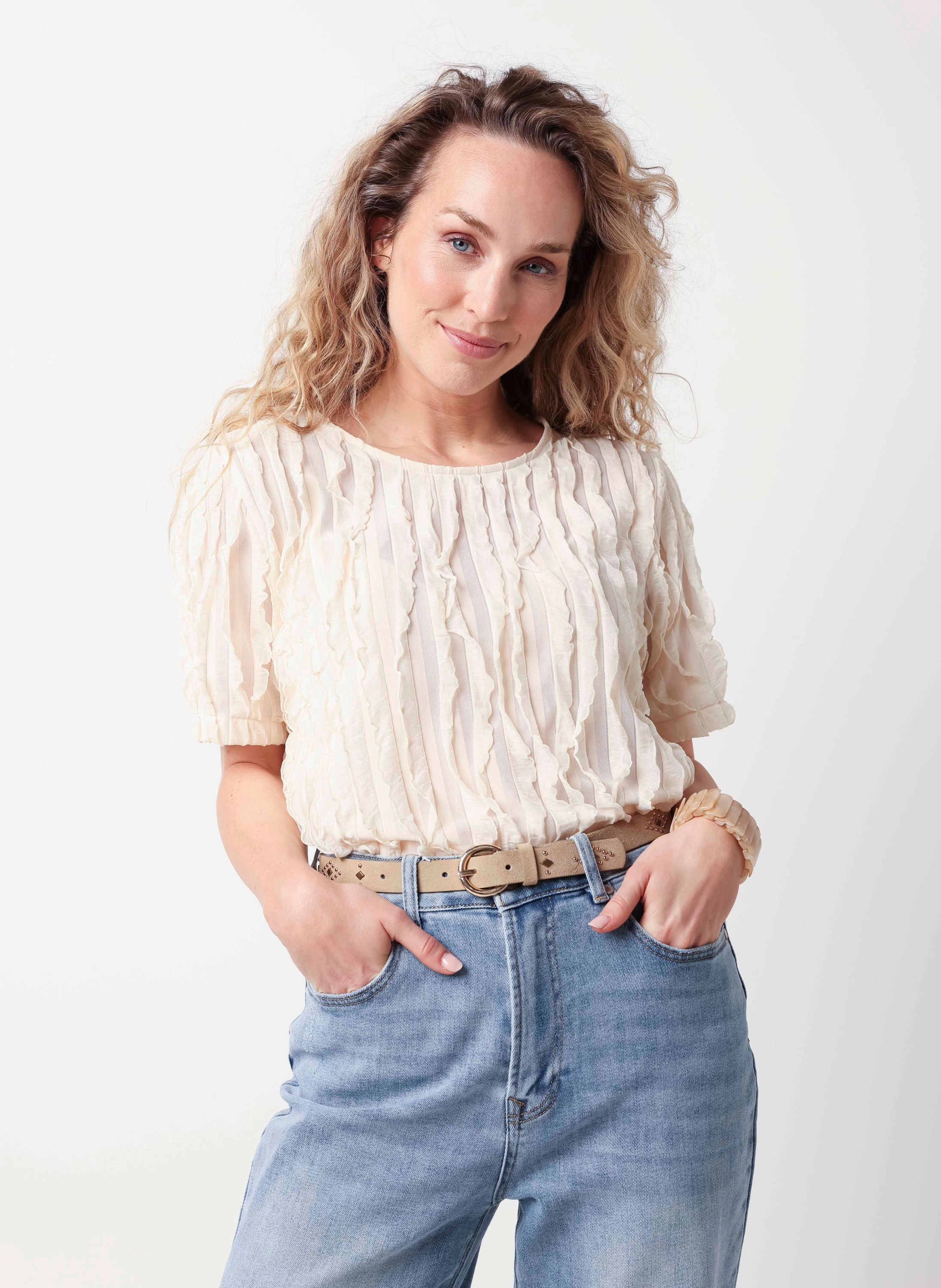 Dit shirt met ronde hals en korte mouwen heeft ruches in de vorm van strepen. Dit shirt schijnt licht door. We adviseren je er een Marianne top onder te dragen.