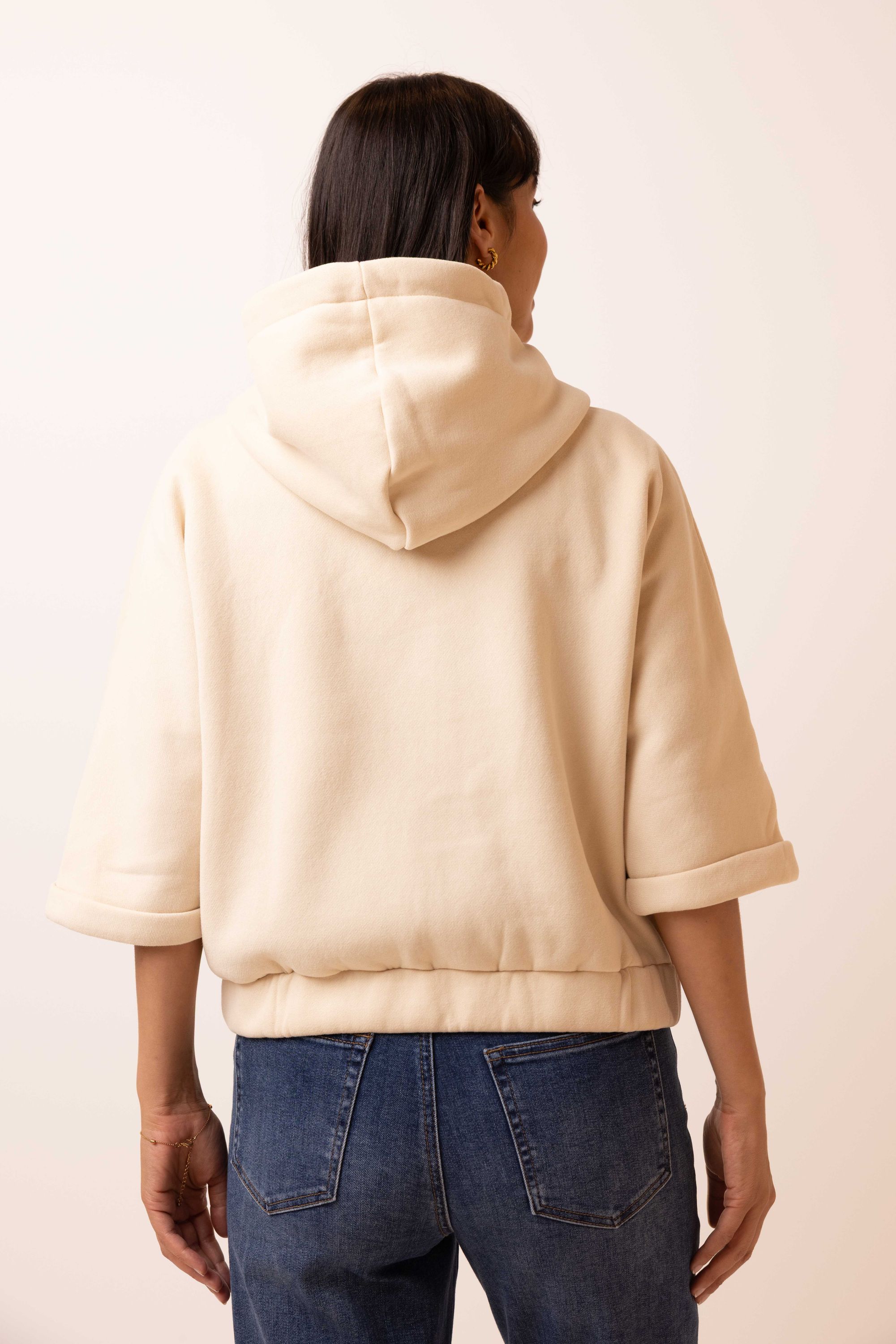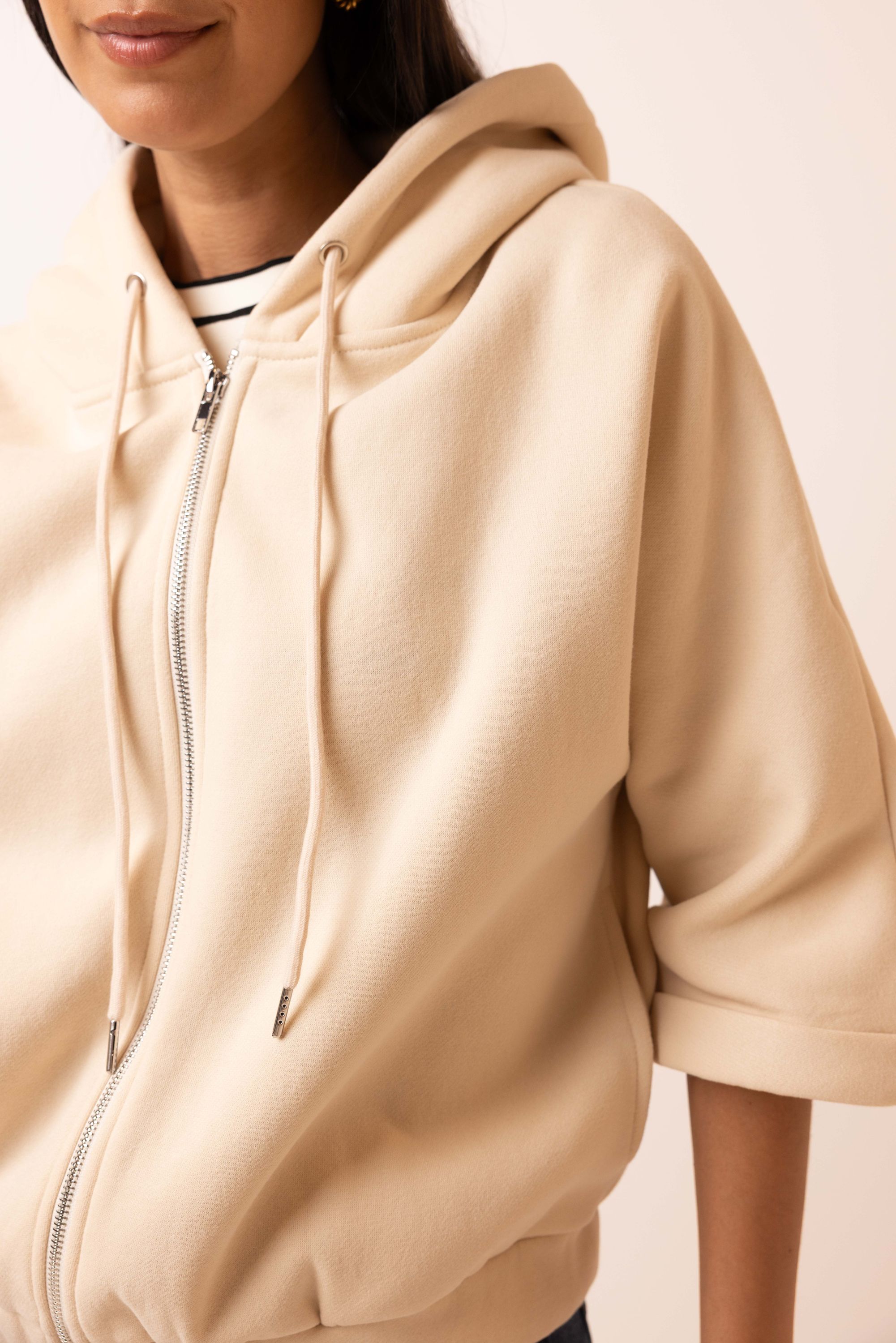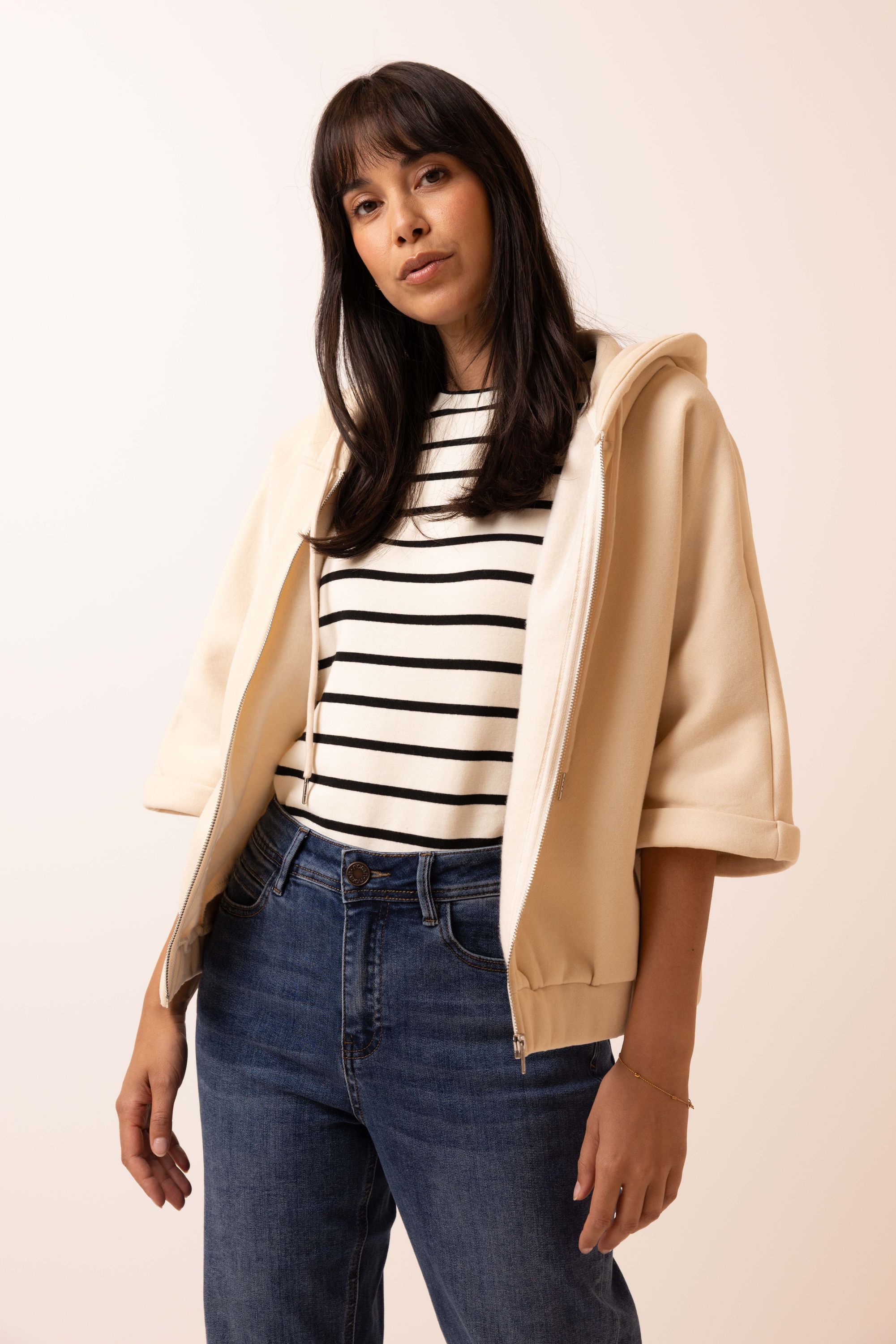 Dit vest met capuchon heeft een ritssluiting, steekzakken en driekwart aangeknipte mouwen.