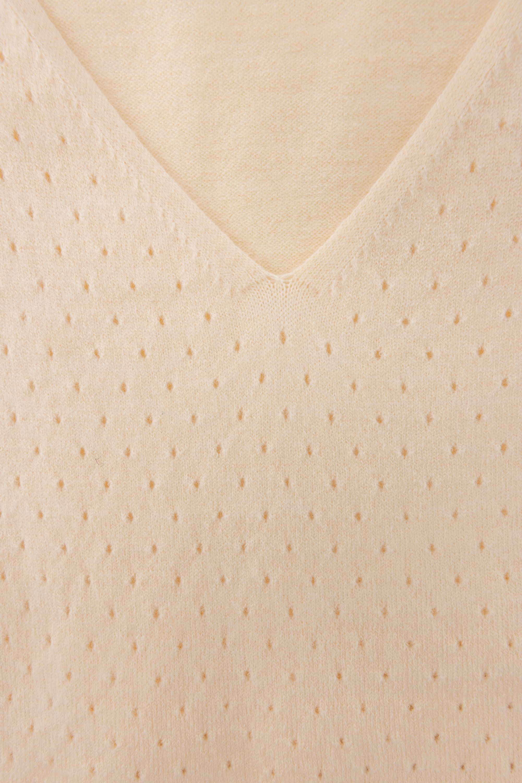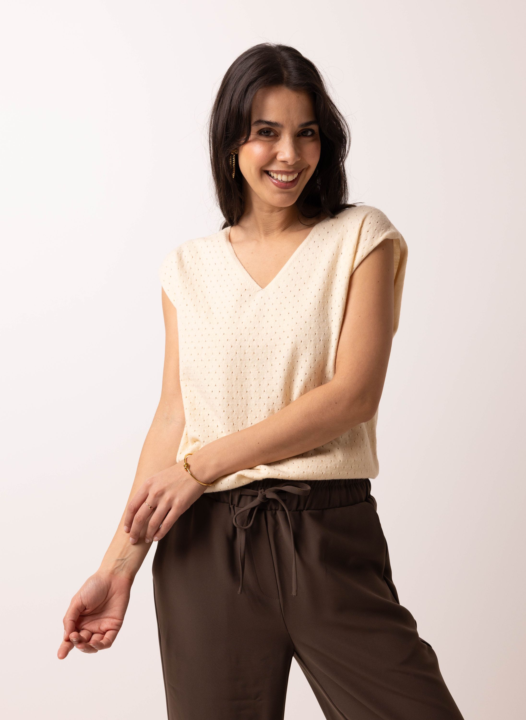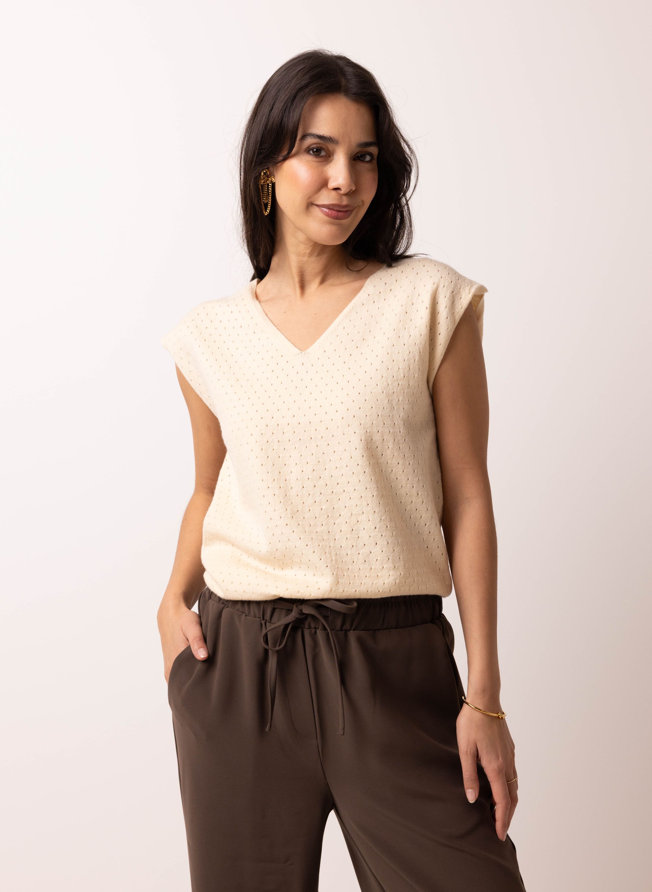 Deze ecru gebreide top met V-hals heeft een ingebreid structuurpatroon en korte mouwen.
