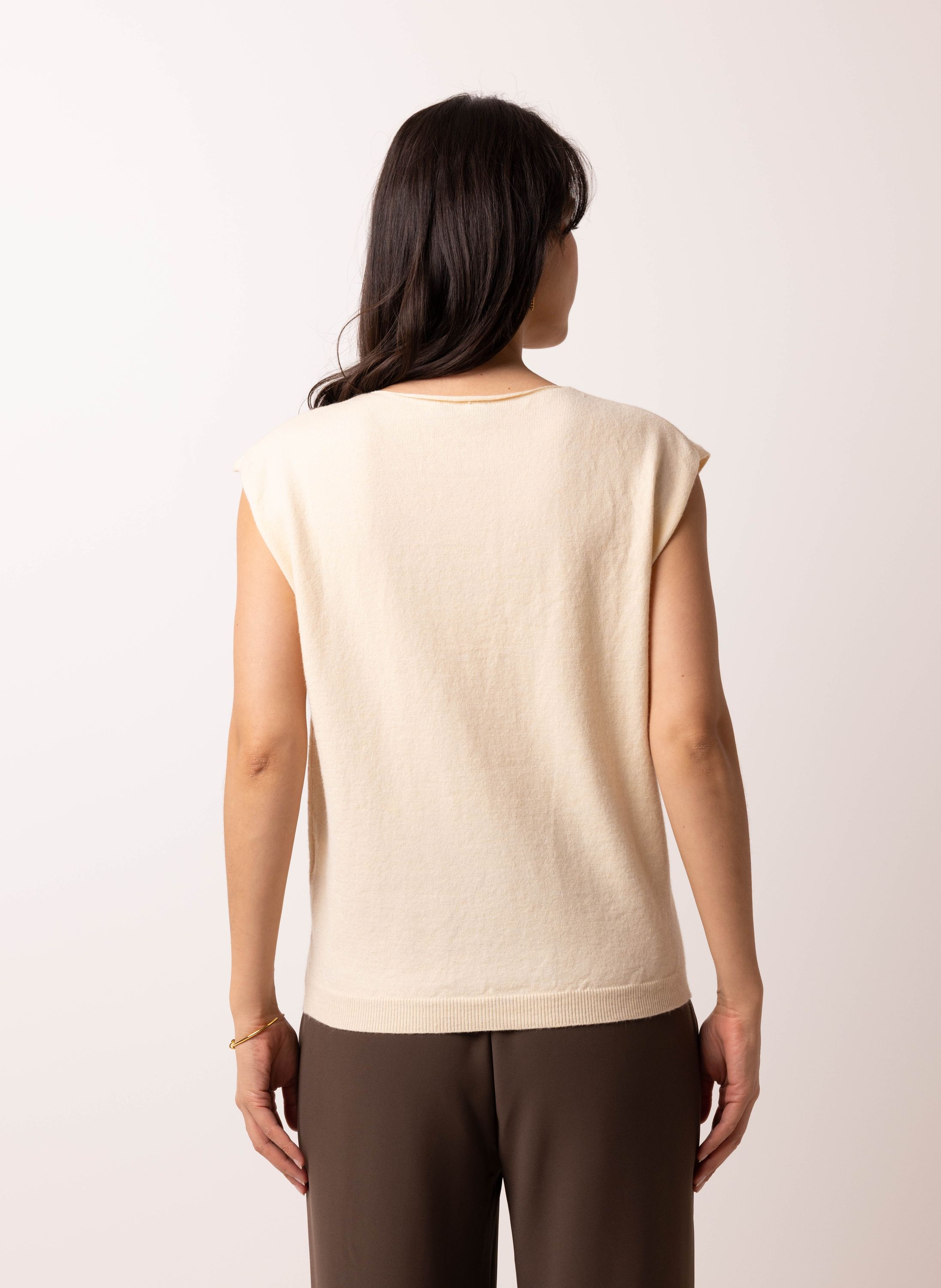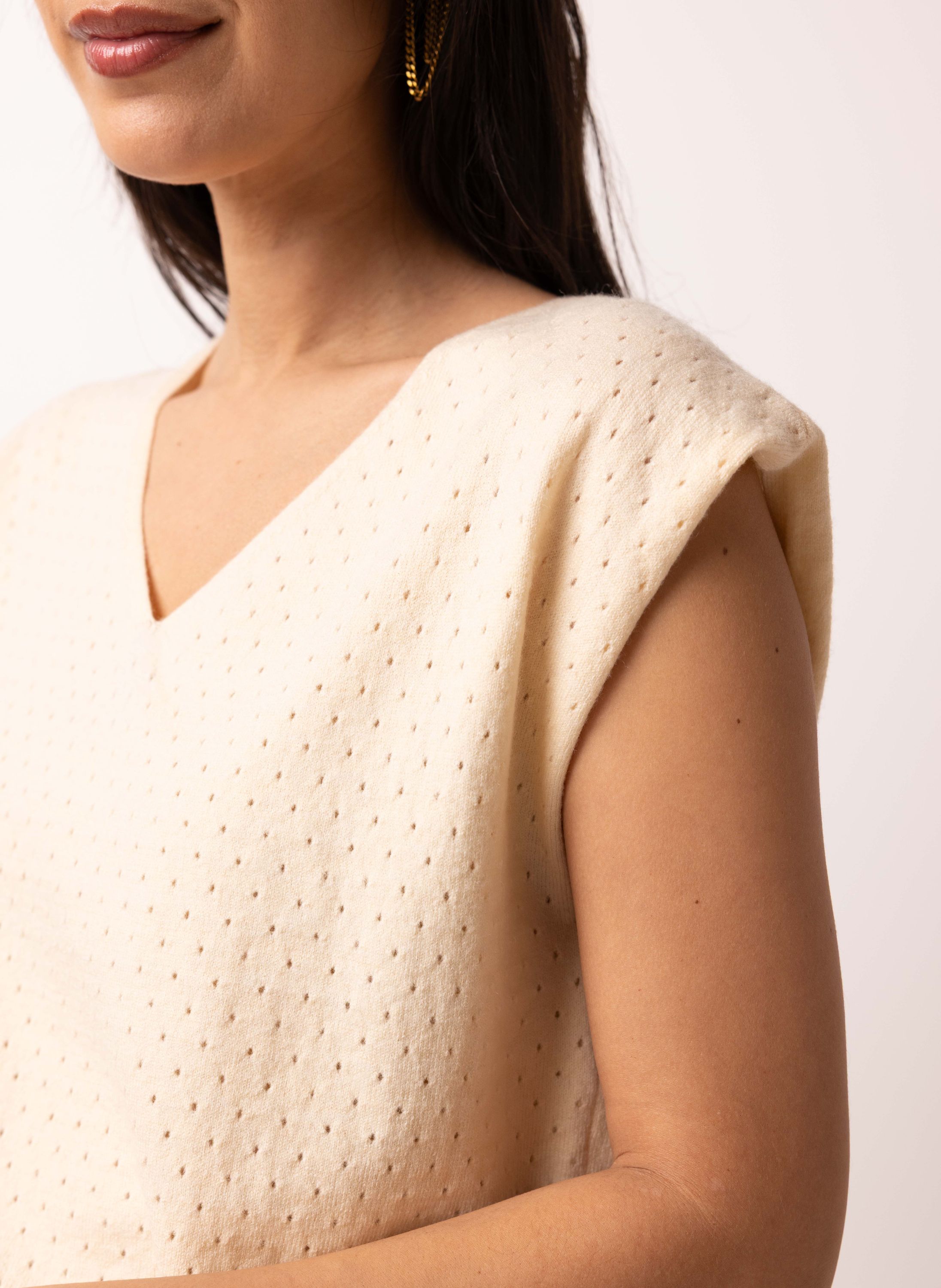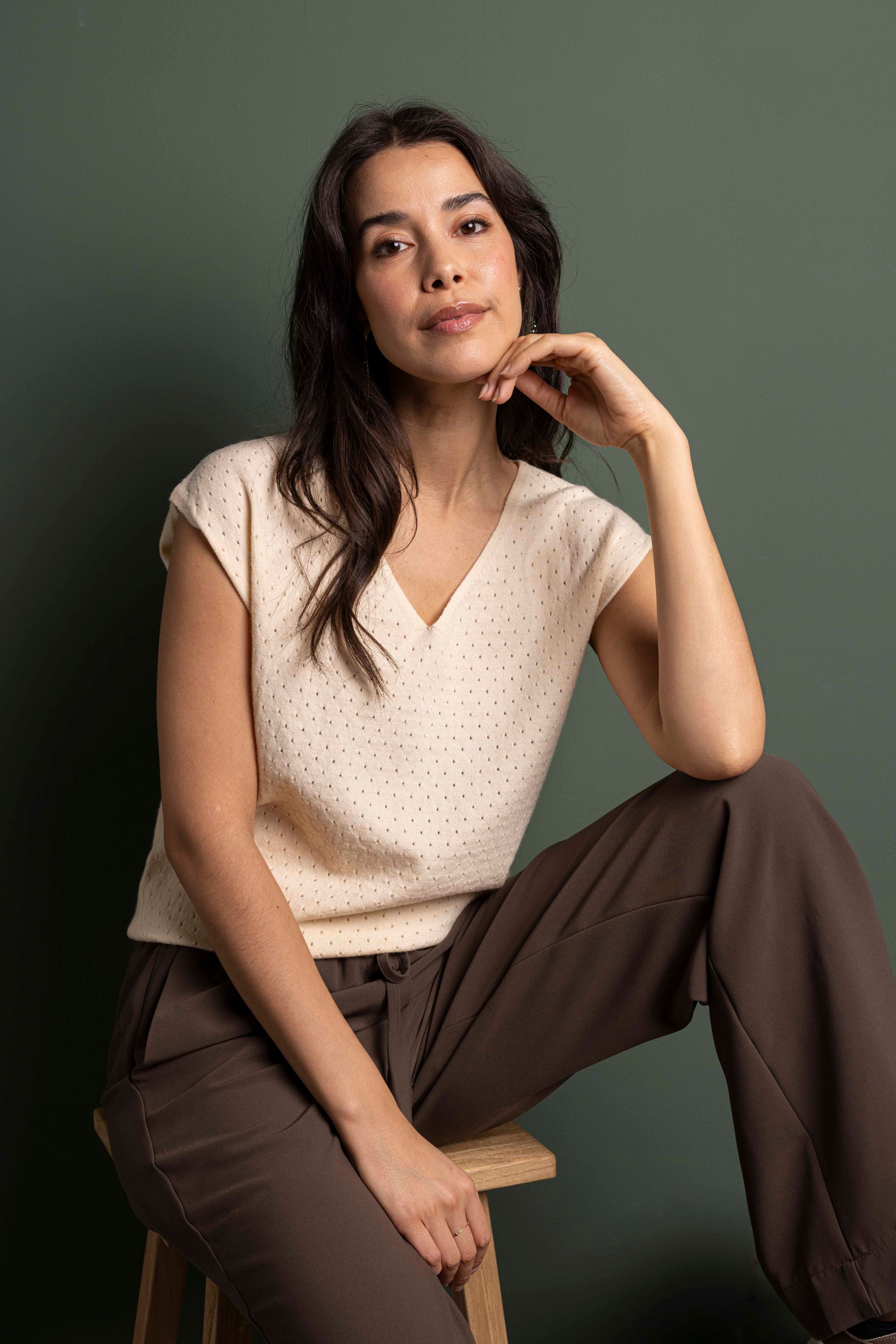 Deze ecru gebreide top met V-hals heeft een ingebreid structuurpatroon en korte mouwen.