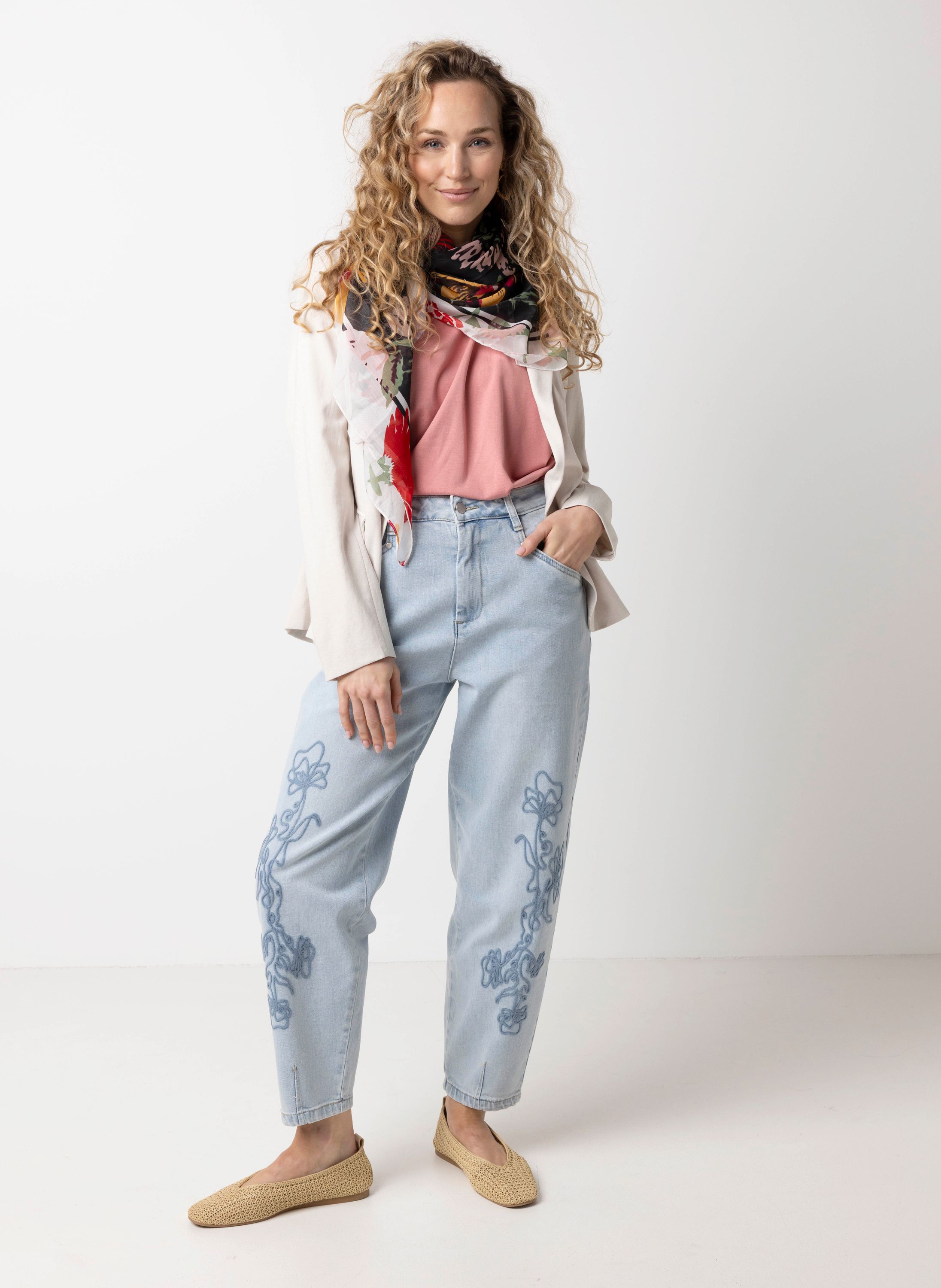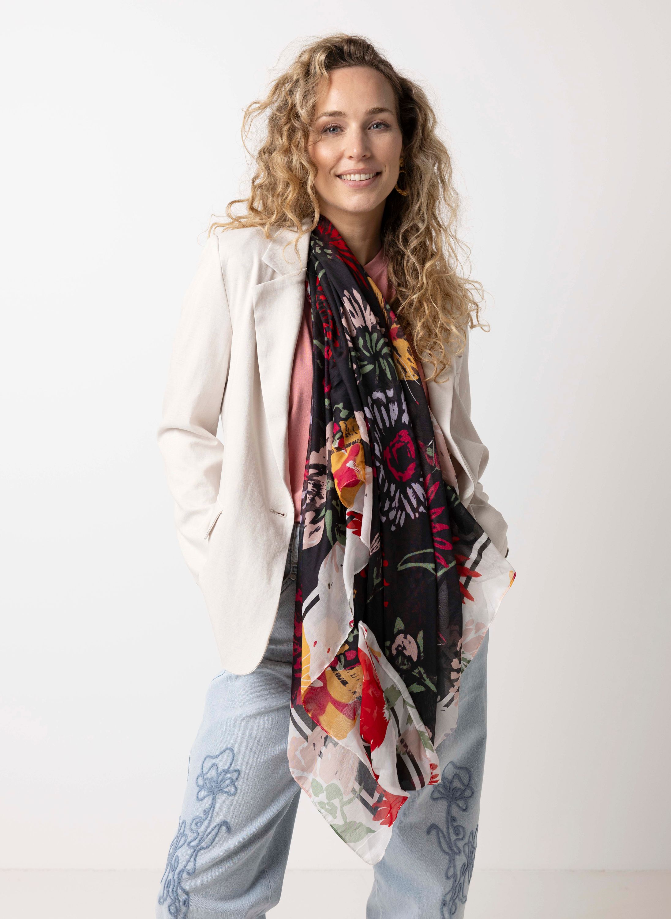 Deze fijngeweven sjaal met bloemenprint geeft je look een speels accent.