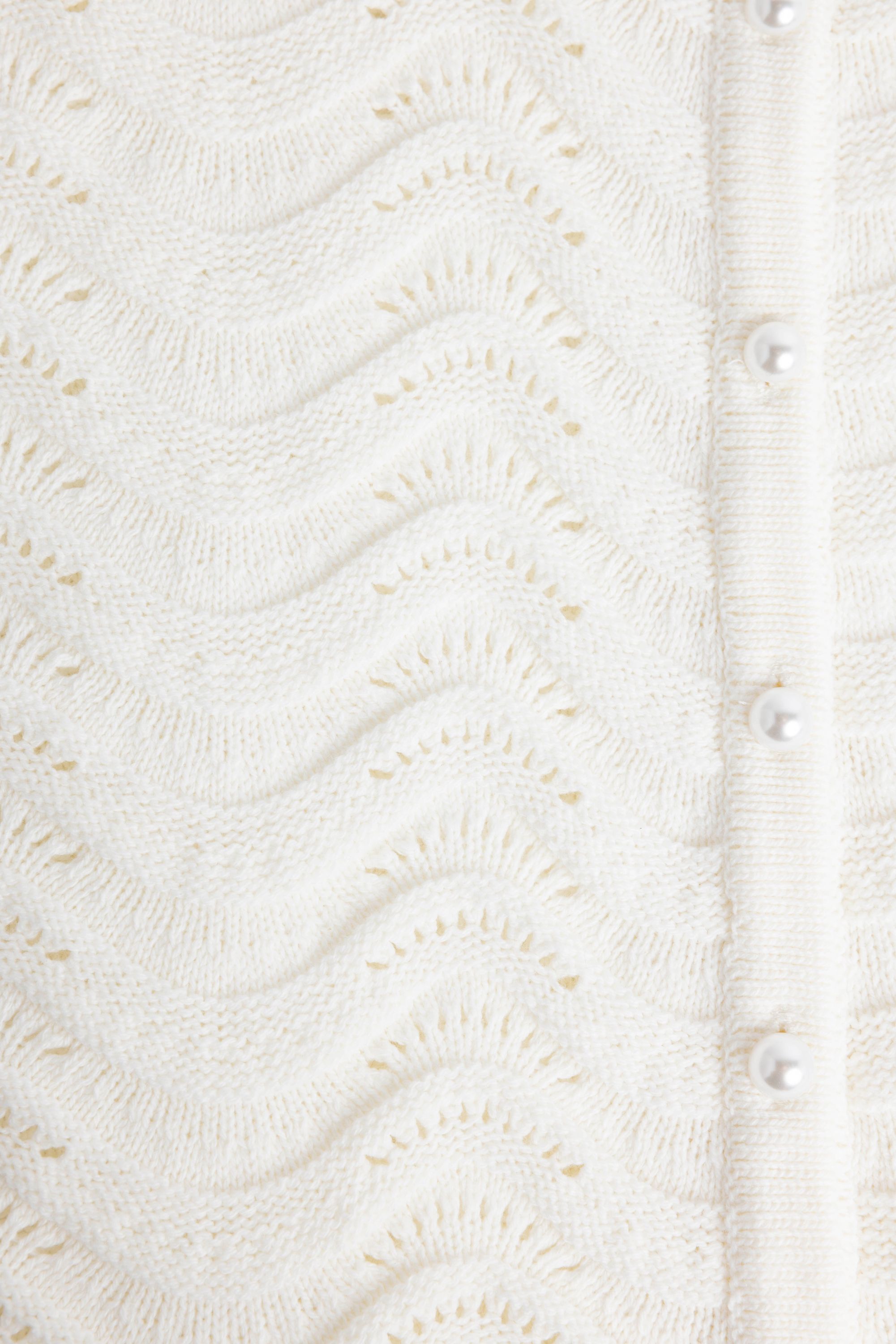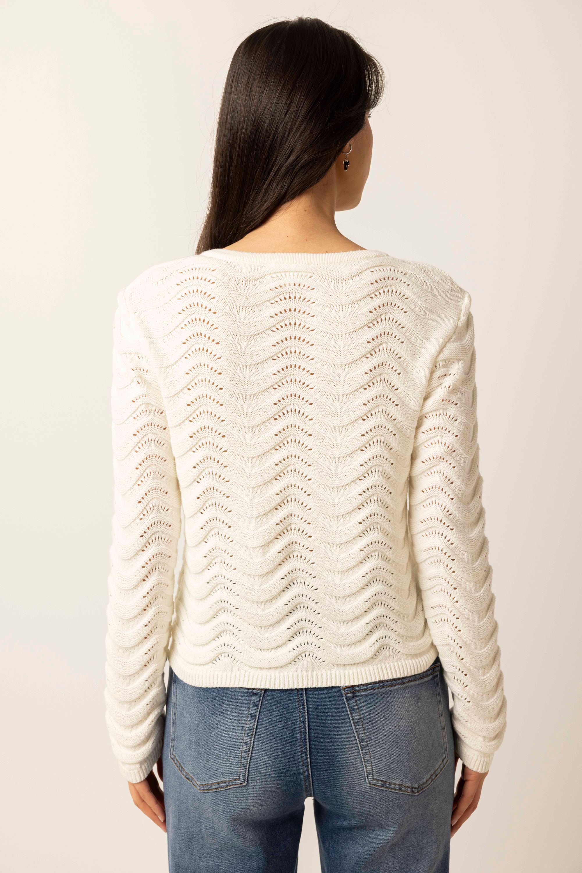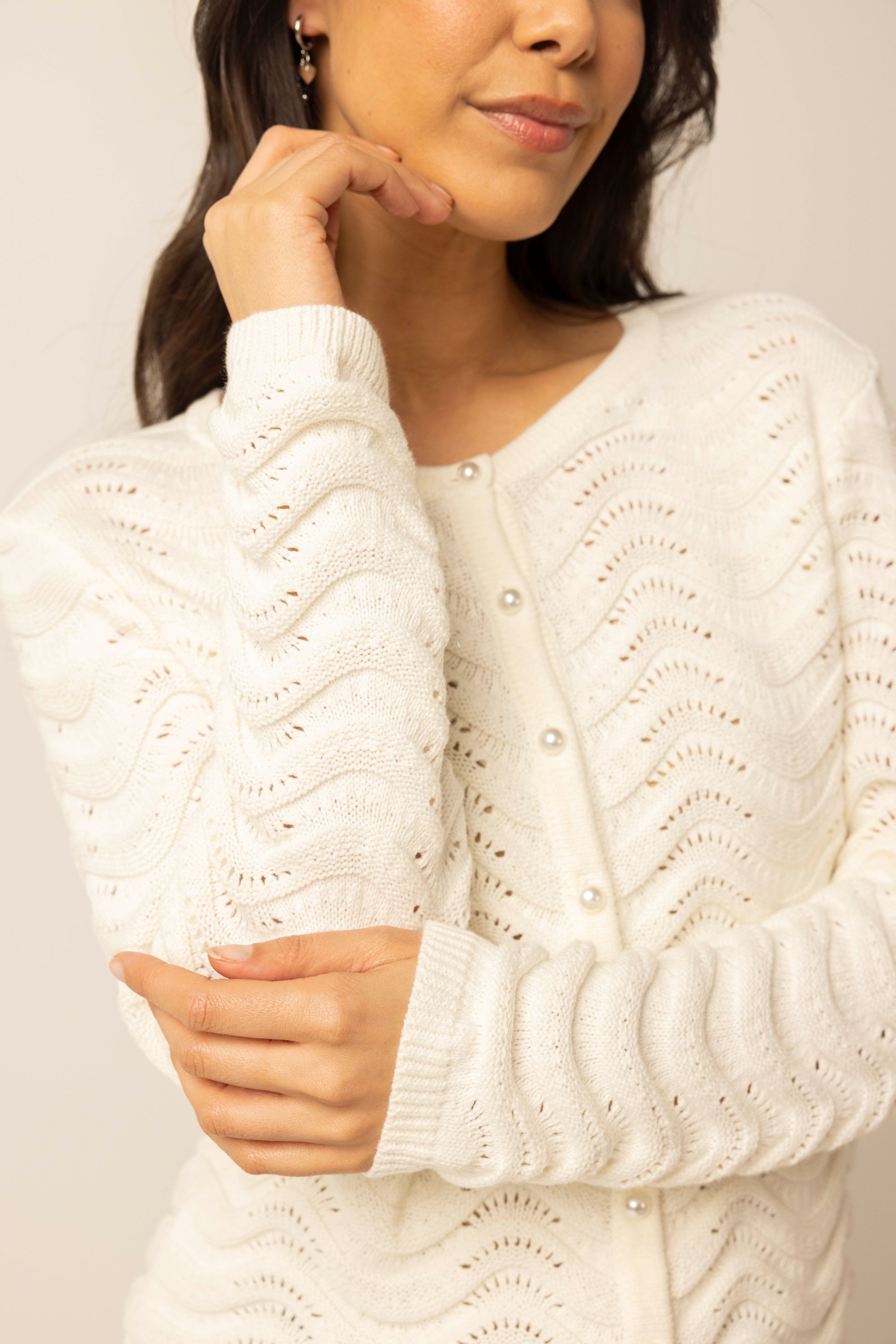 Dit vest met ronde hals, lange mouwen en knoopsluiting met imitatieparels geeft je look een elegant accent.