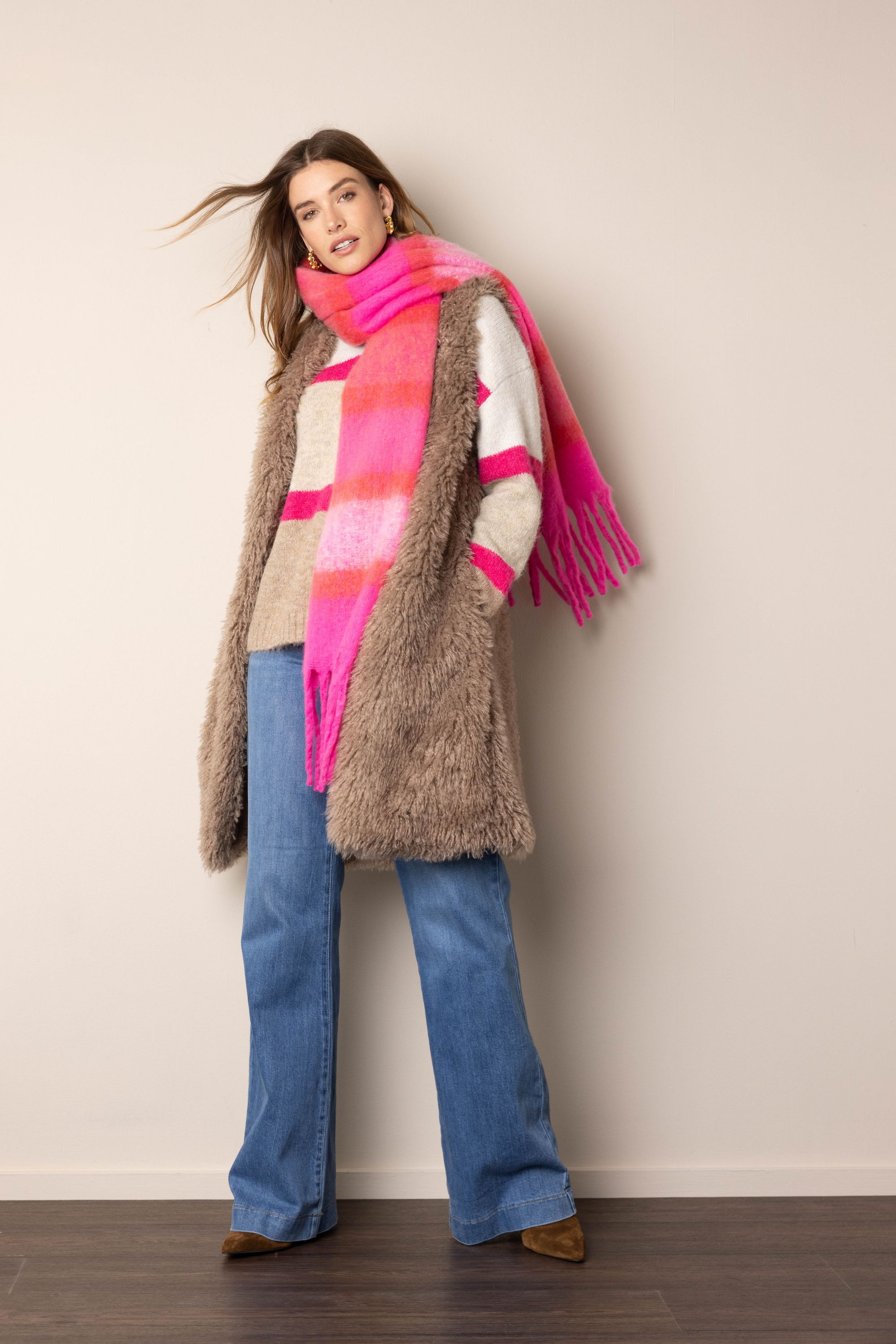 Deze gebreide sjaal met franjes is een warm en stijlvol laagje voor het najaar.