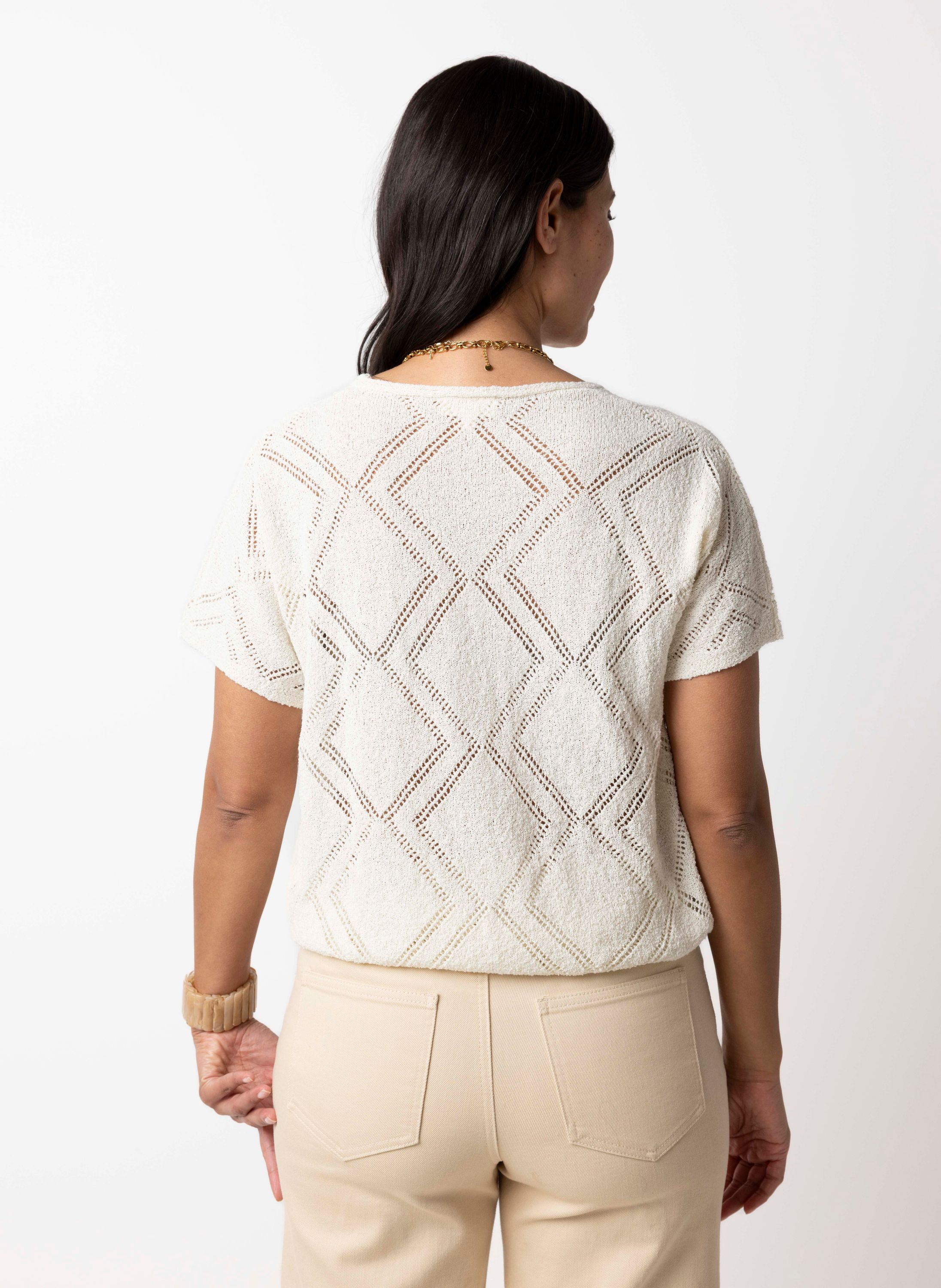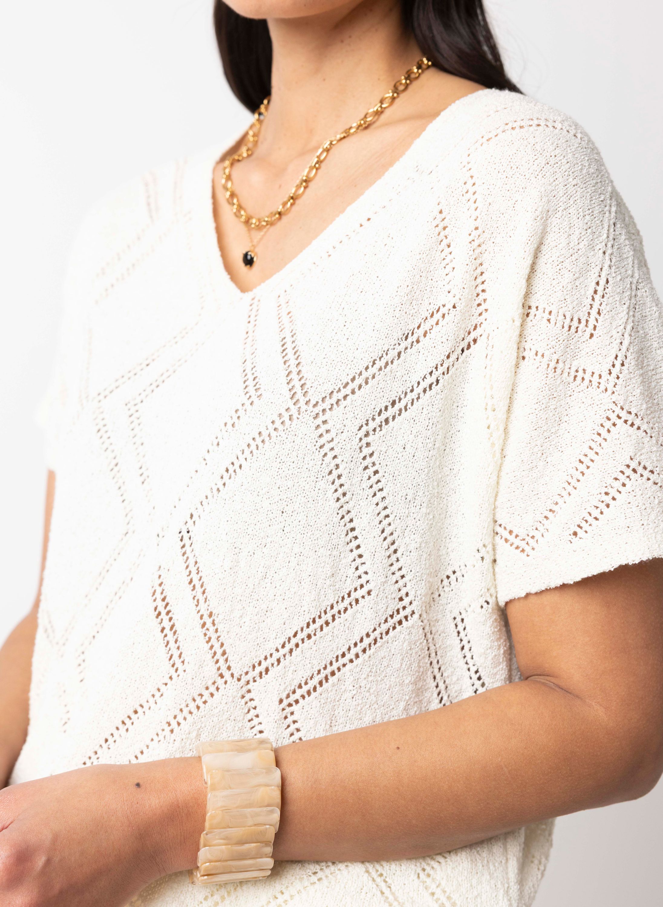 Deze gebreide trui met V-hals en korte mouwen heeft een comfortabele pasvorm.