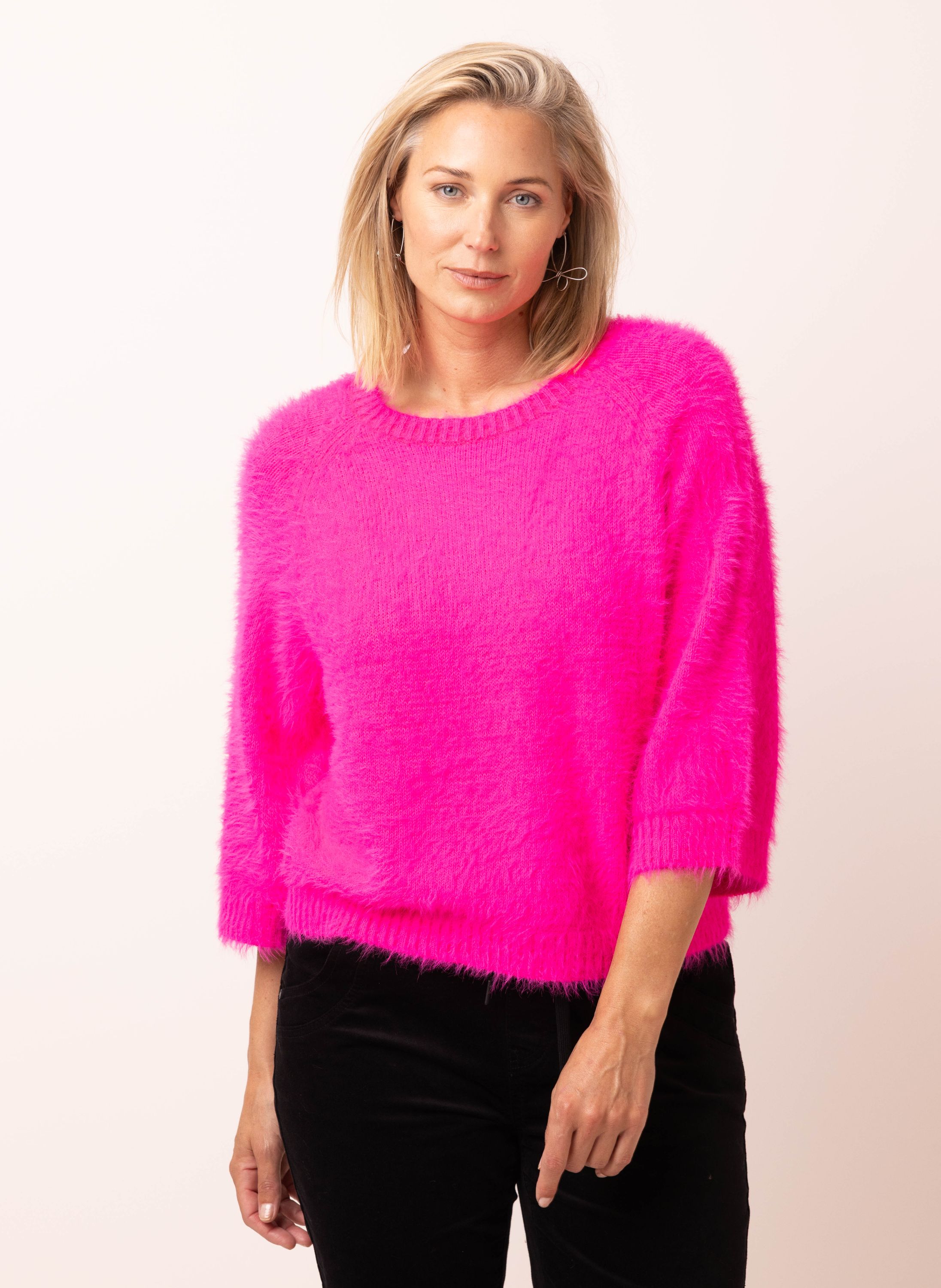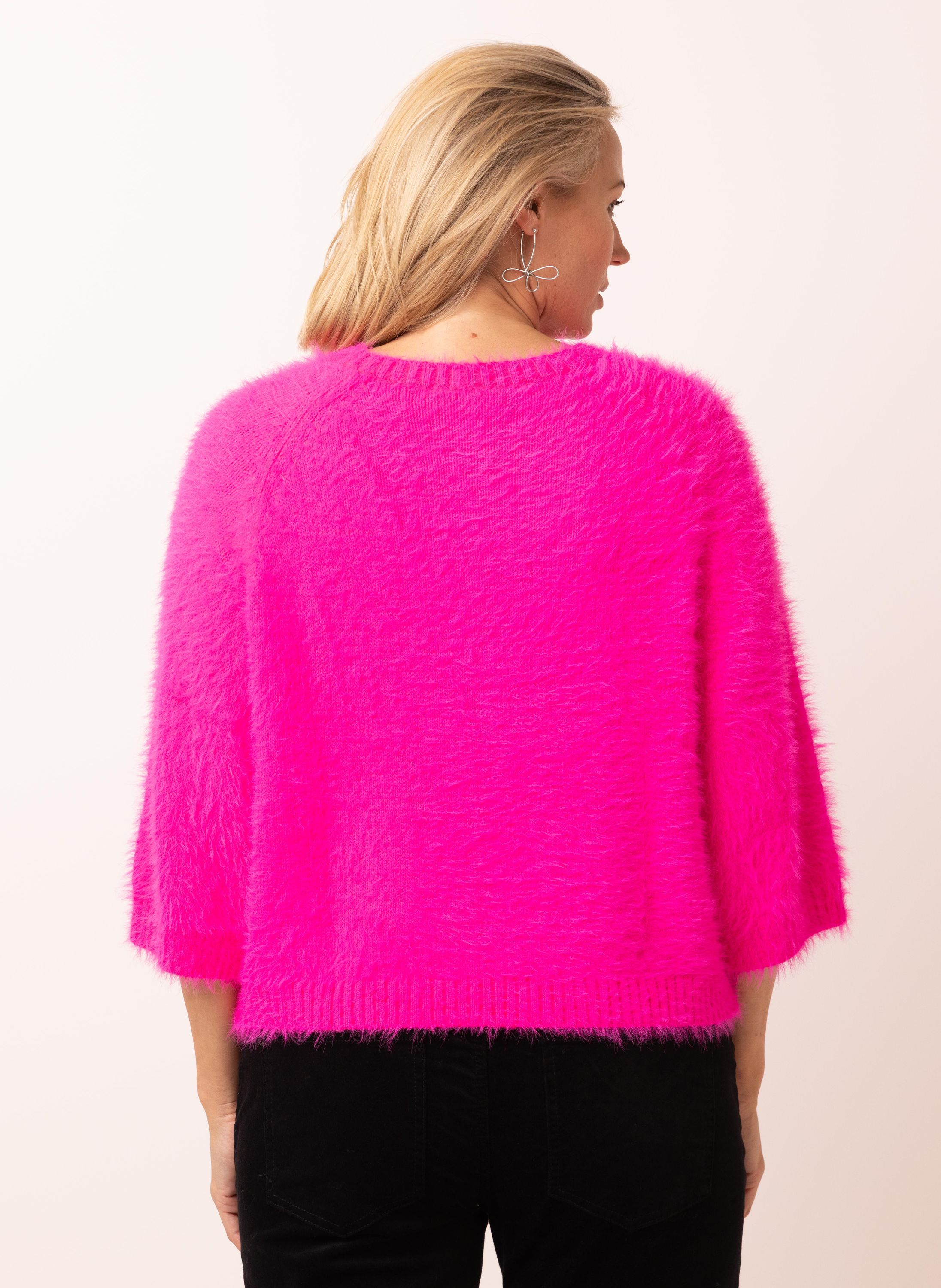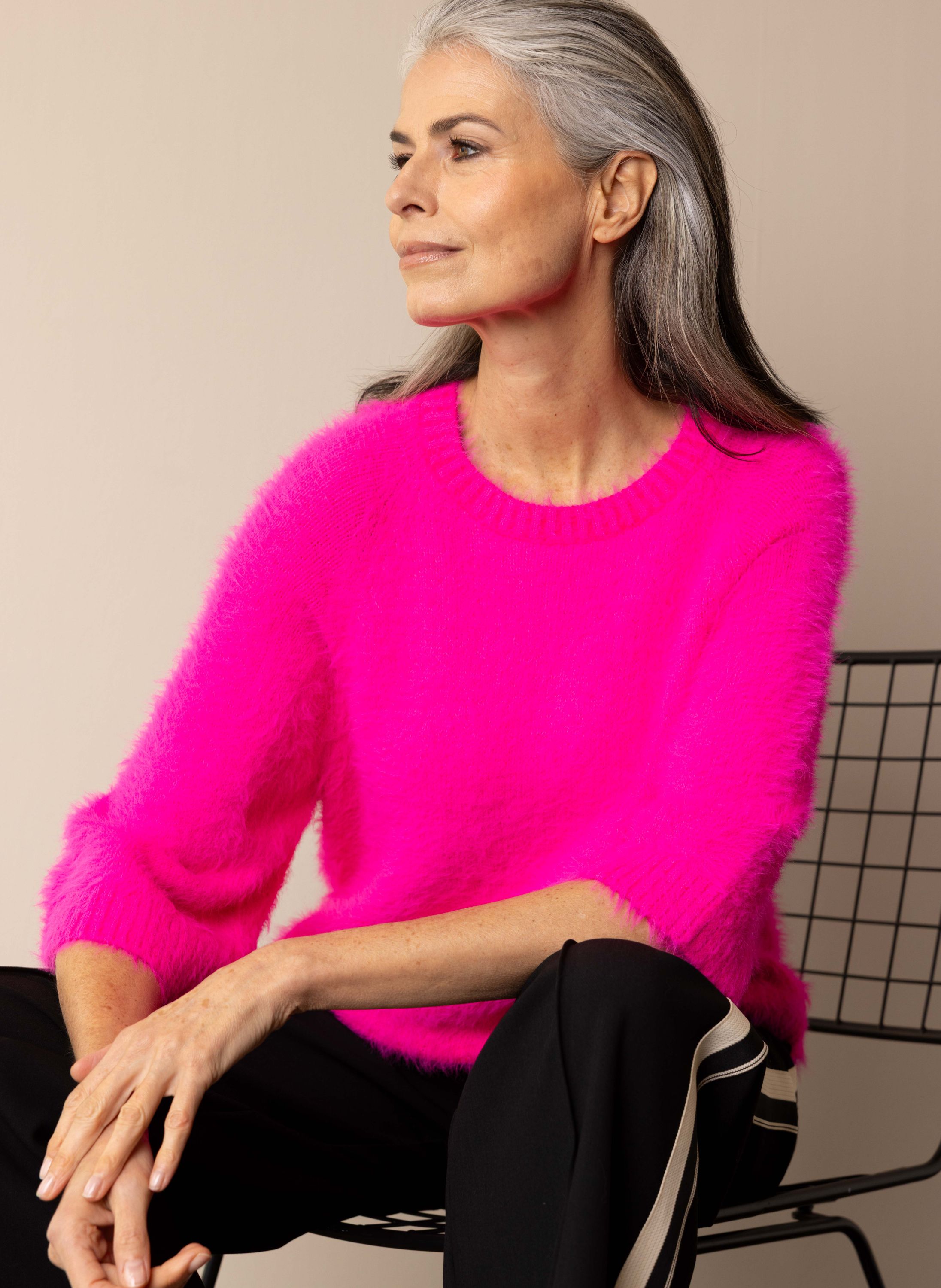 Deze gebreide trui met ronde hals en driekwart mouwen is een fijne trui voor het seizoen.