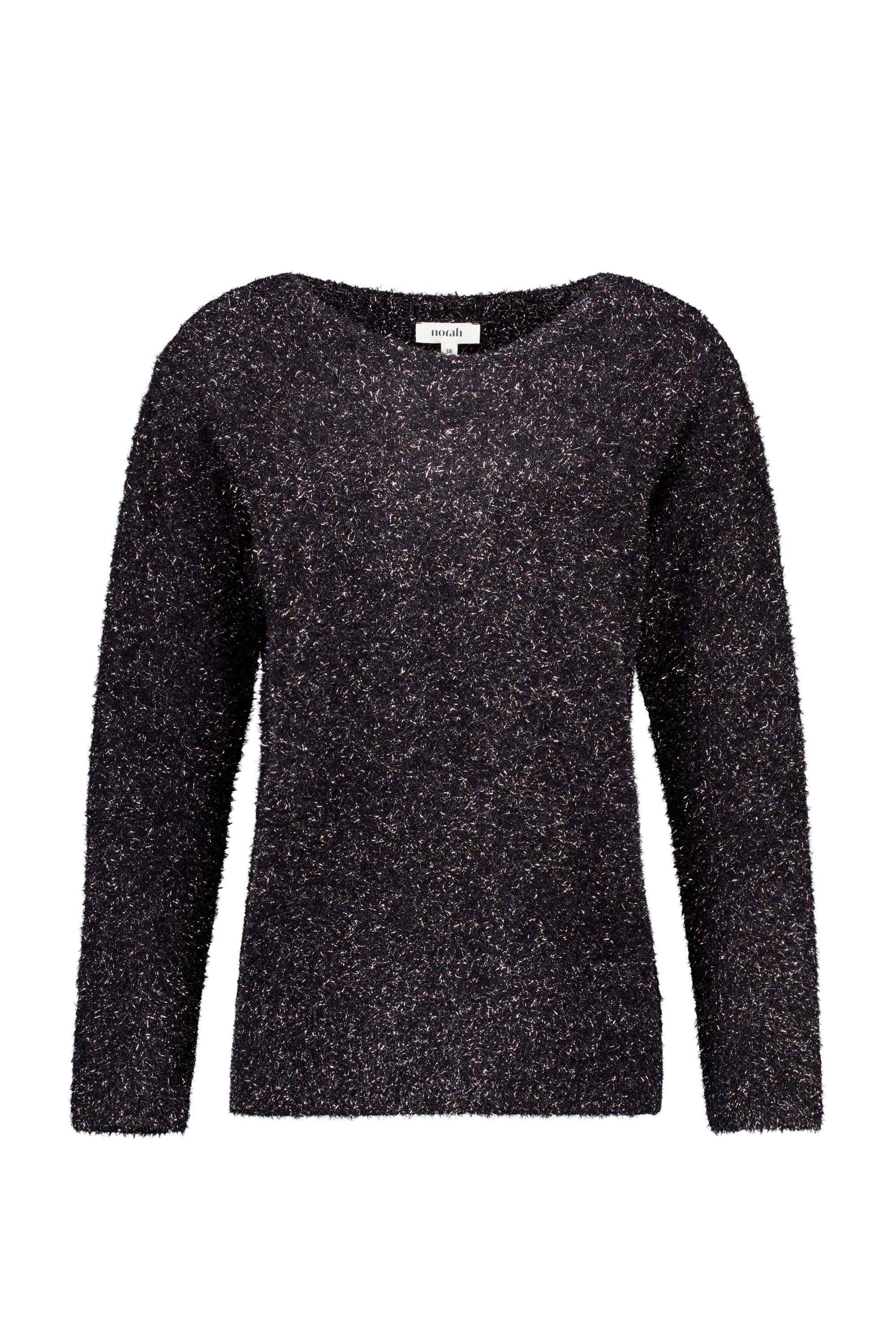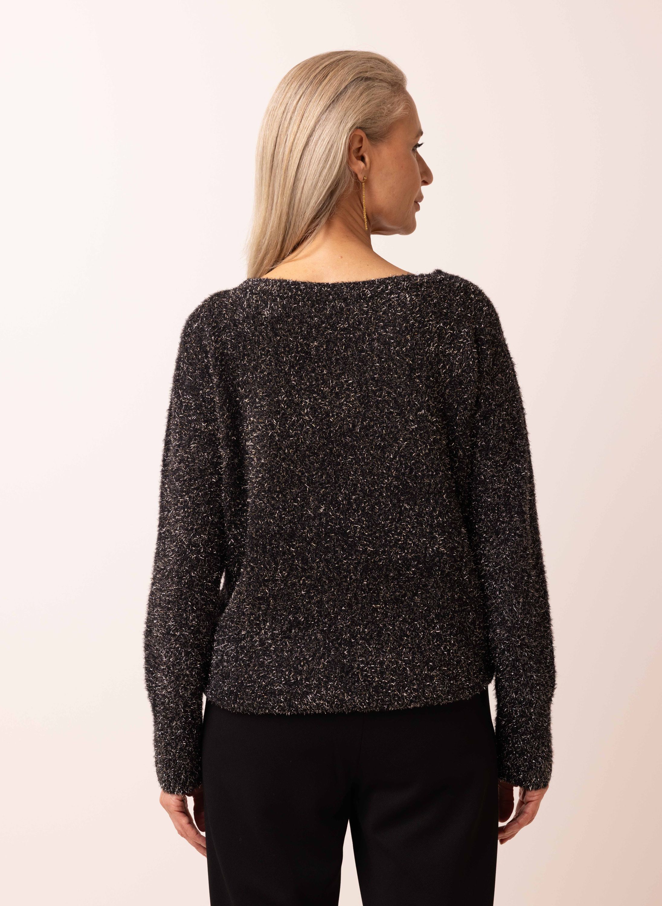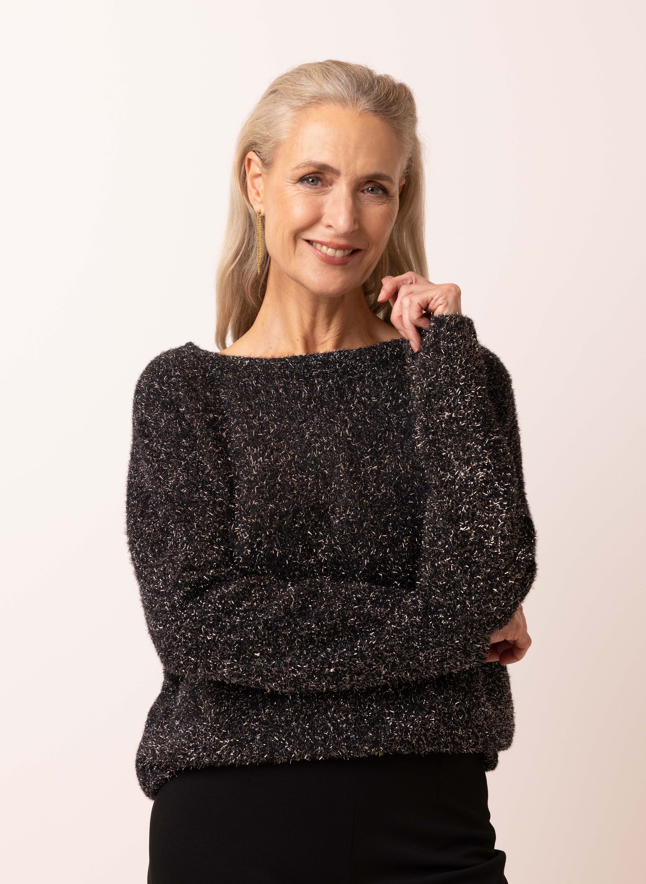 Deze gebreide trui met ronde hals en lange mouwen heeft veel stretch en een subtiele glans door het zilverkleurige lurexdraad.