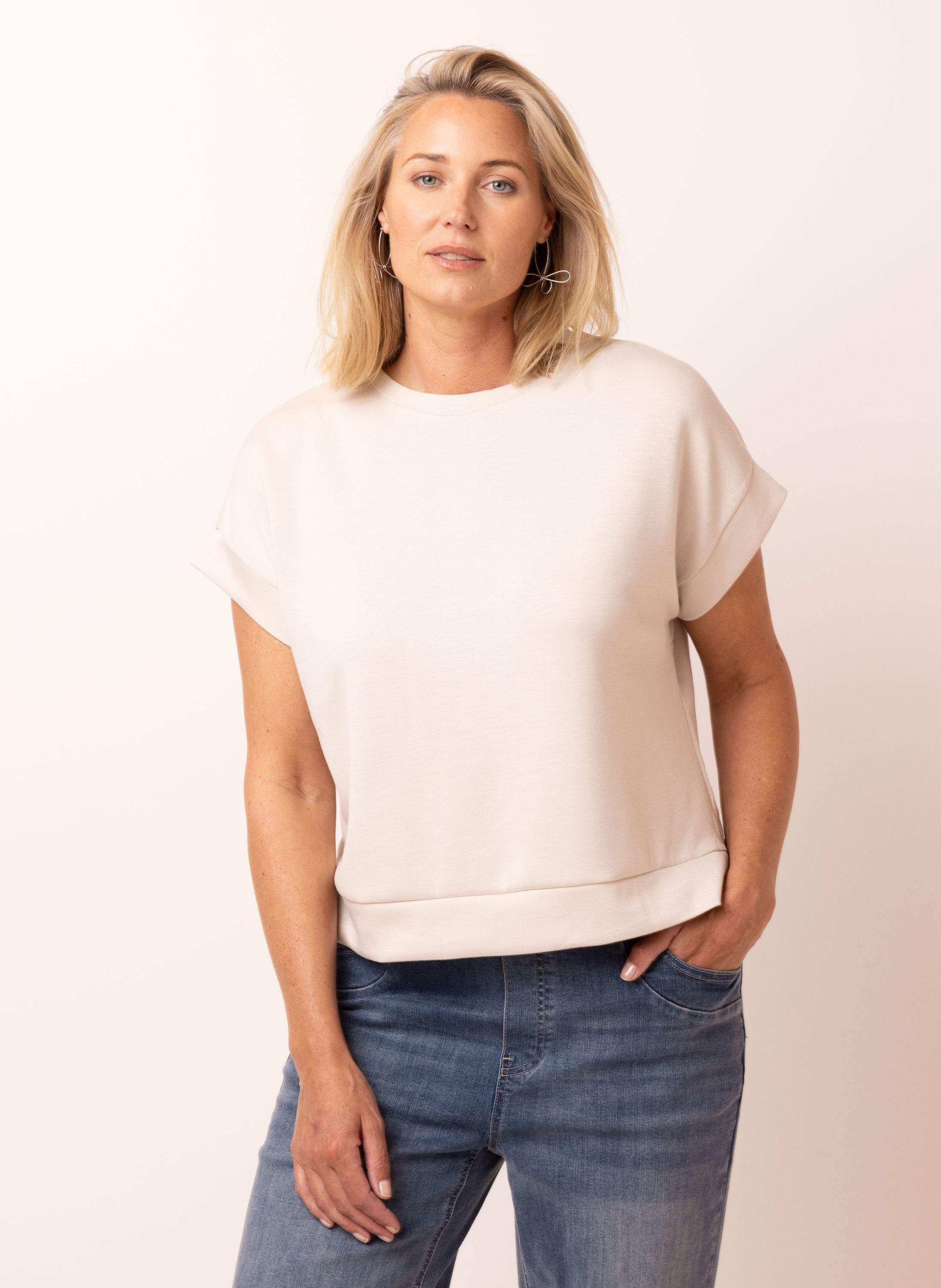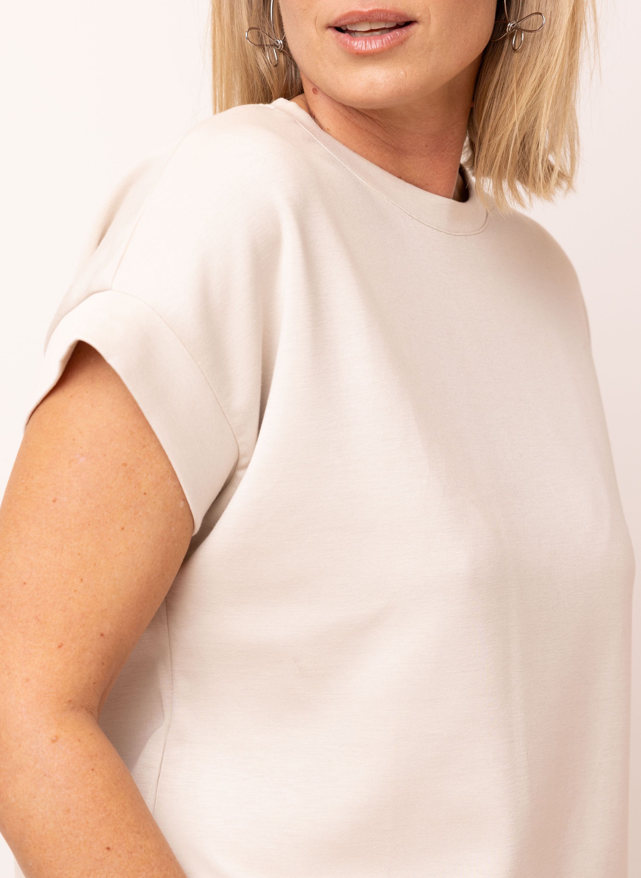 Dit shirt met ronde hals en aangeknipte korte mouwen heeft kleine splitjes aan beide zijdes..