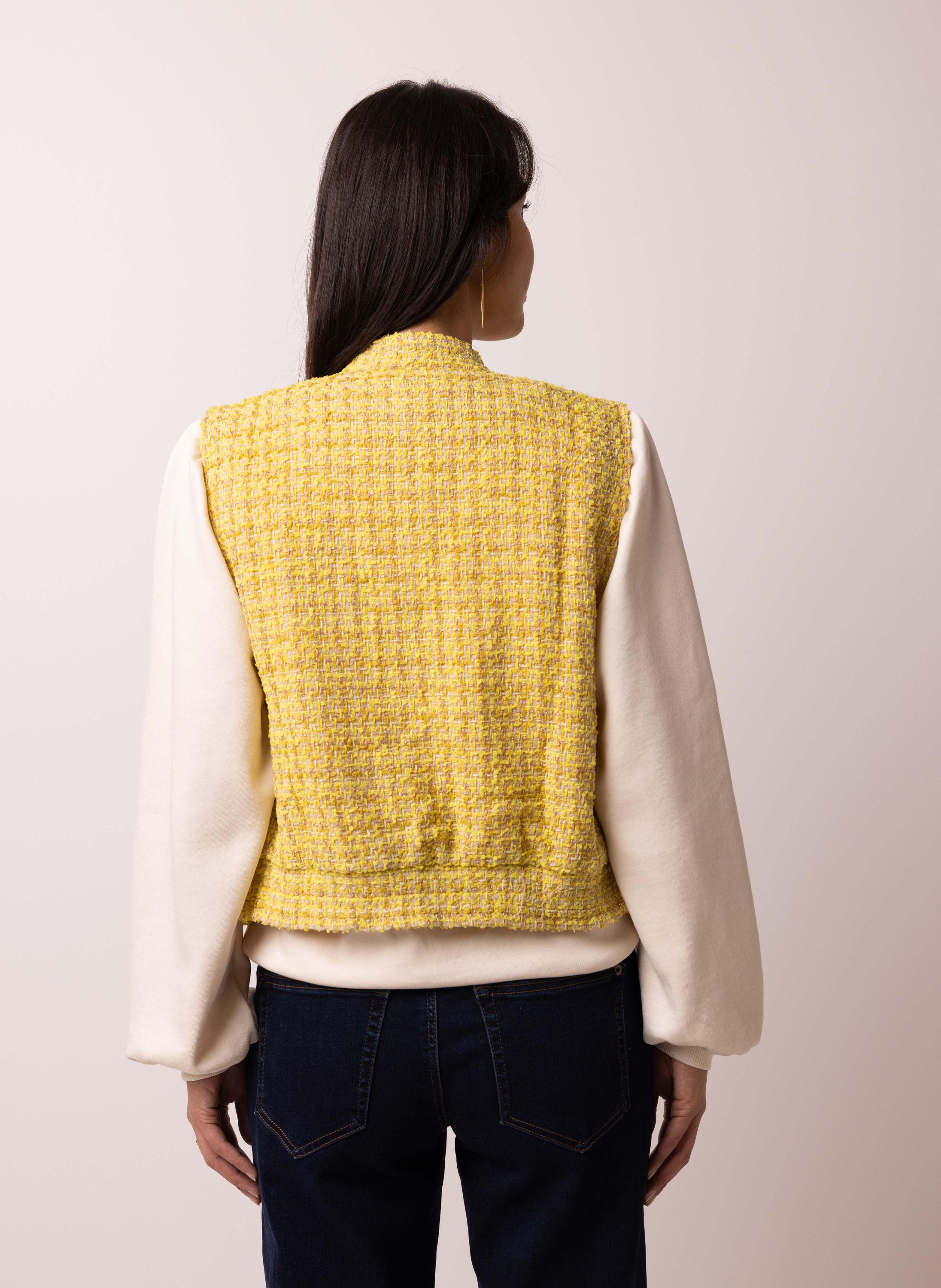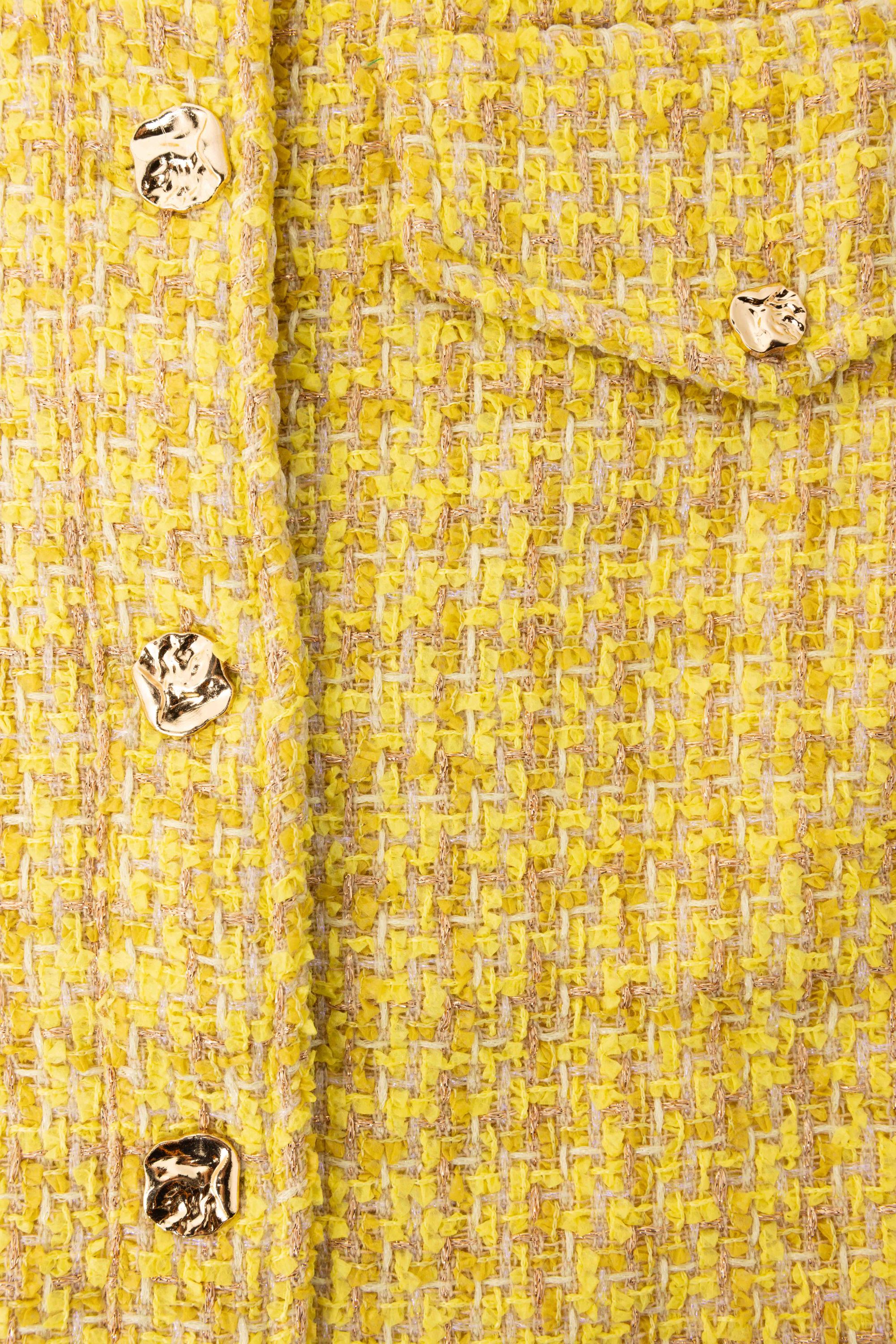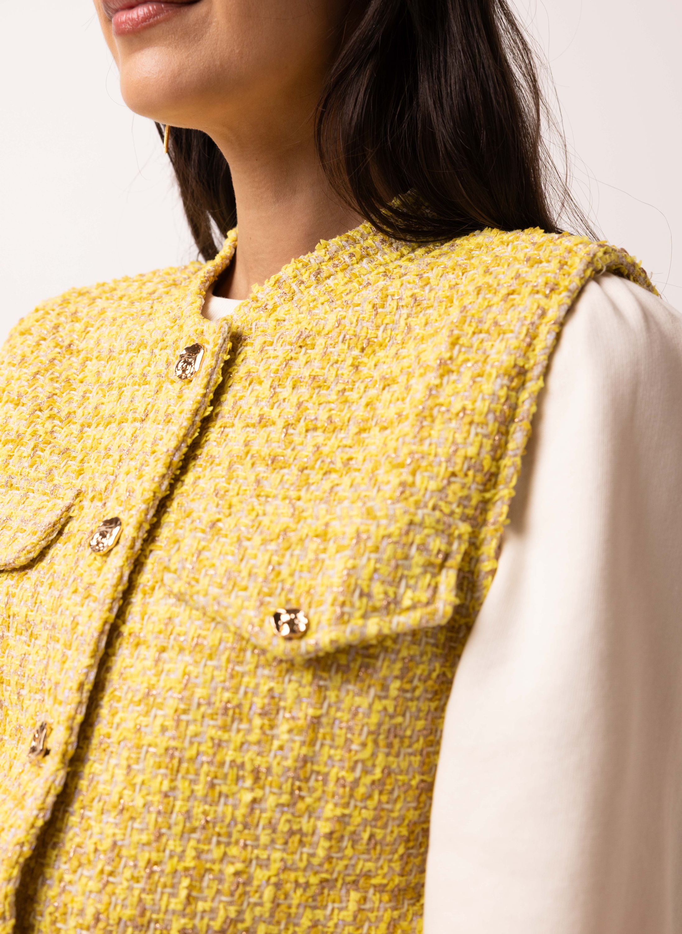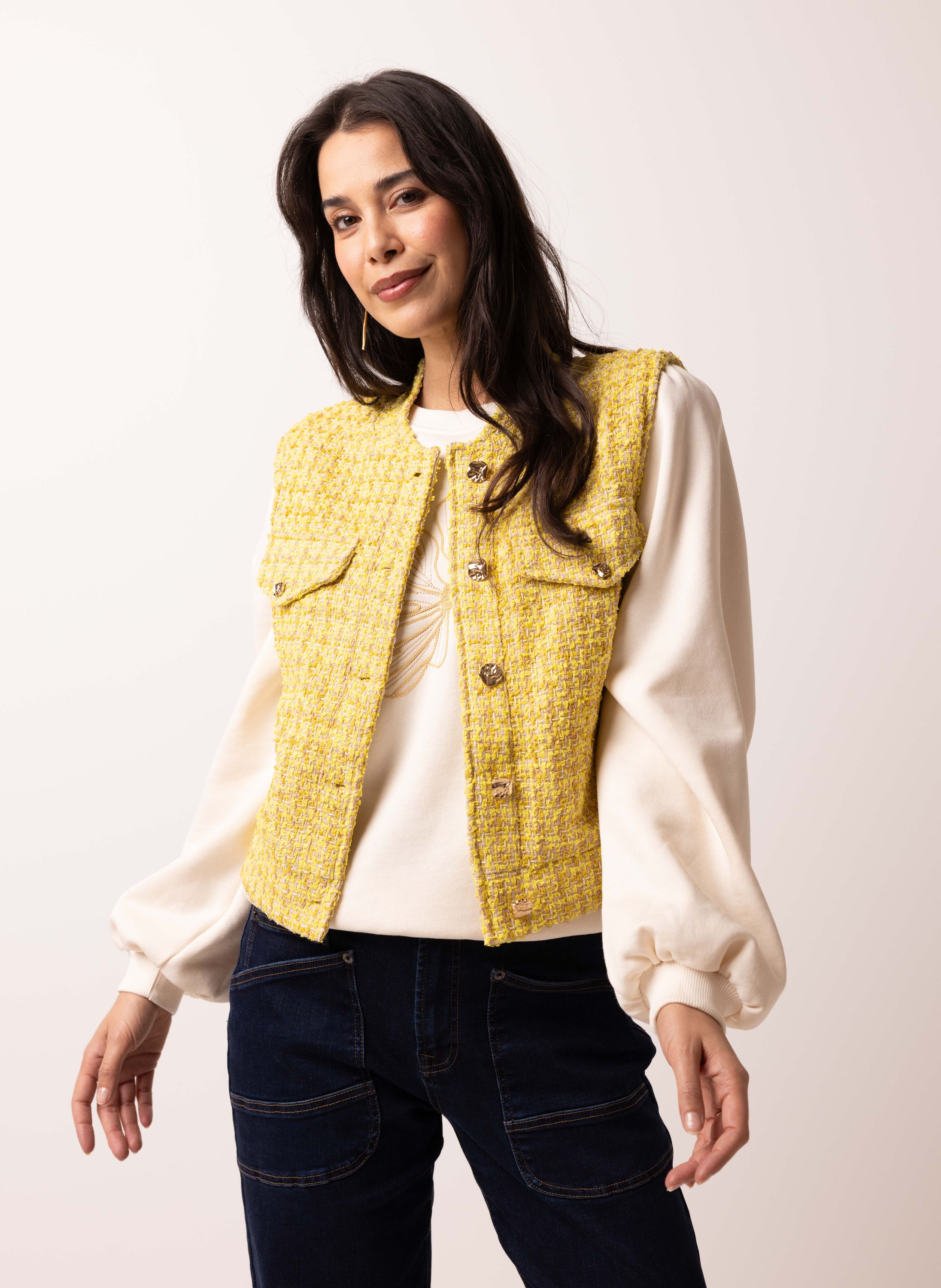 Dit mouwloze gilet met ronde hals heeft een goudkleurige knoopsluiting en decoratieve zakken aan de voorzijde.