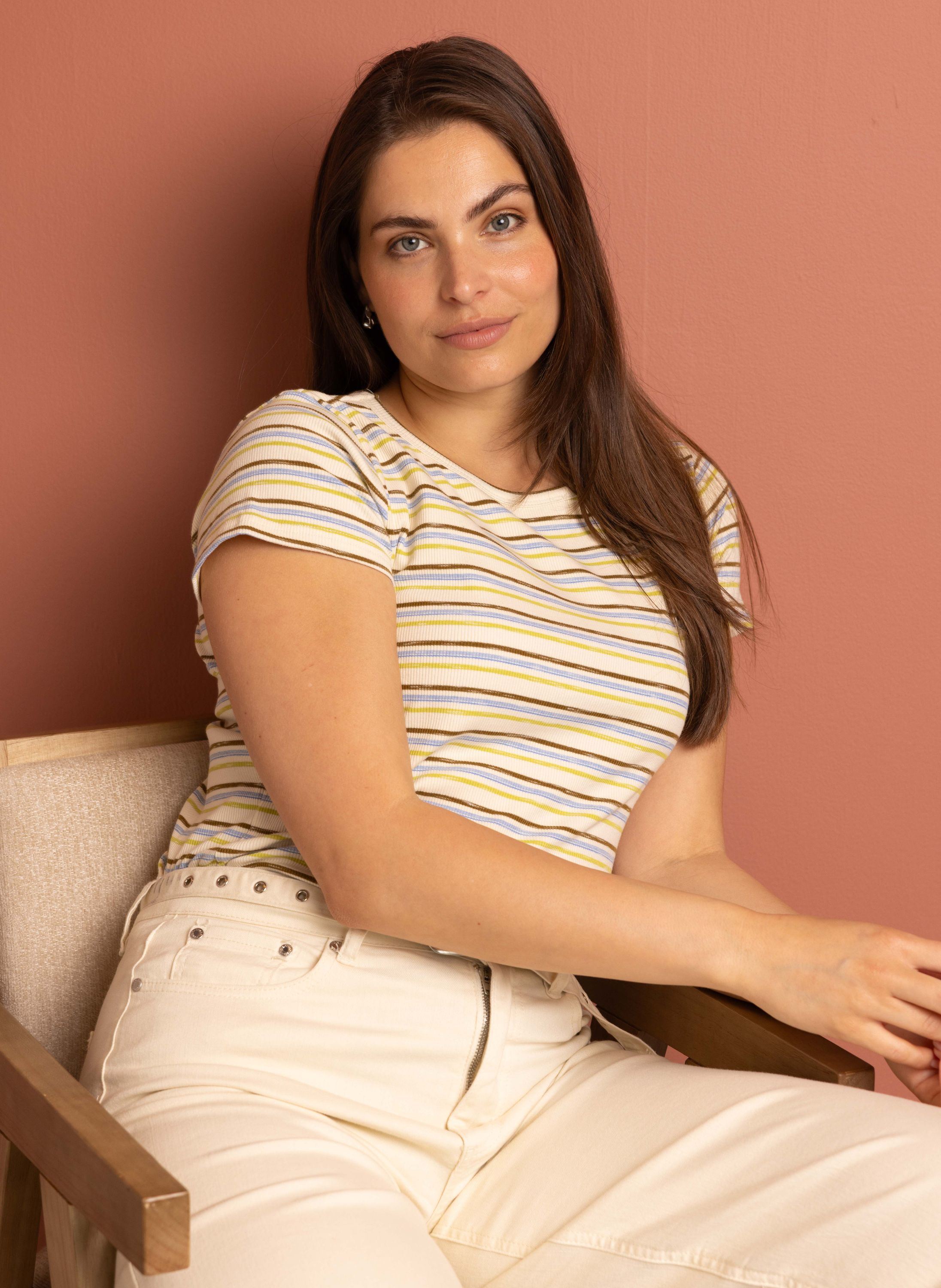 Basic shirt met ronde hals, korte mouwen en stretch. Ideaal om te combineren onder een vest of blazer.