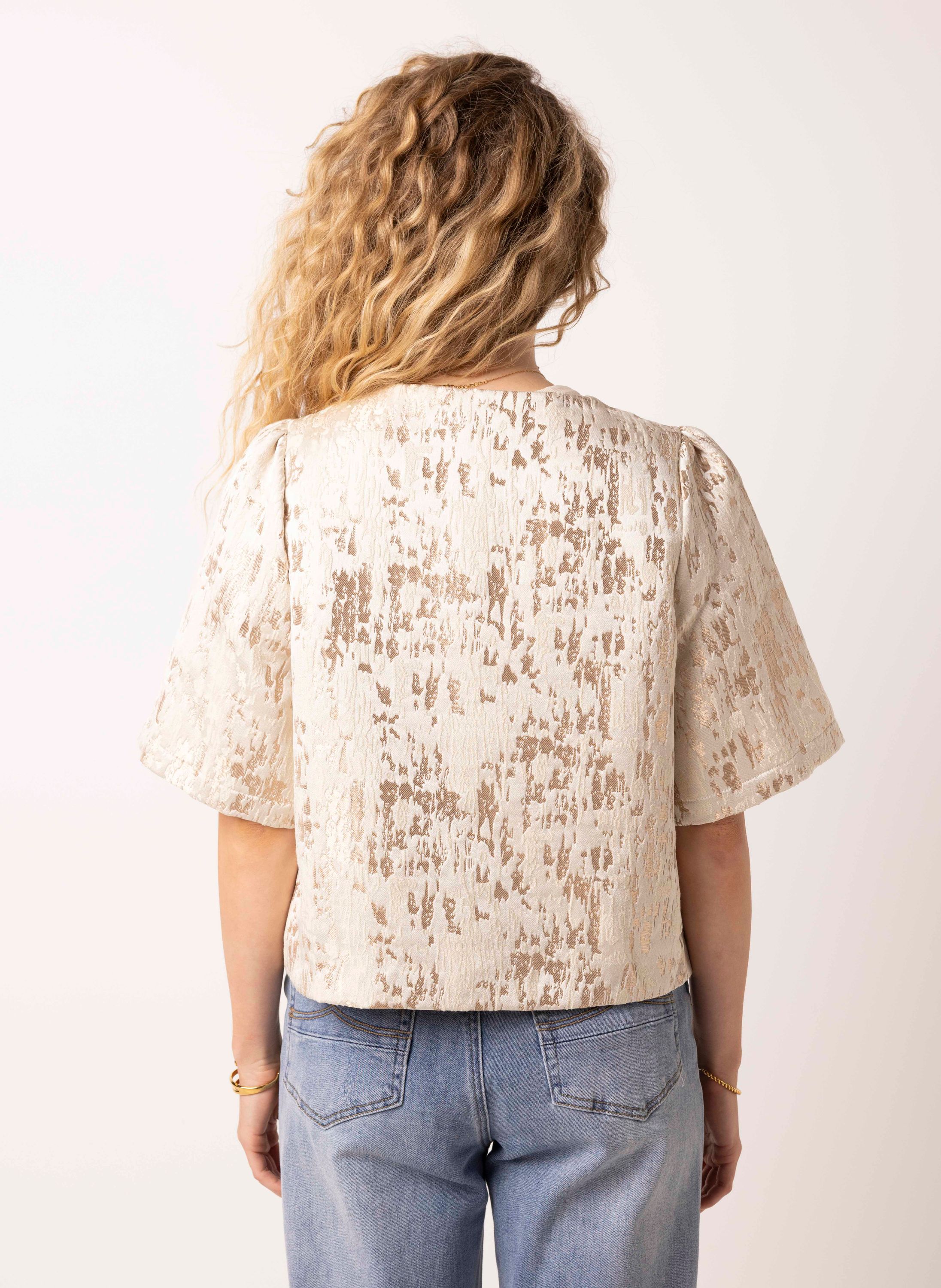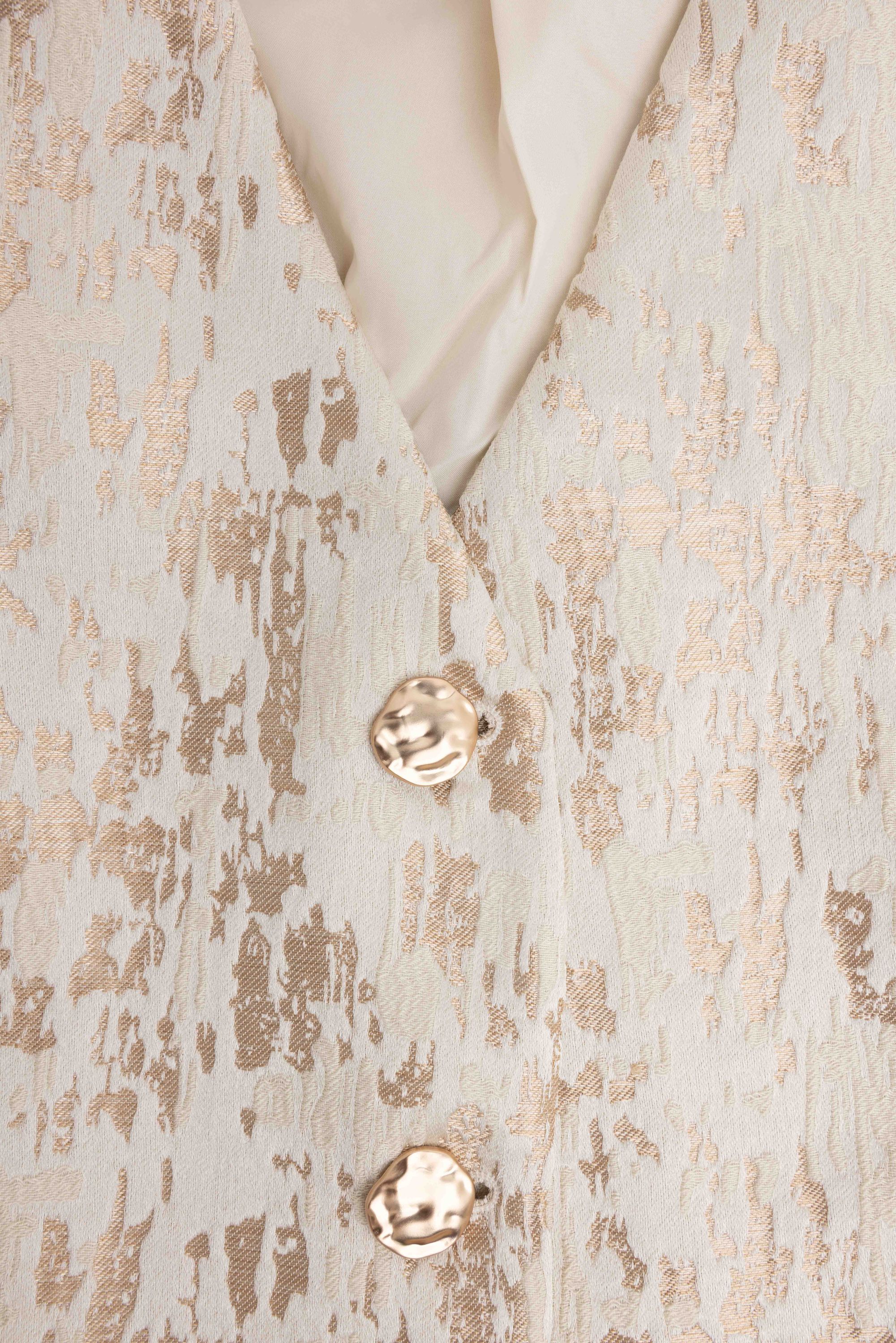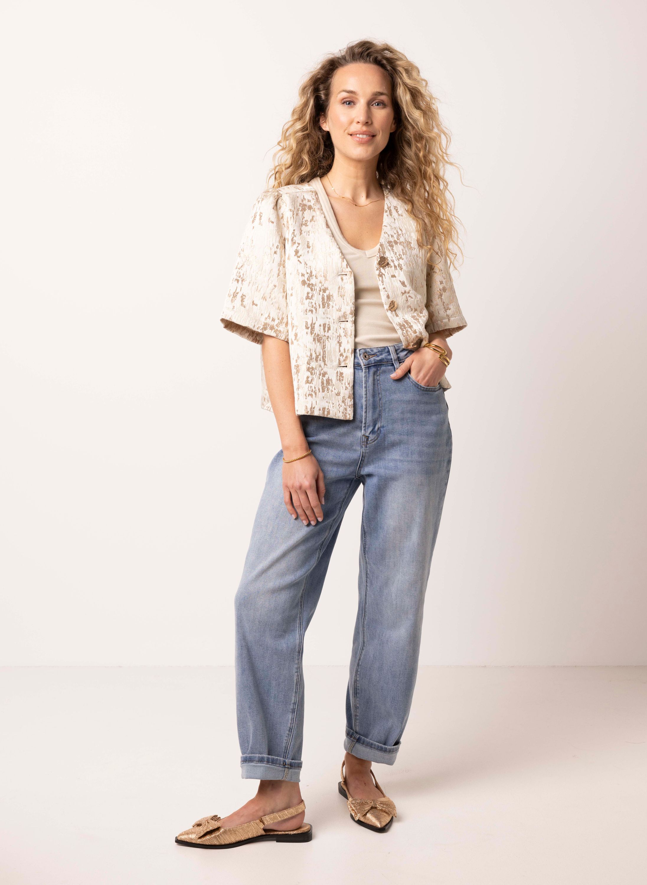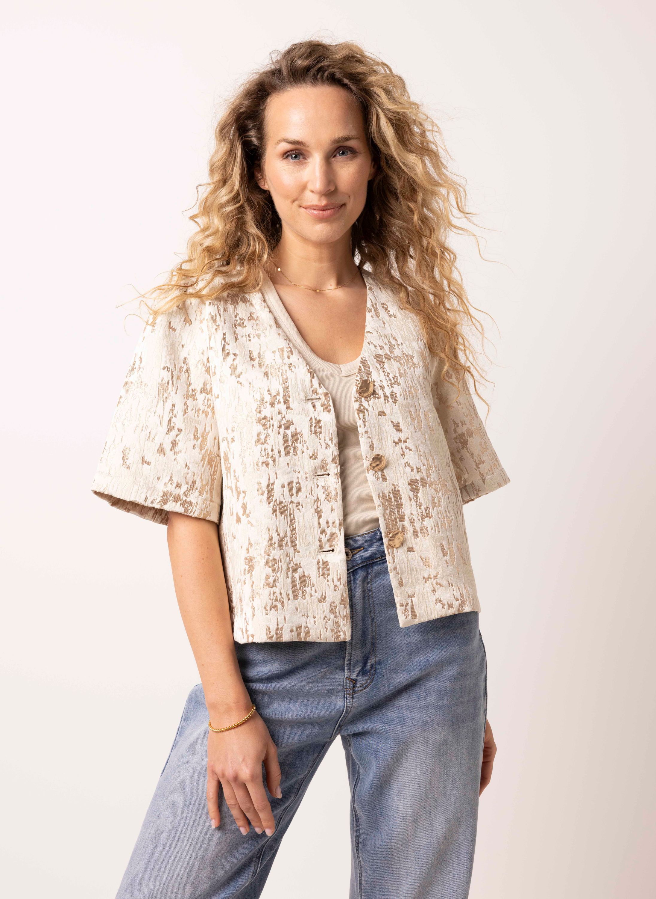 Dit jasje met V-hals heeft halflange mouwen en een knoopsluiting.