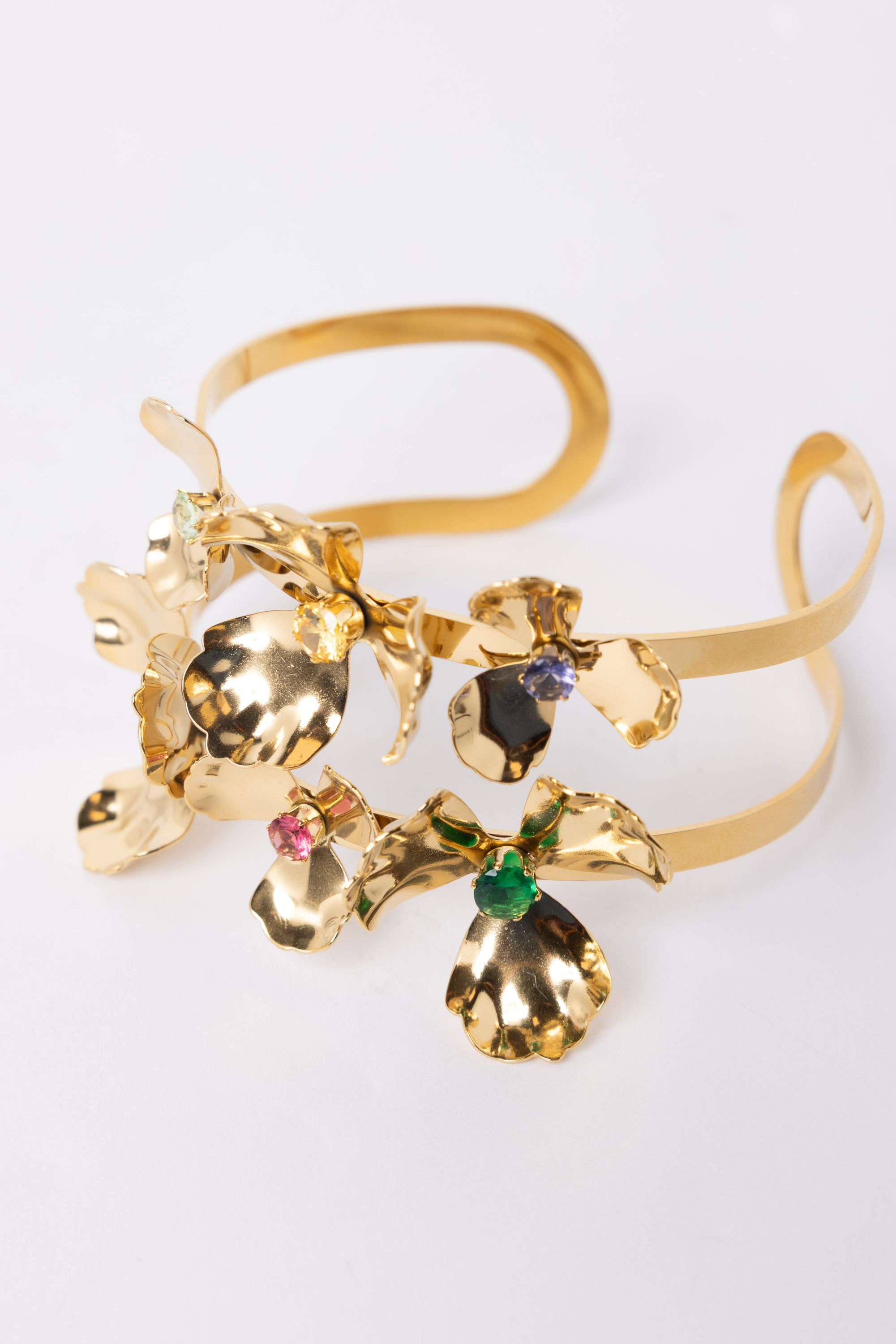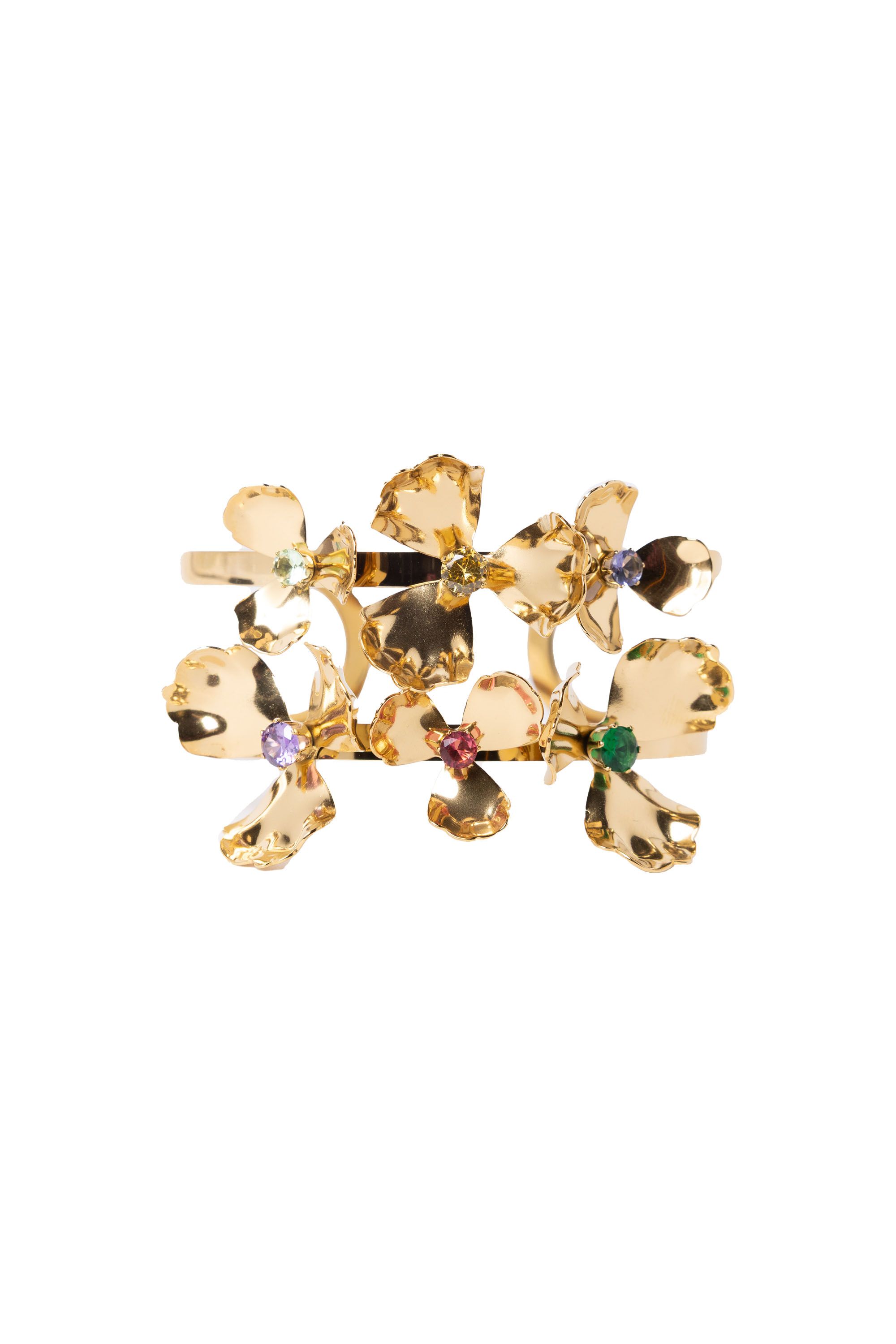 Deze goudkleurige armband met gekleurde bloemen voegt een speelse touch toe aan je look. Afmeting: 6 cm doorsnee.