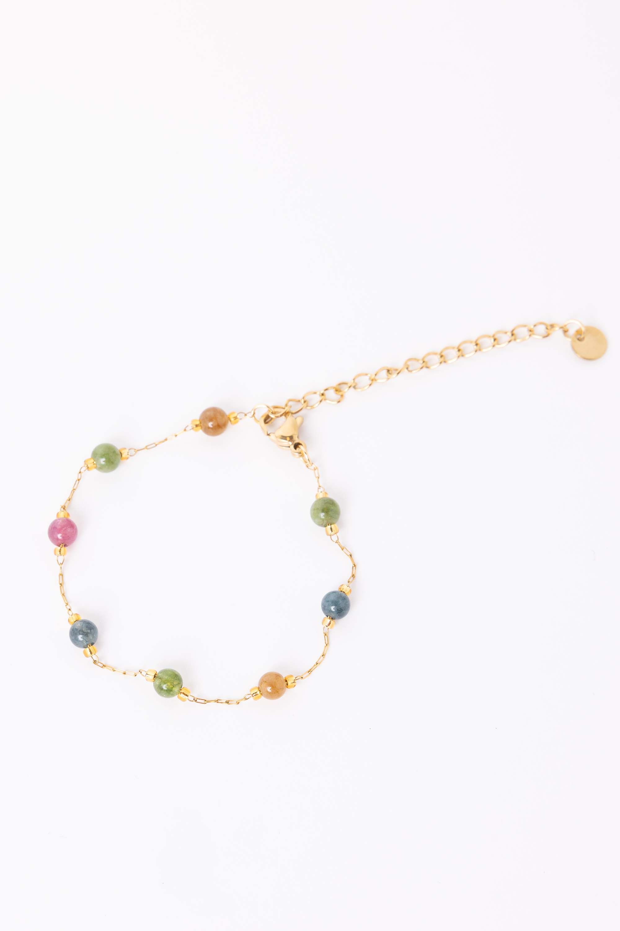 Deze zilverkleurige armband met gekleurde steentjes geeft je outfit een speelse touch.