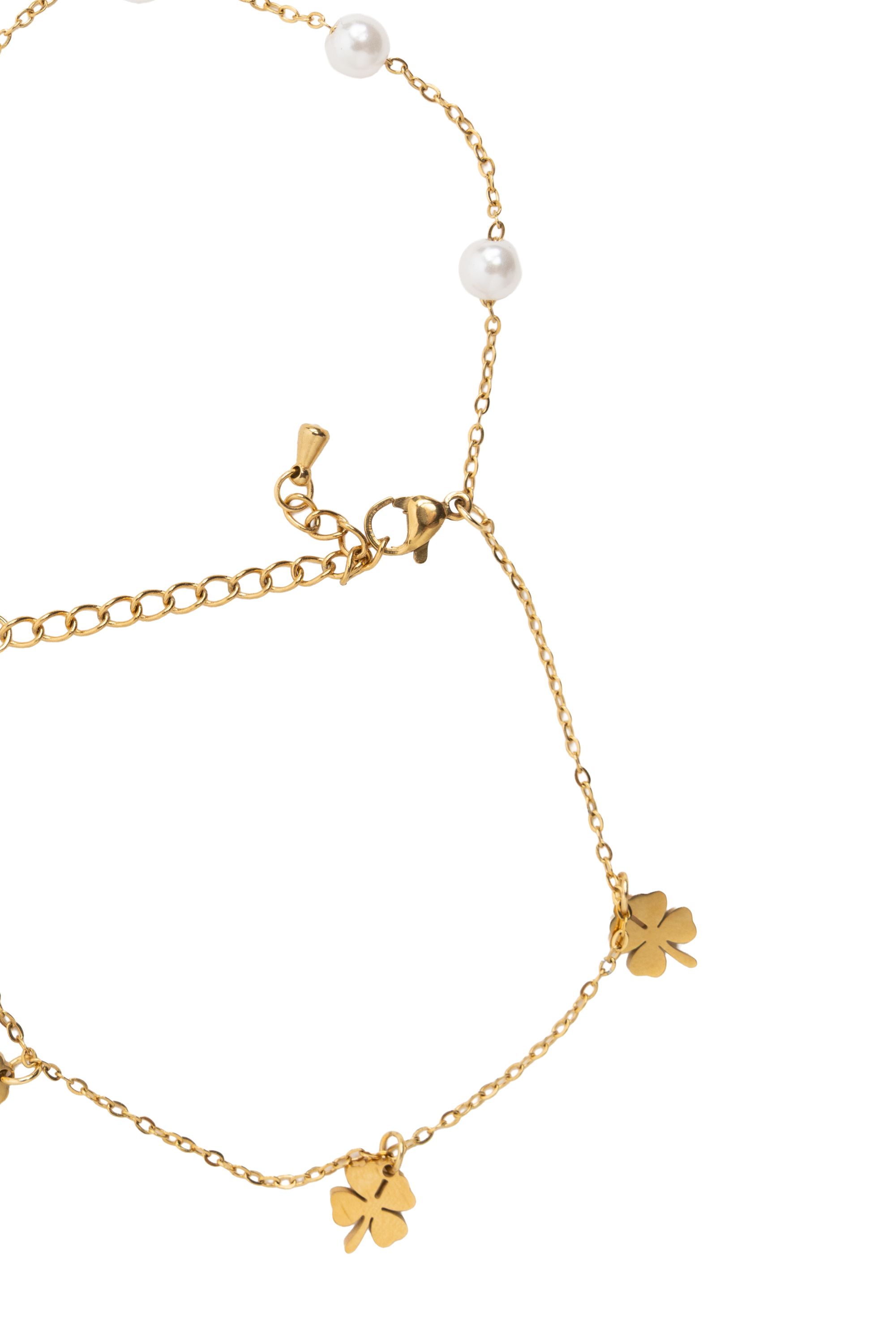 Goudkleurige dubbele armband met klavertjes en imitatieparels. Afmeting: 20 cm.