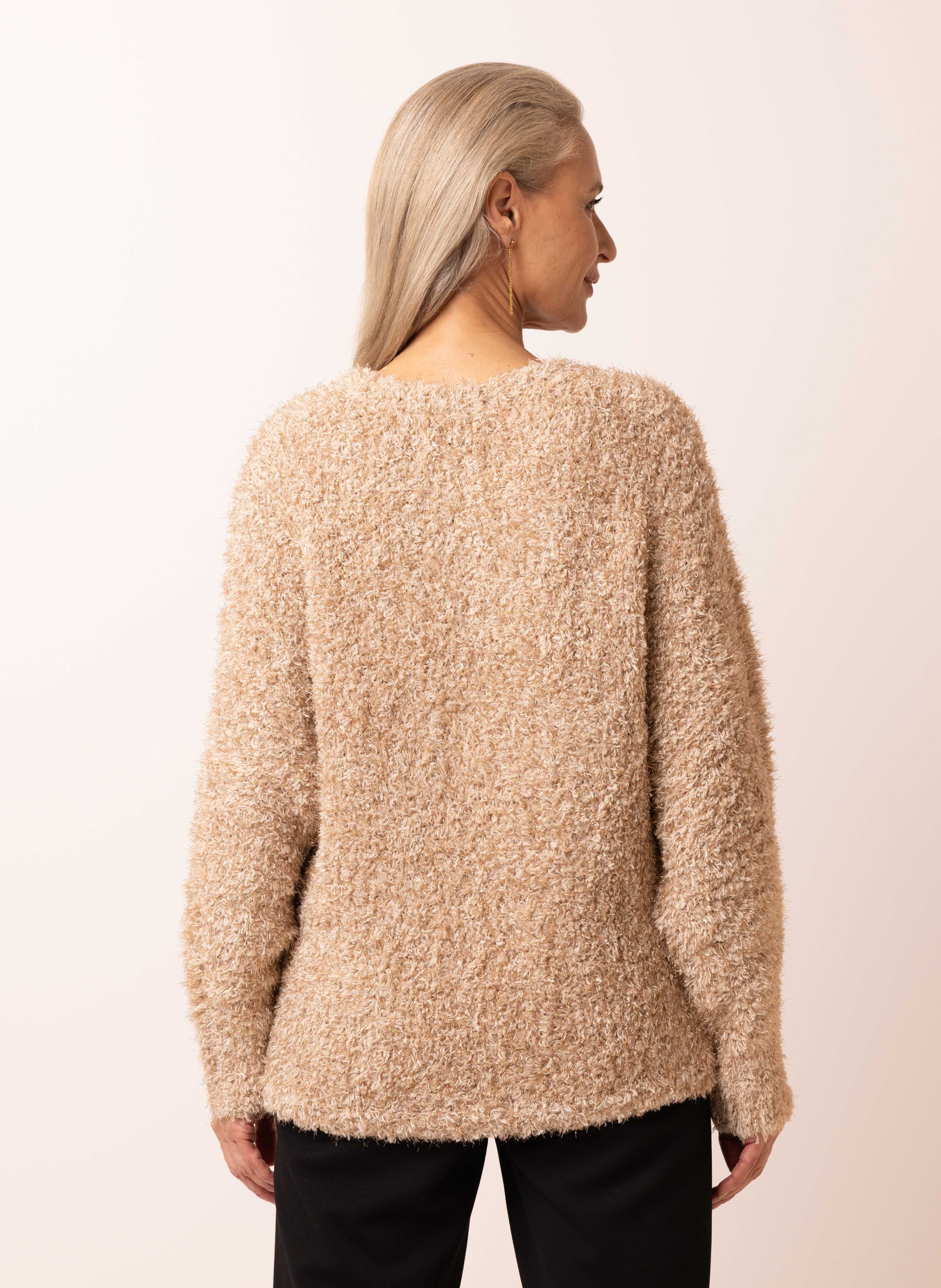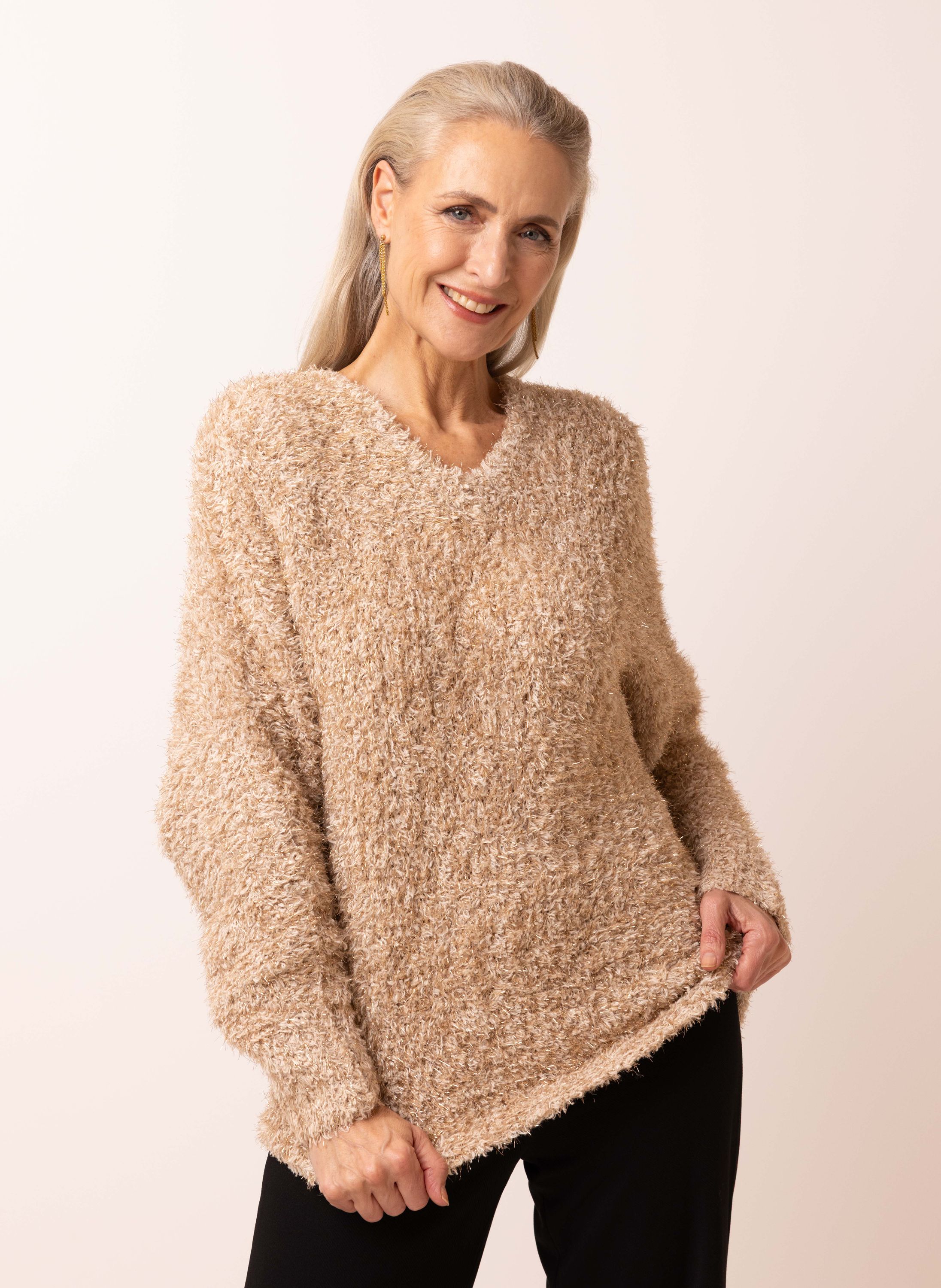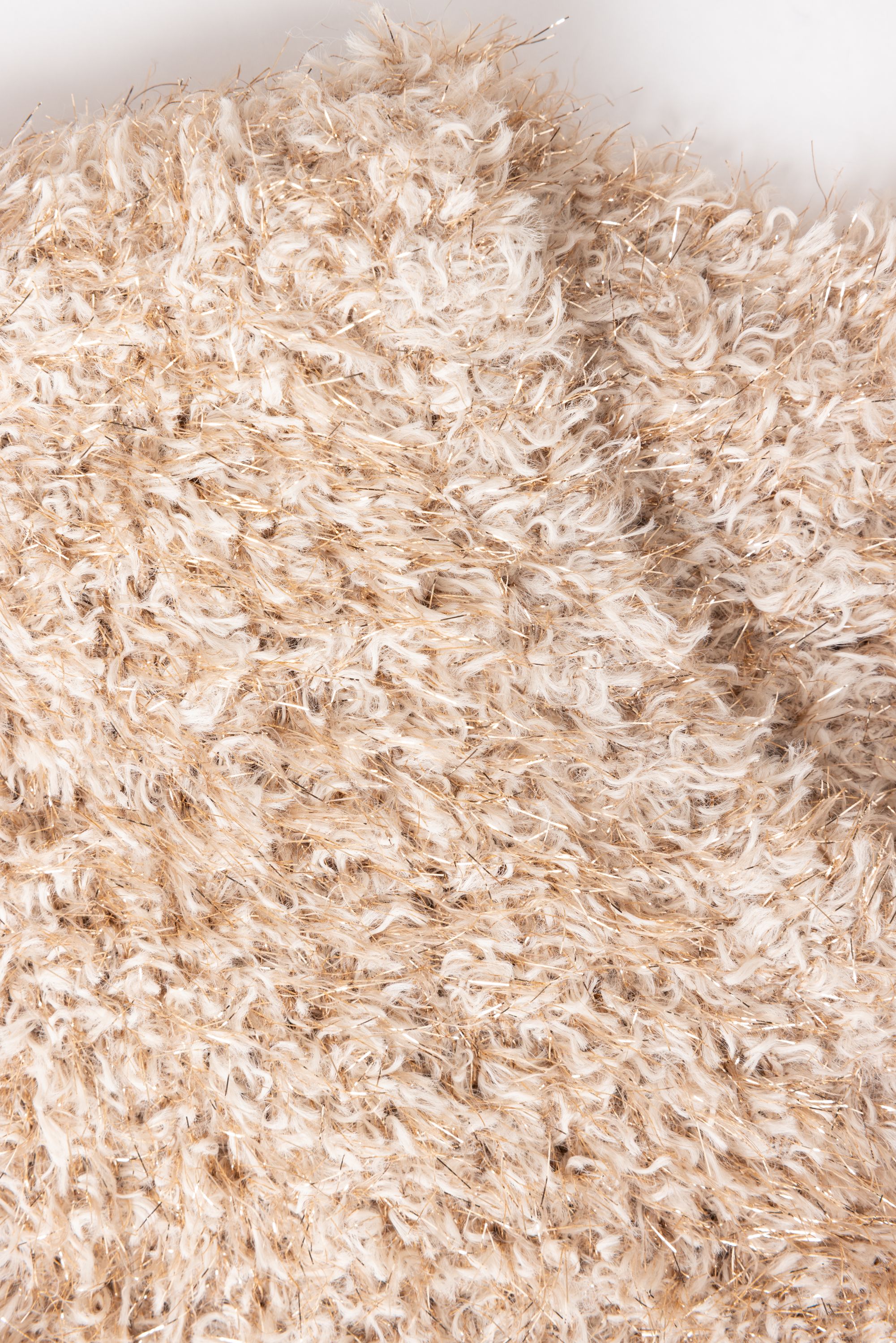 Deze gebreide trui met ronde hals en lange mouwen heeft een subtiele glans door het goudkleurige lurexdraad, perfect voor een feestelijke look.