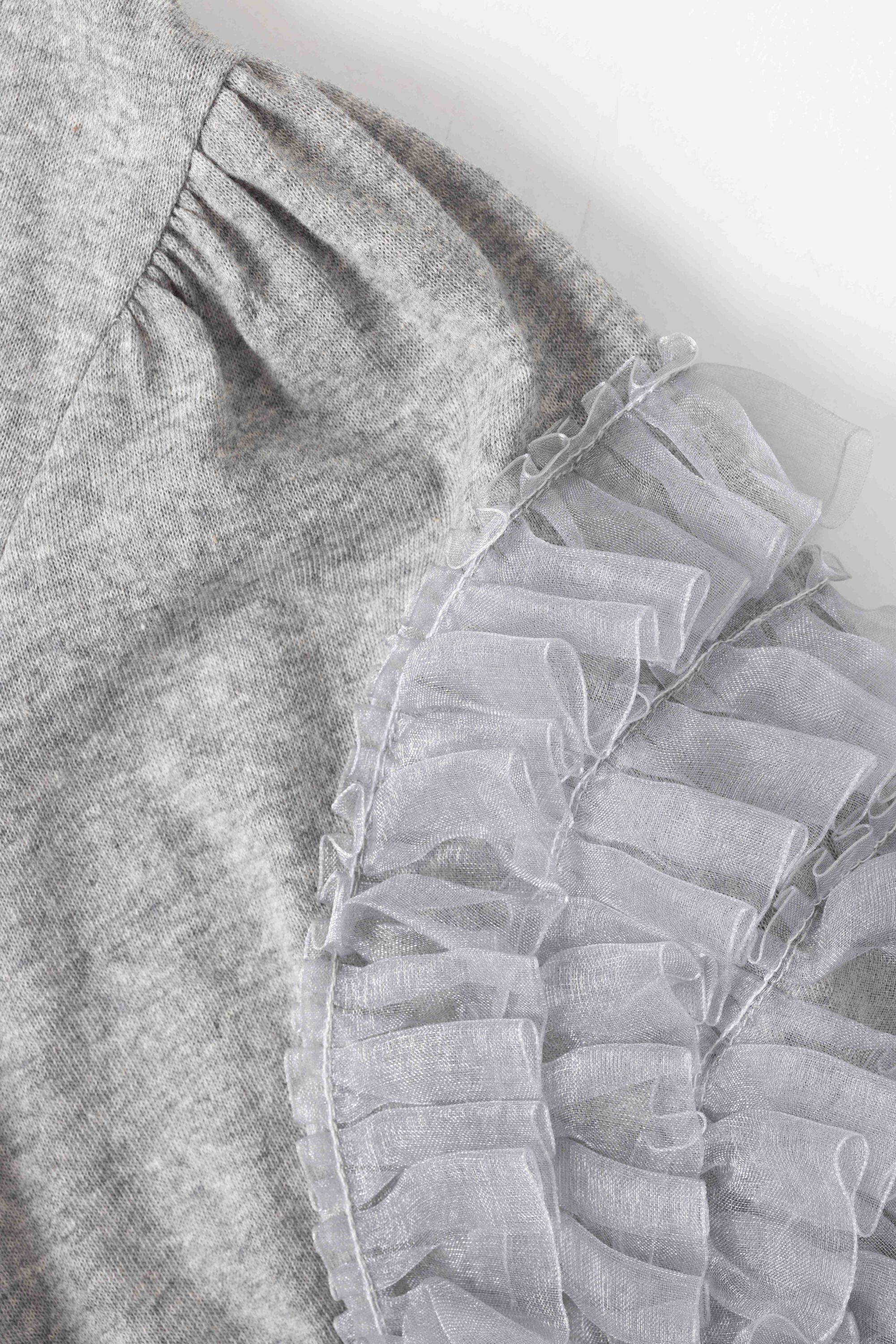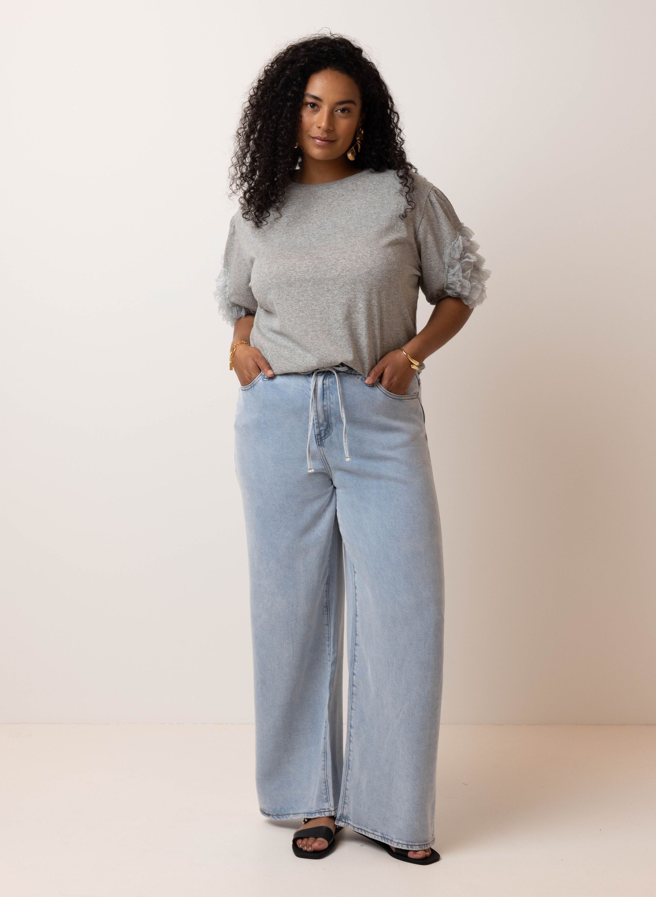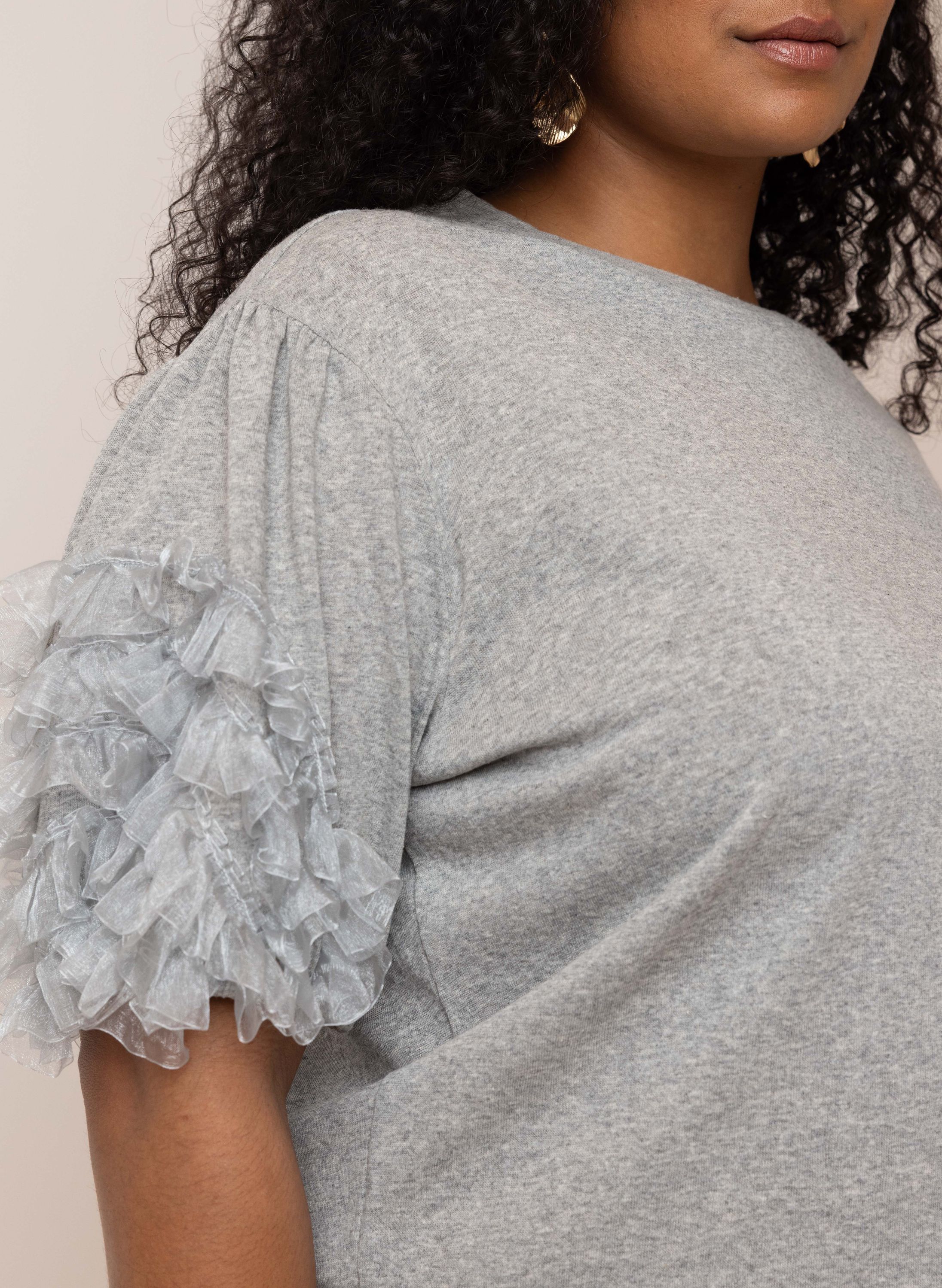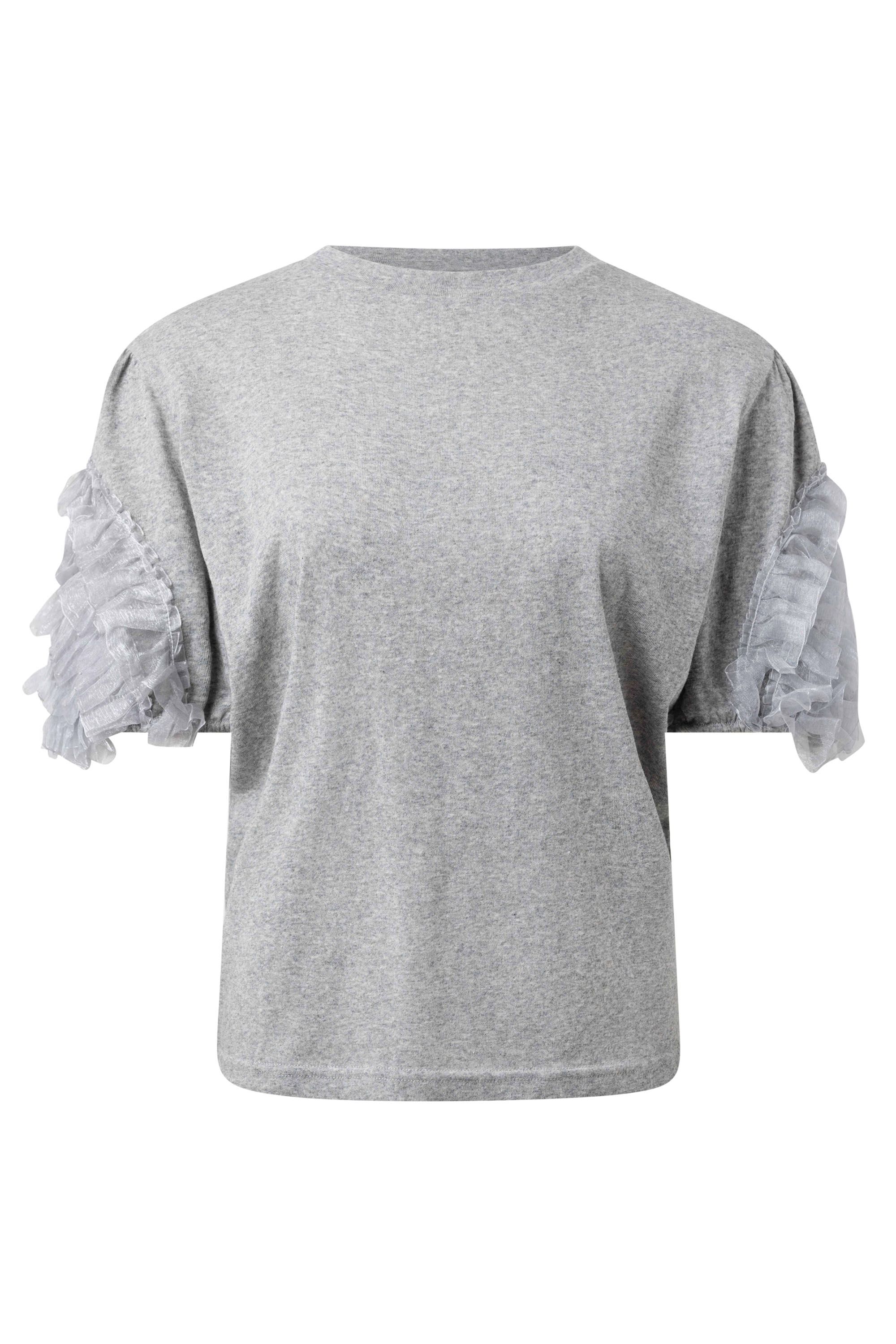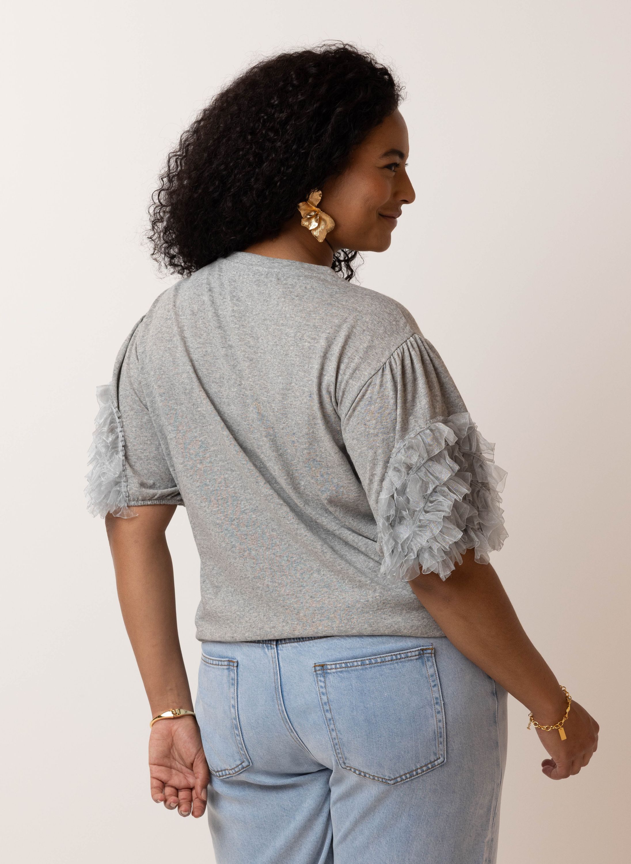 Dit shirt met ronde hals heeft korte mouwen met elastische band en vrouwelijke ruches.