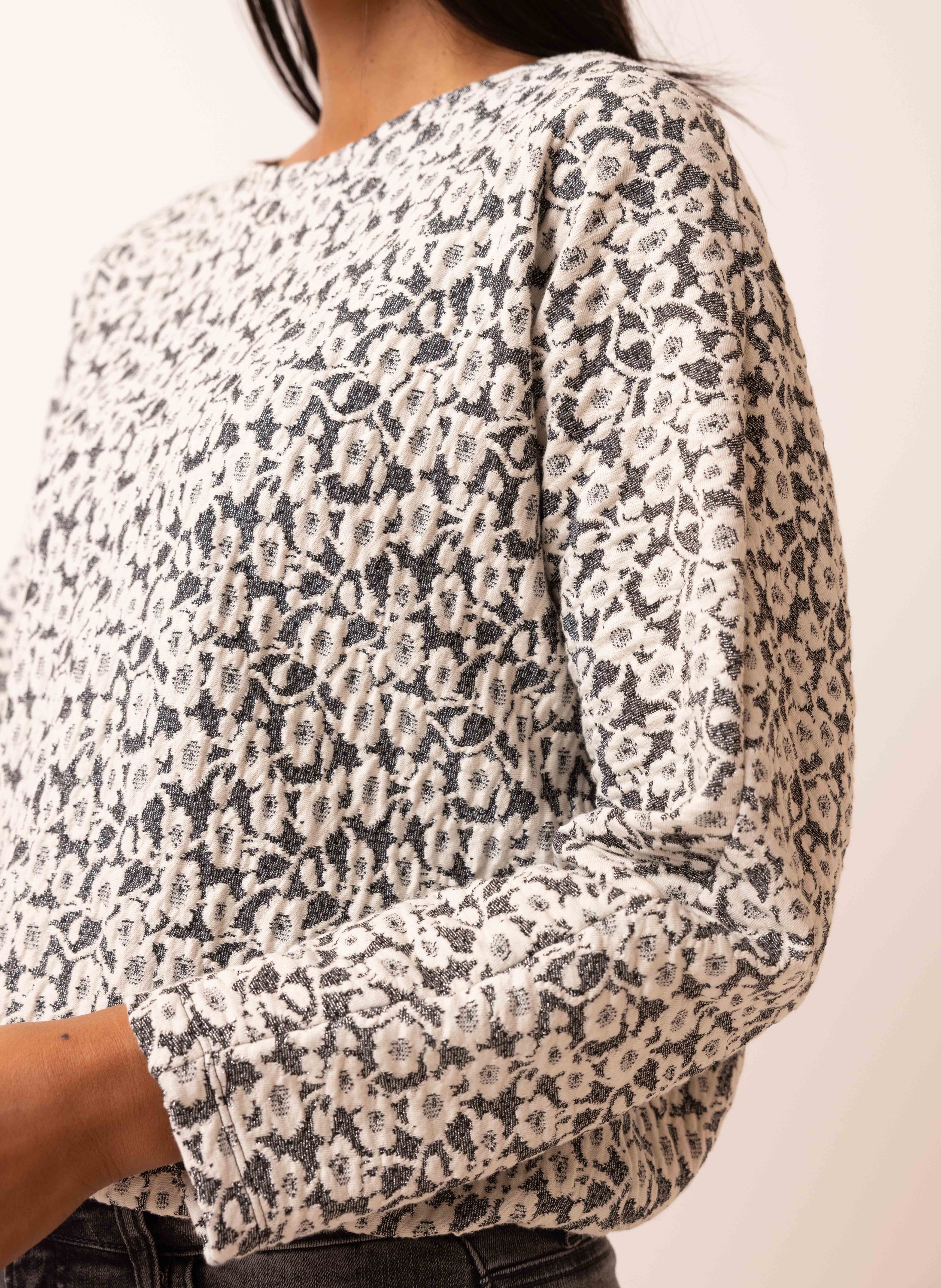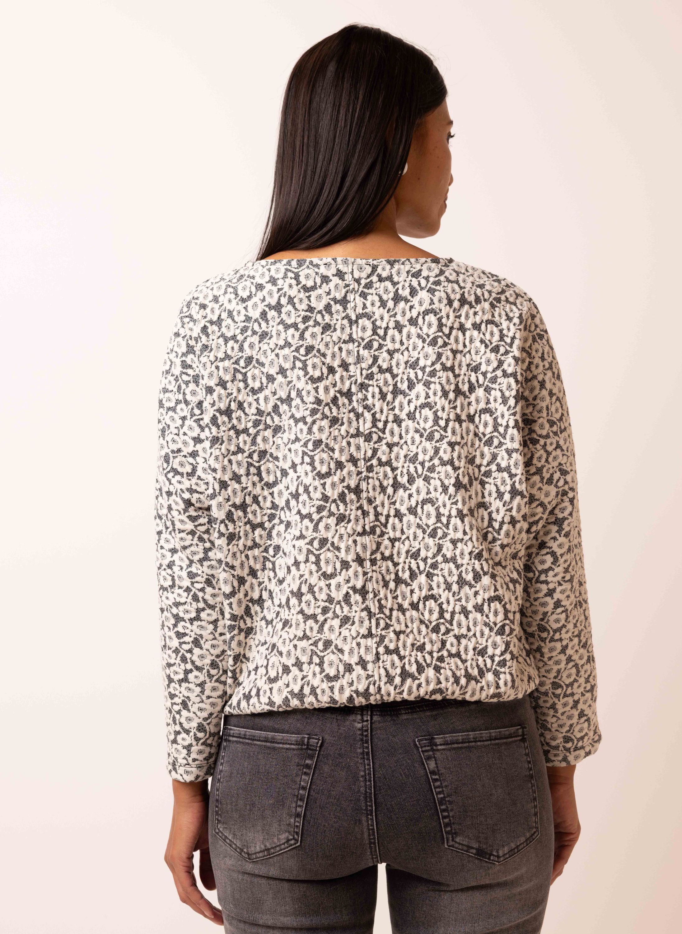 Deze trui met ronde hals en aangeknipte lange mouwen is afgewerkt met een elastische band aan de onderzijde.