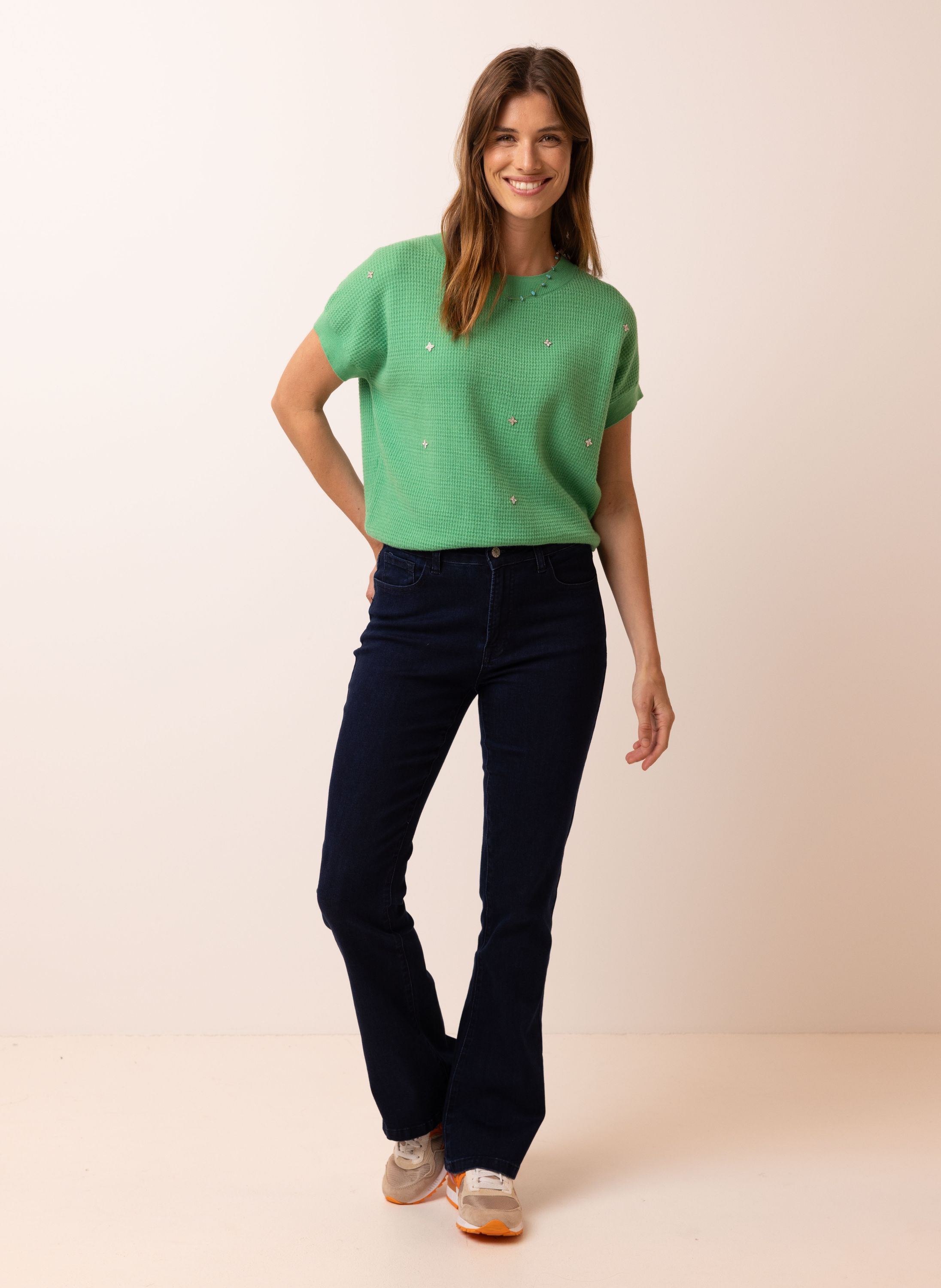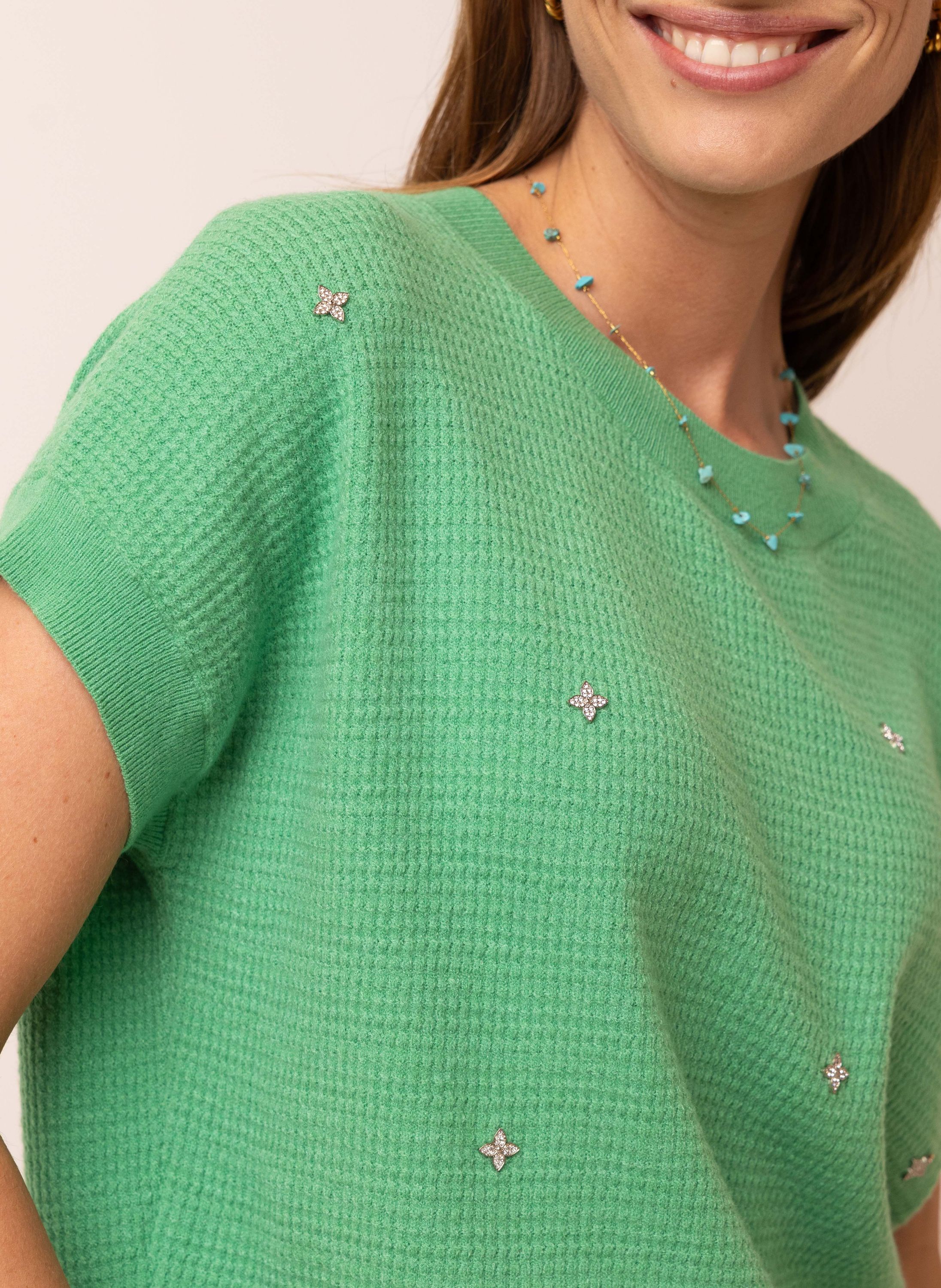 Dit gebreide shirt met ronde hals en korte mouwen is afgewerkt met strass steentjes voor een subtiele glans.
