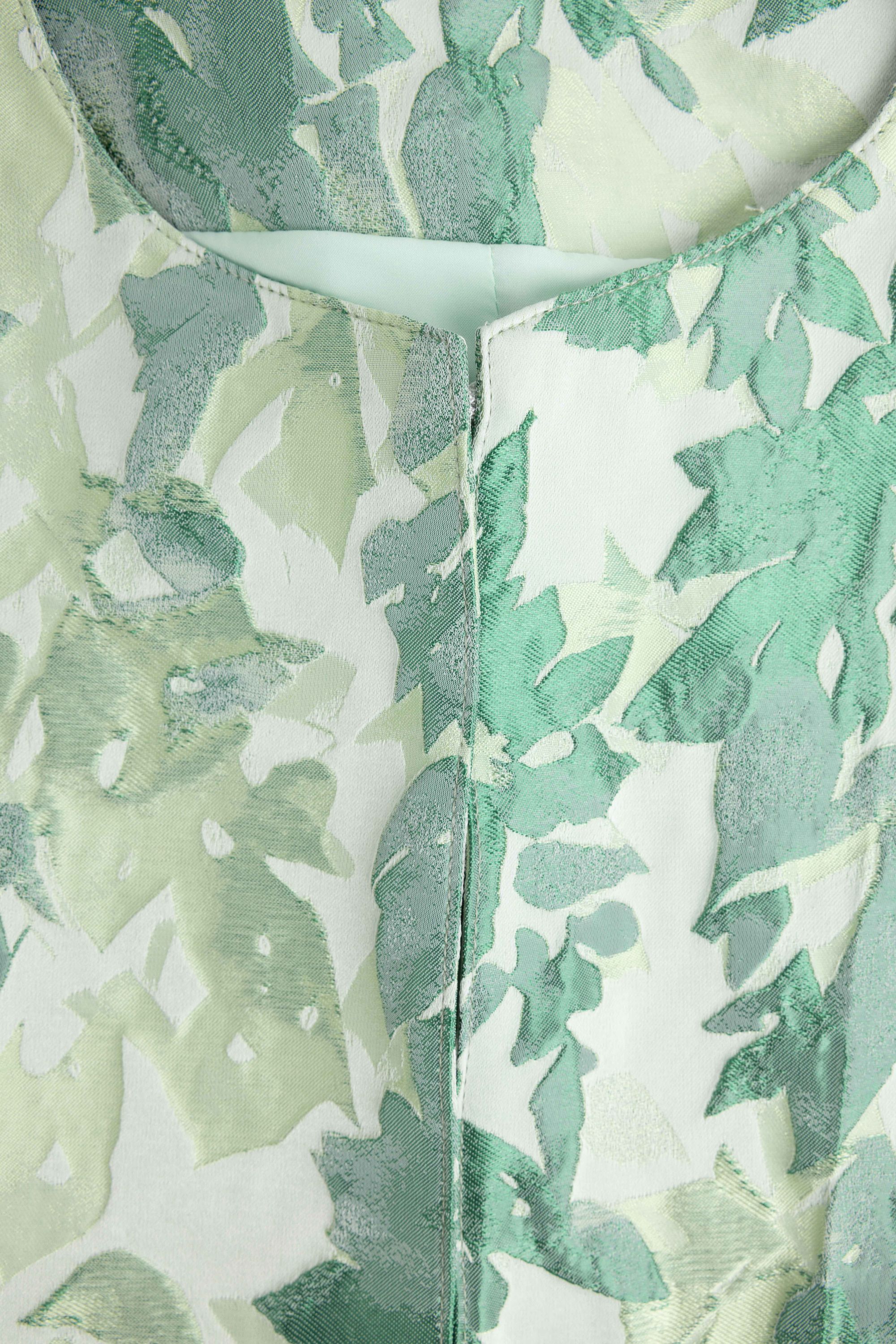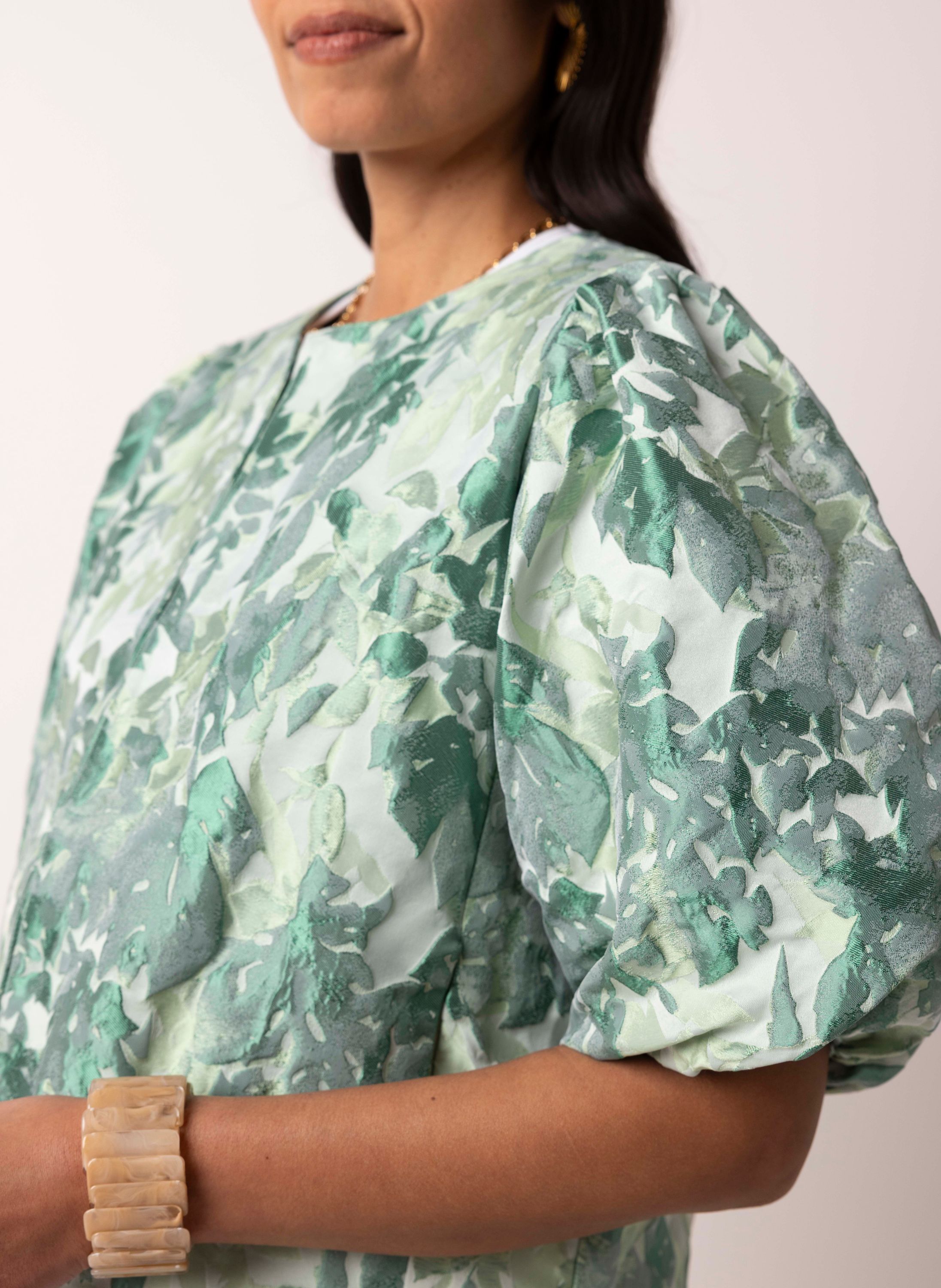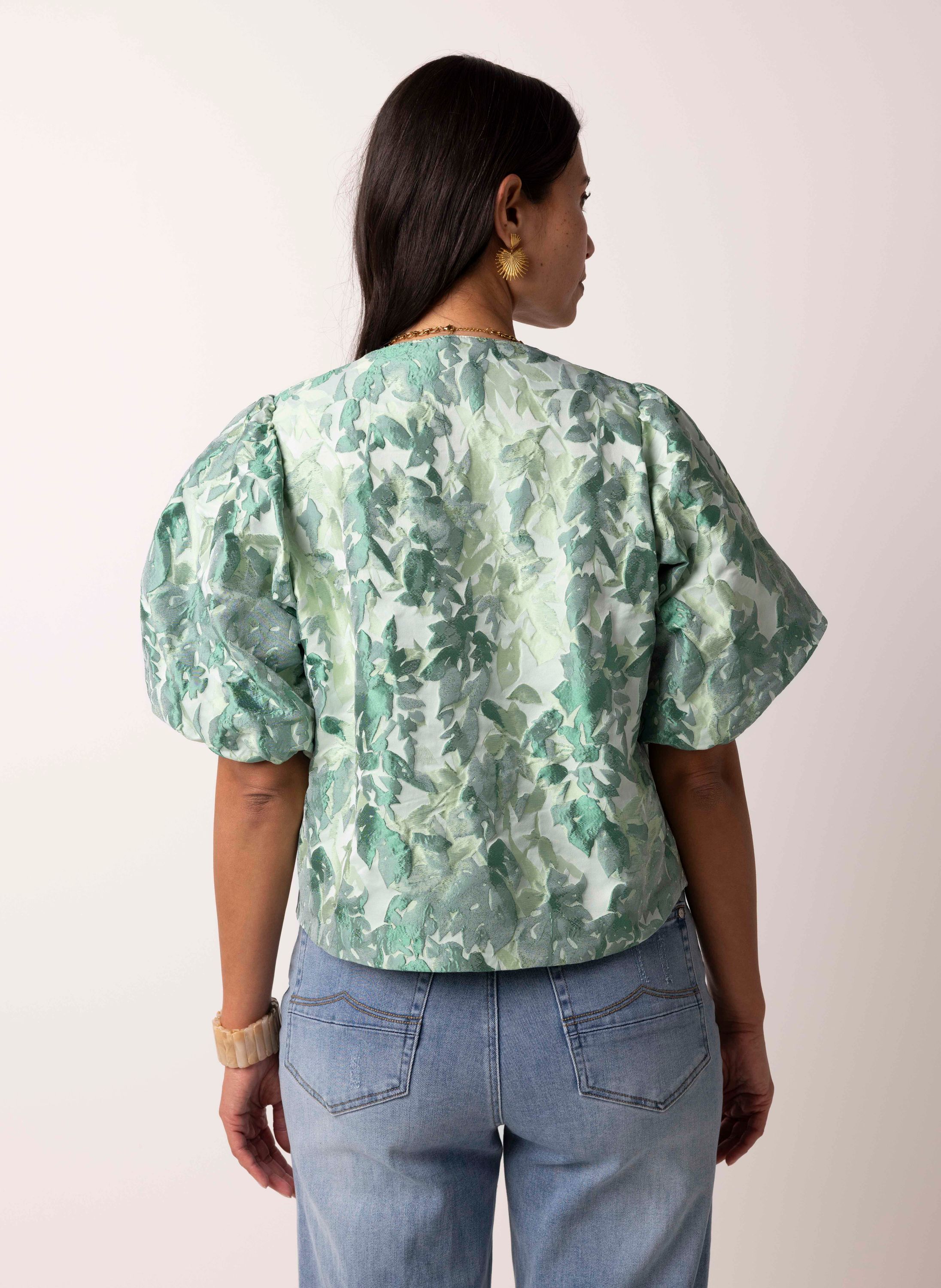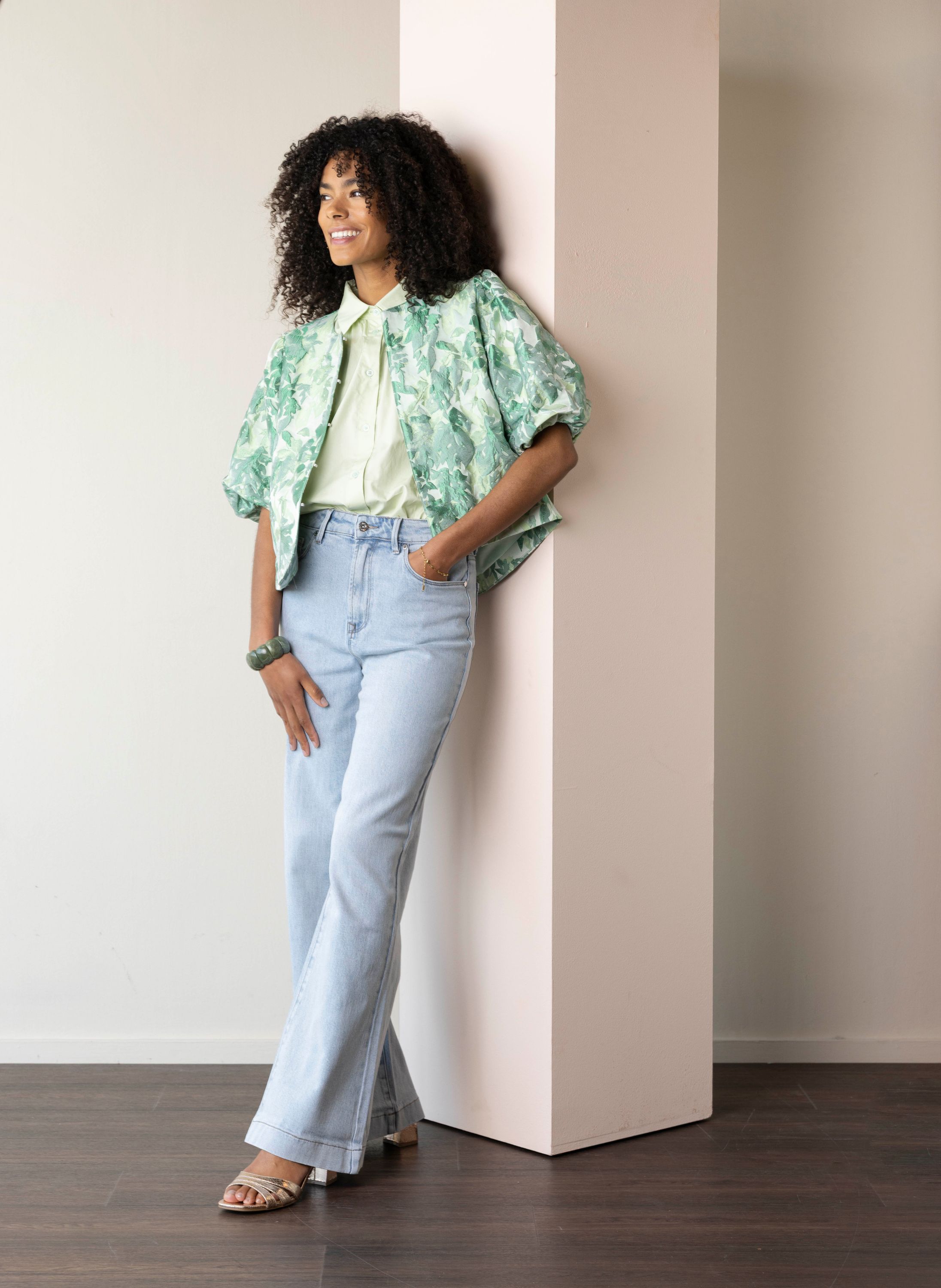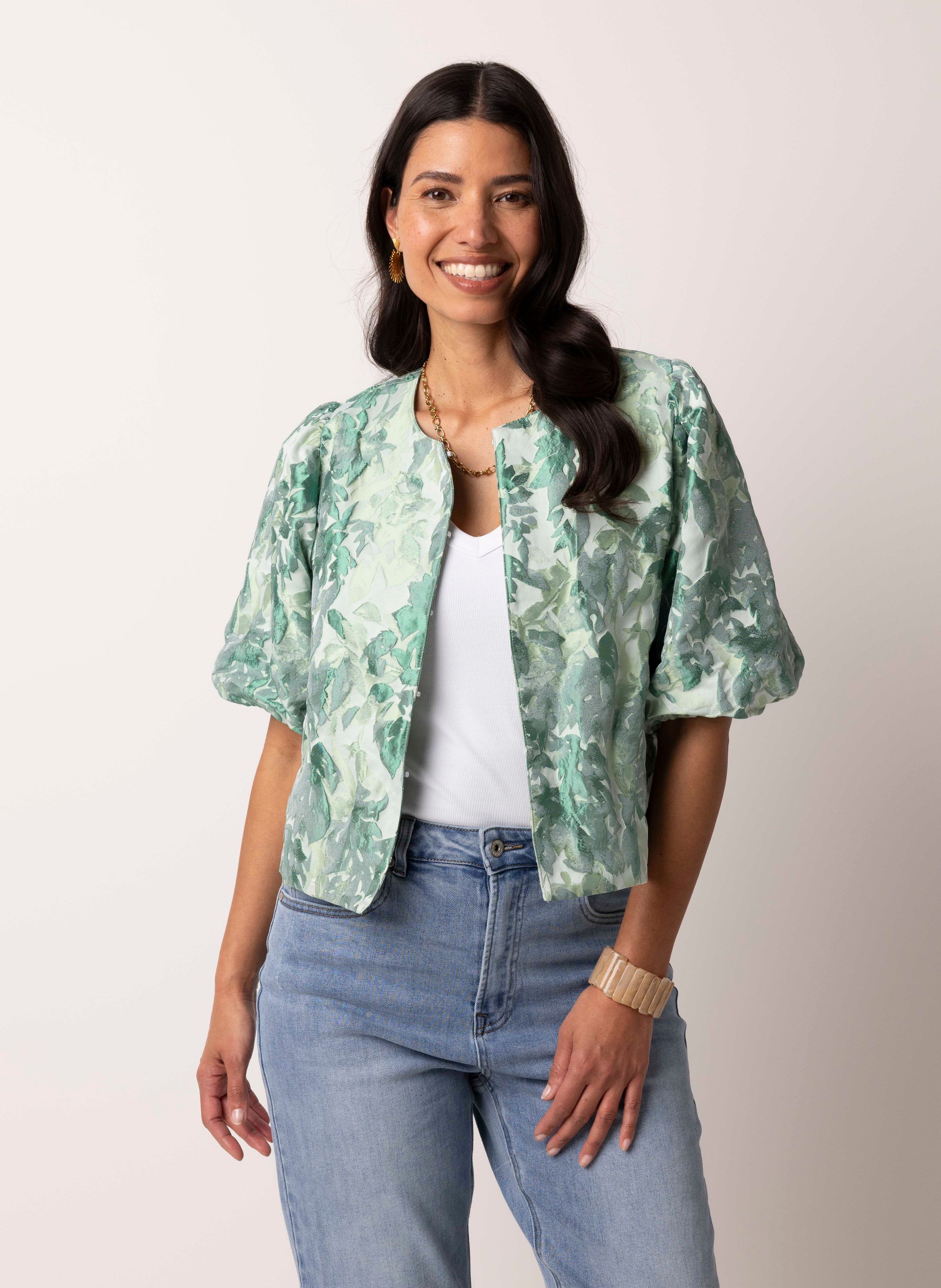 Dit jasje met ronde hals, korte pofmouwen en haakjessluiting heeft een speelse uitstraling.