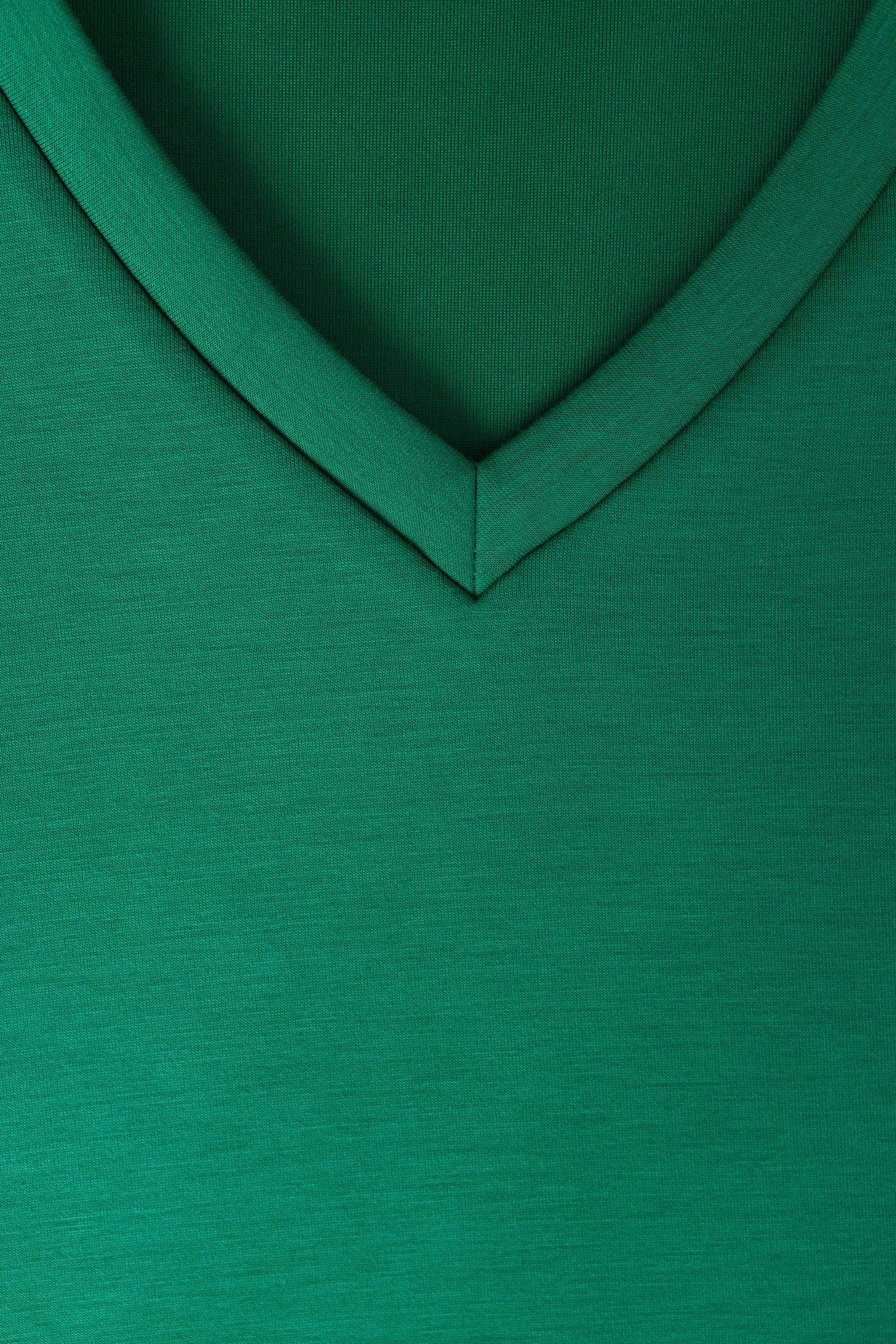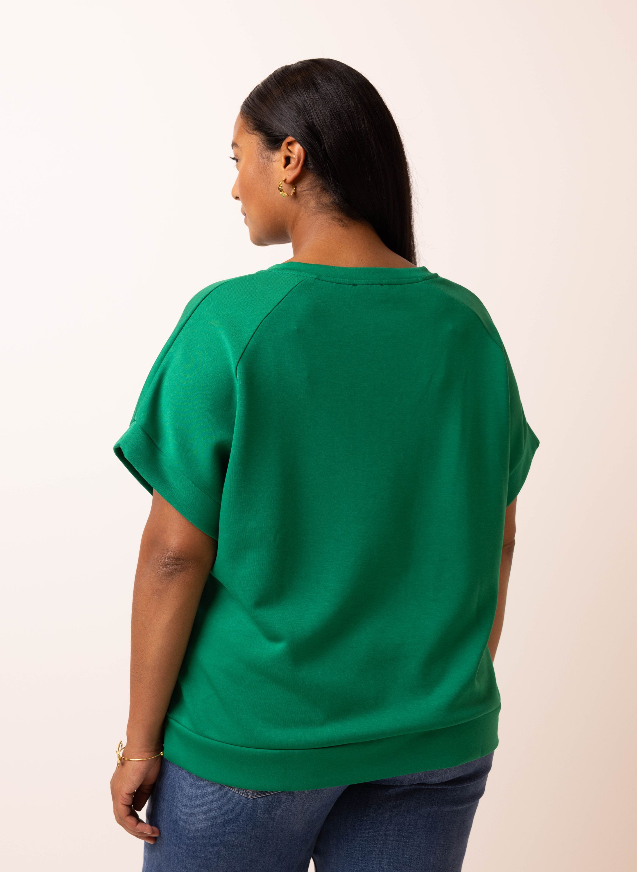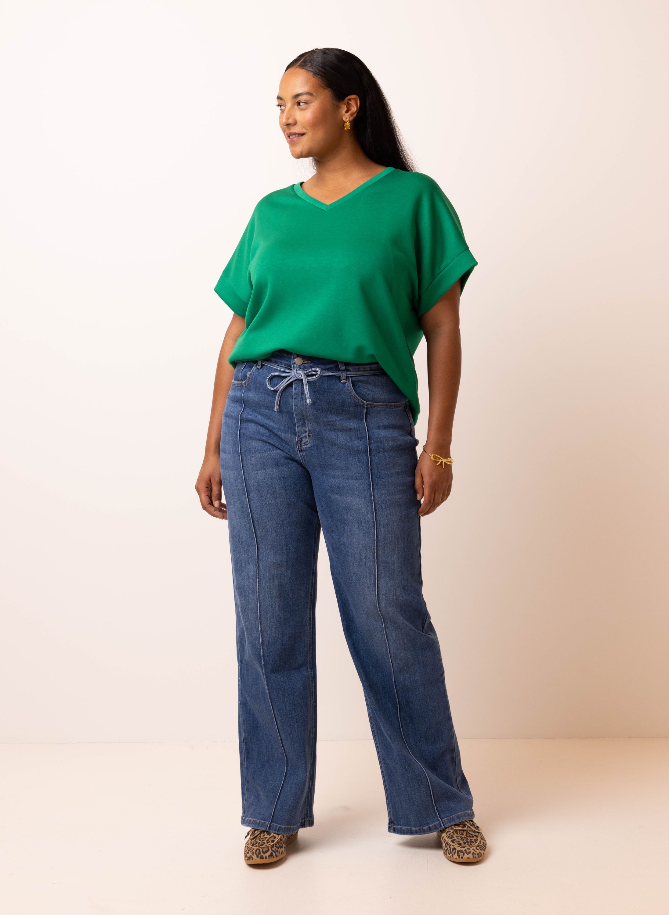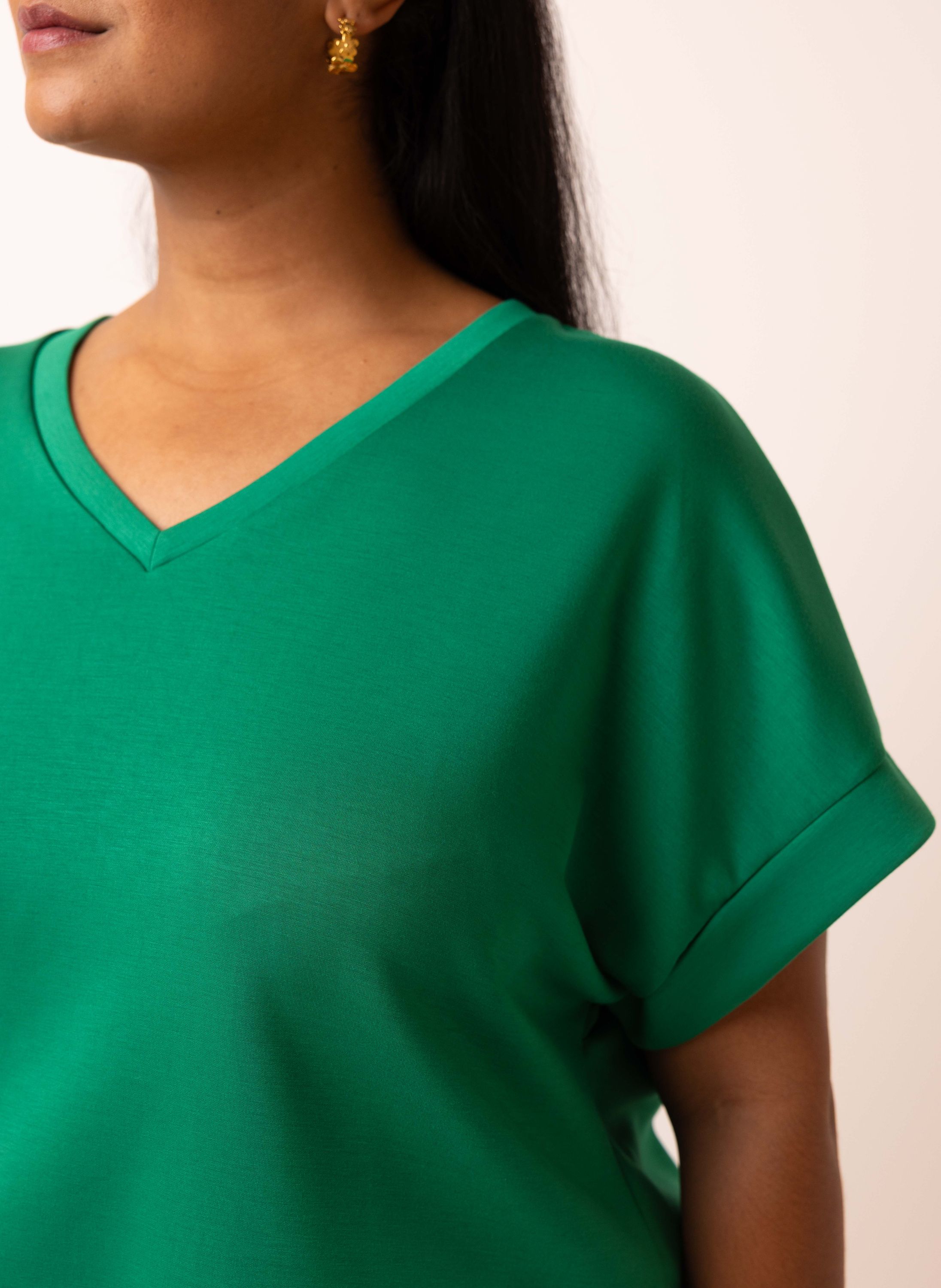 Dit shirt met V-hals heeft korte mouwen en kleine splitjes aan beide onderzijden.