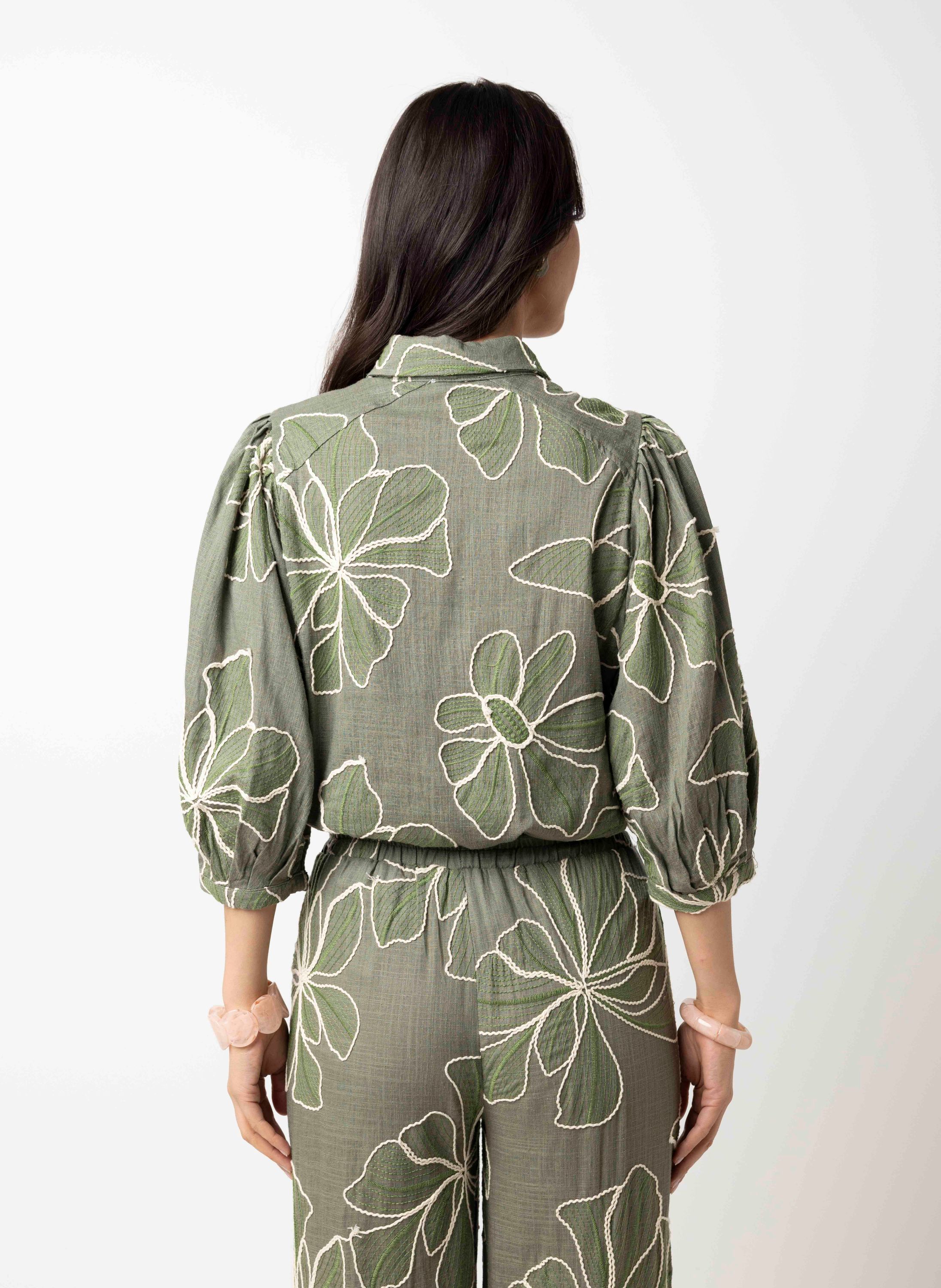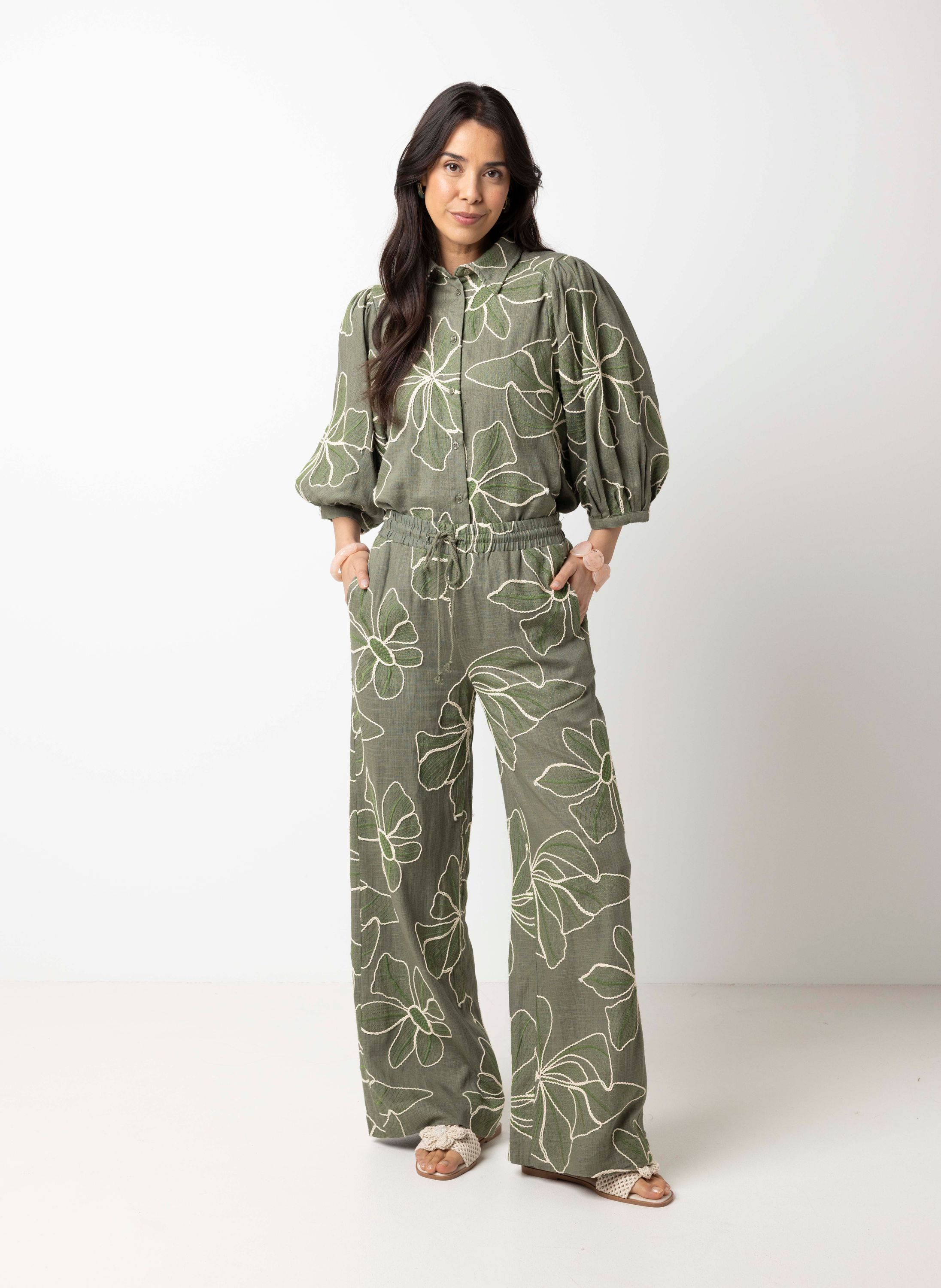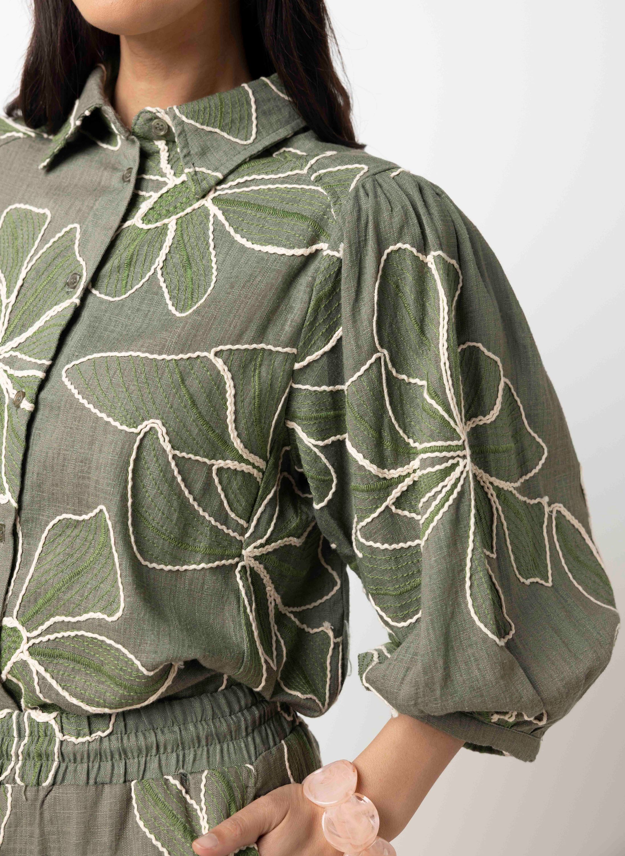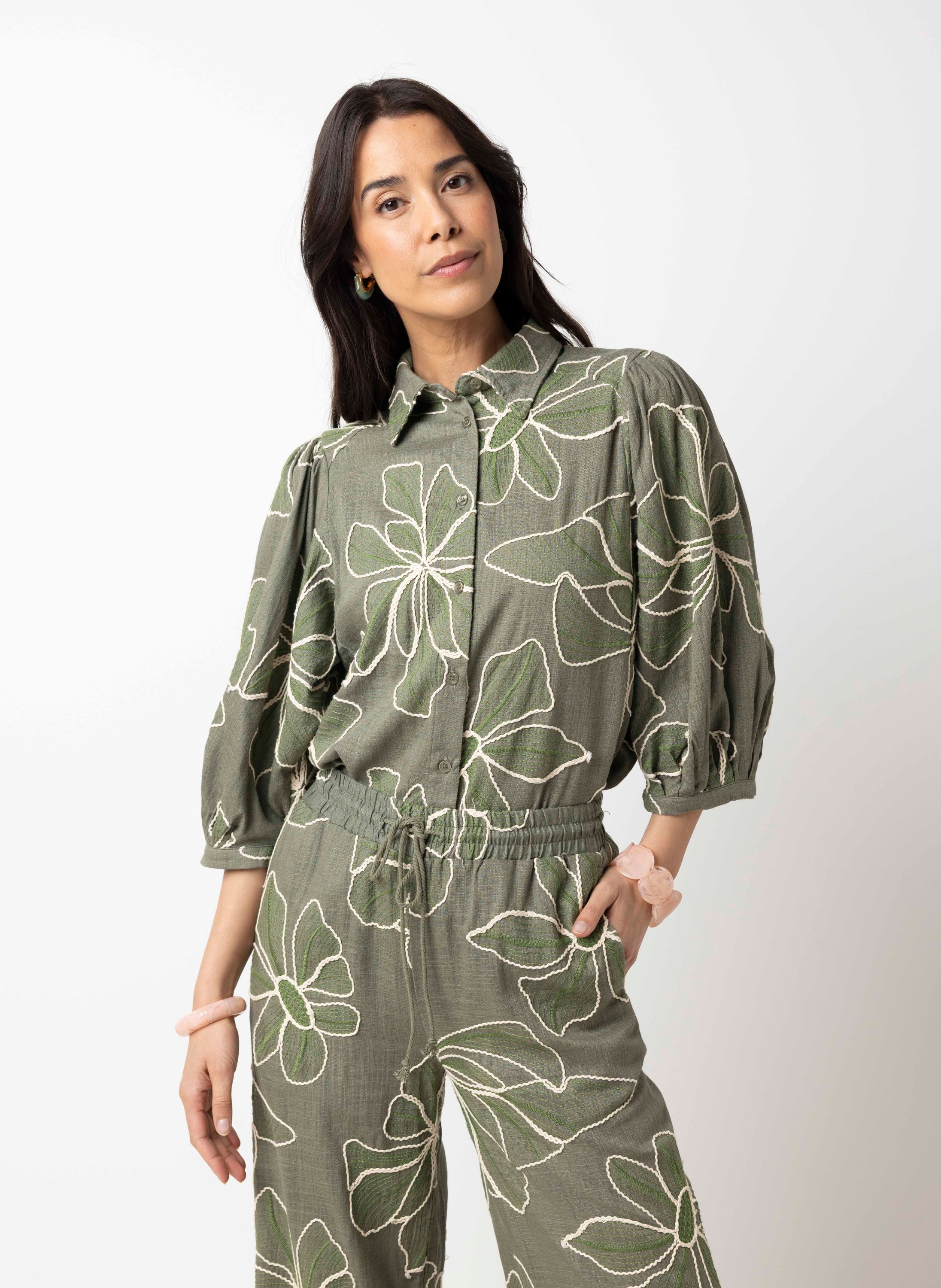 Deze blouse met klassieke kraag, knoopsluiting en driekwart mouwen maakt deel uit van een co-ord set.