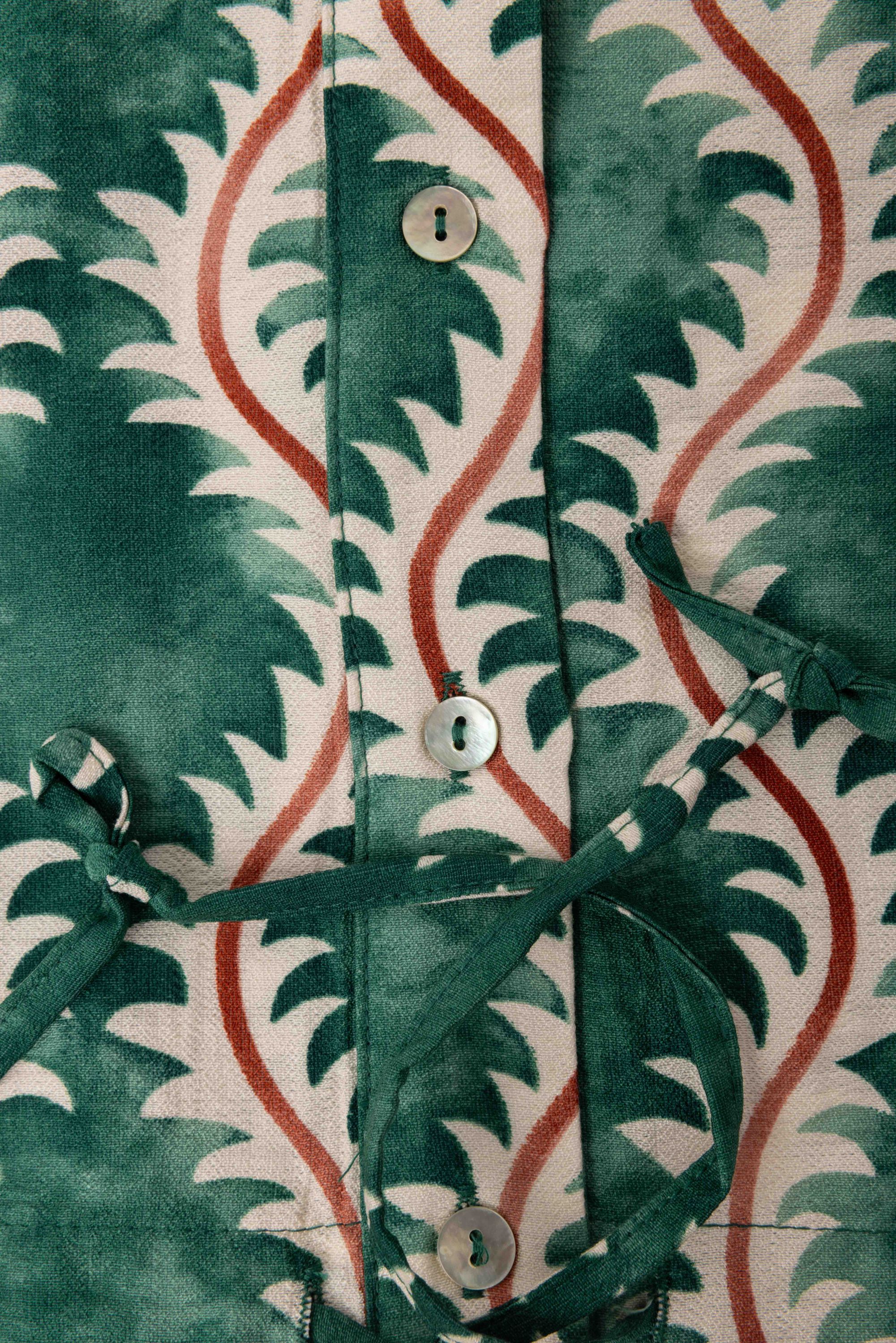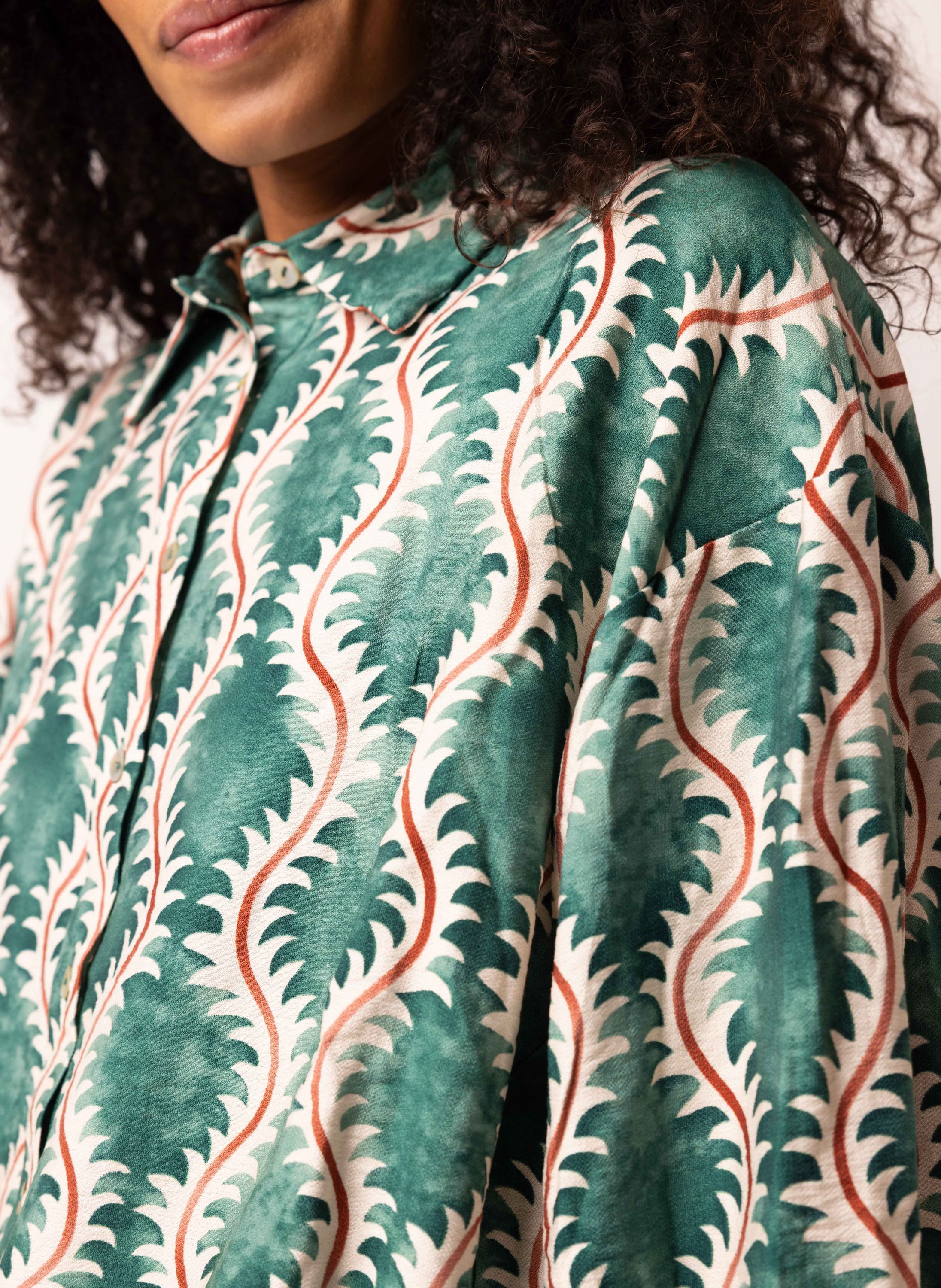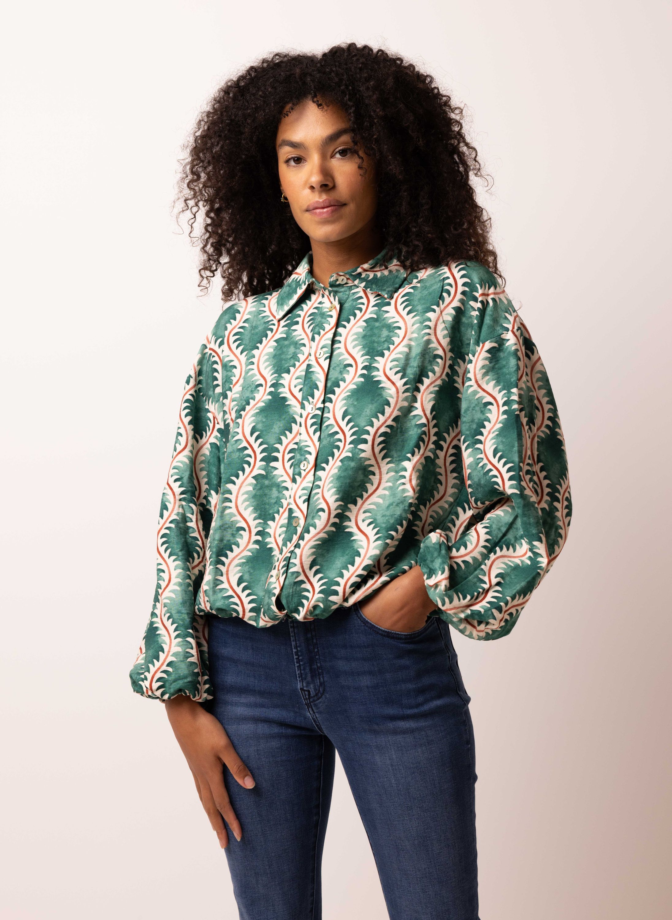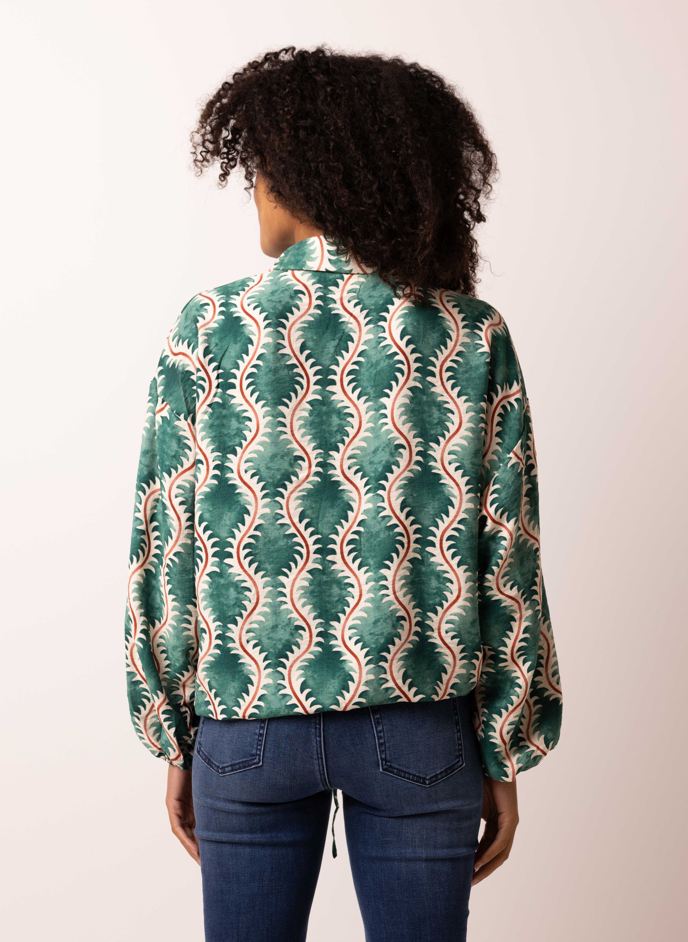 Deze groene blouse met ronde hals, knoopsluiting en lange mouwen met aan de onderzijde een elastische band heeft een golvende print en een koordje aan de onderkant waarmee je het model kunt tailleren.