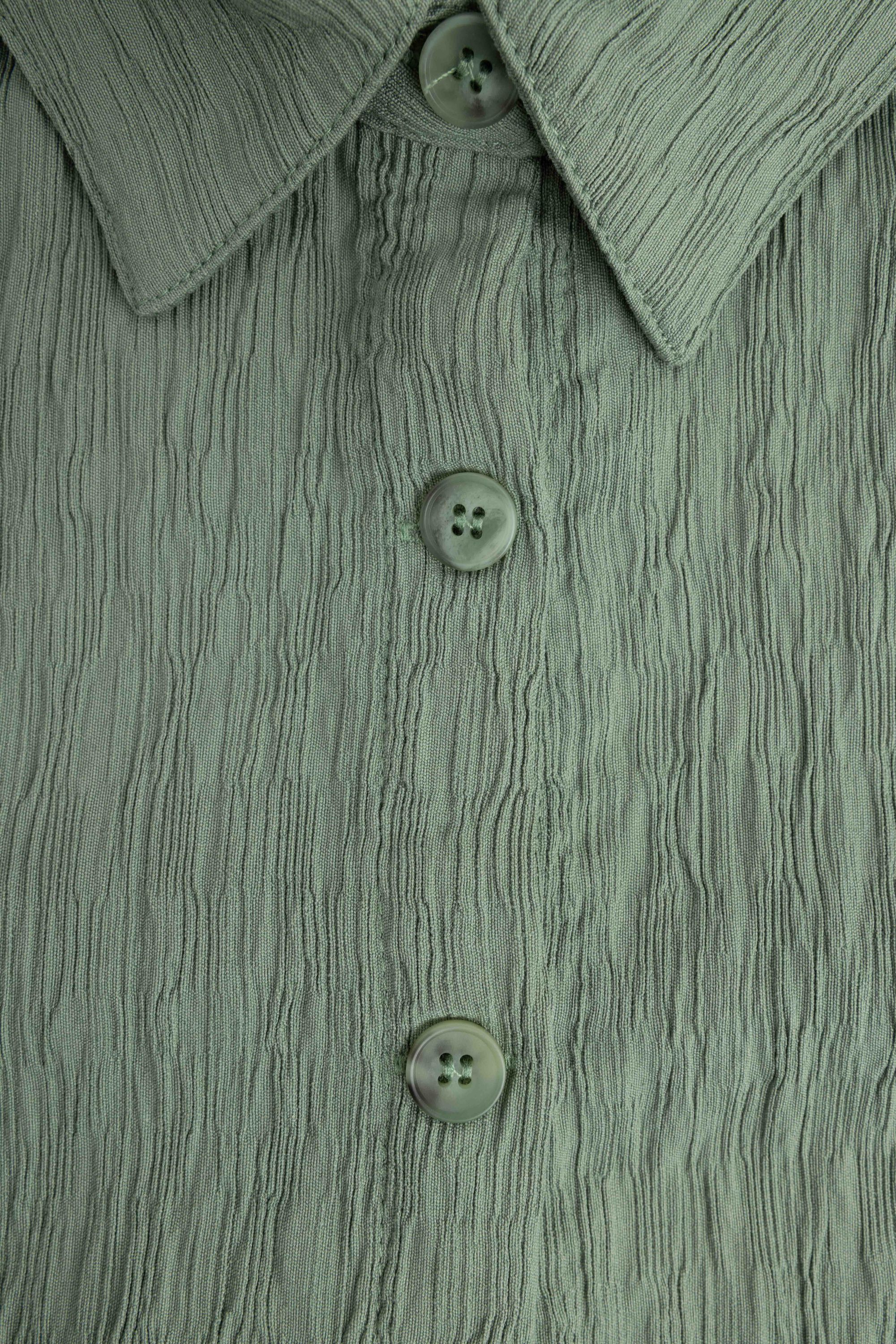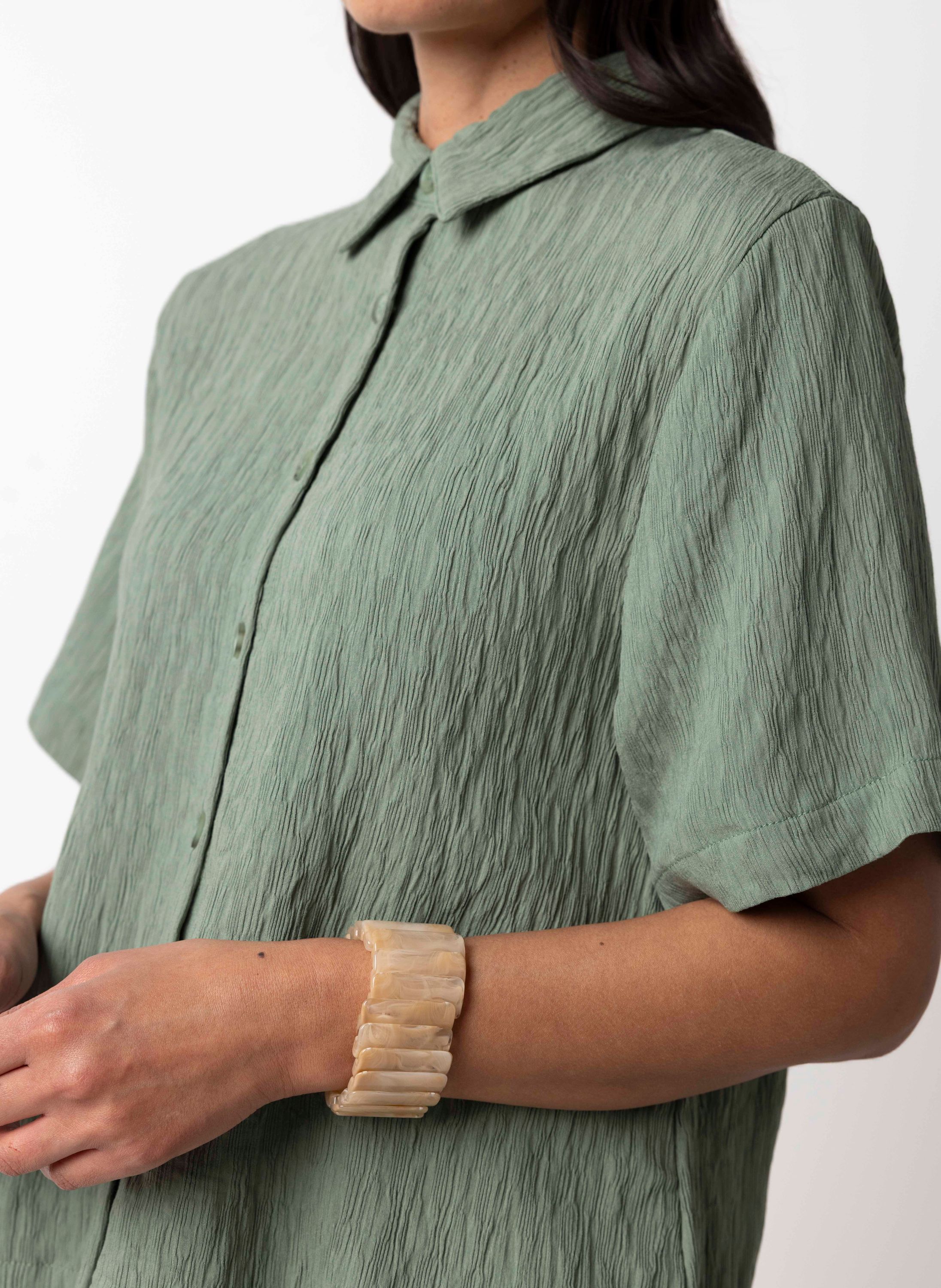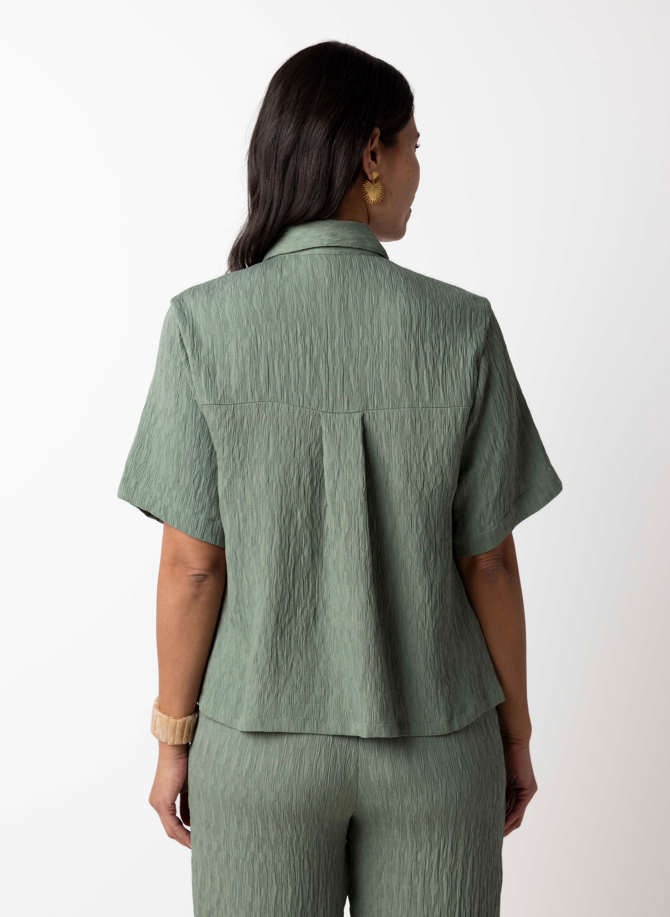Deze blouse met klassieke kraag, knoopsluiting en korte mouwen maakt deel uit van een co-ord set. Dit item kan gewassen worden op 30 graden met een fijnwasprogramma. Laat het kledingstuk binnenstebuiten hangend drogen. Na het drogen is strijken niet nodig. De structuur blijft ook na het wassen mooi in de stof behouden.