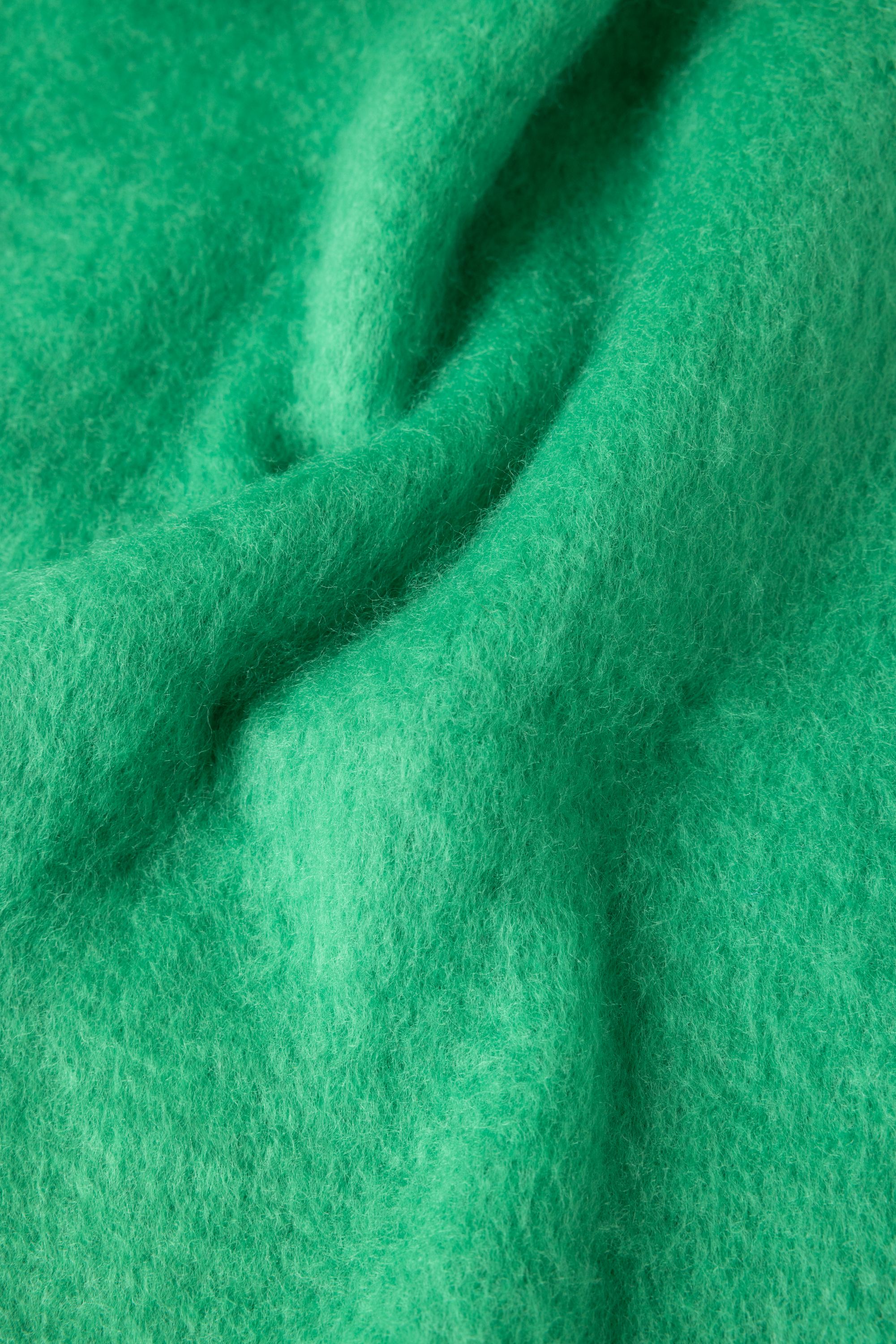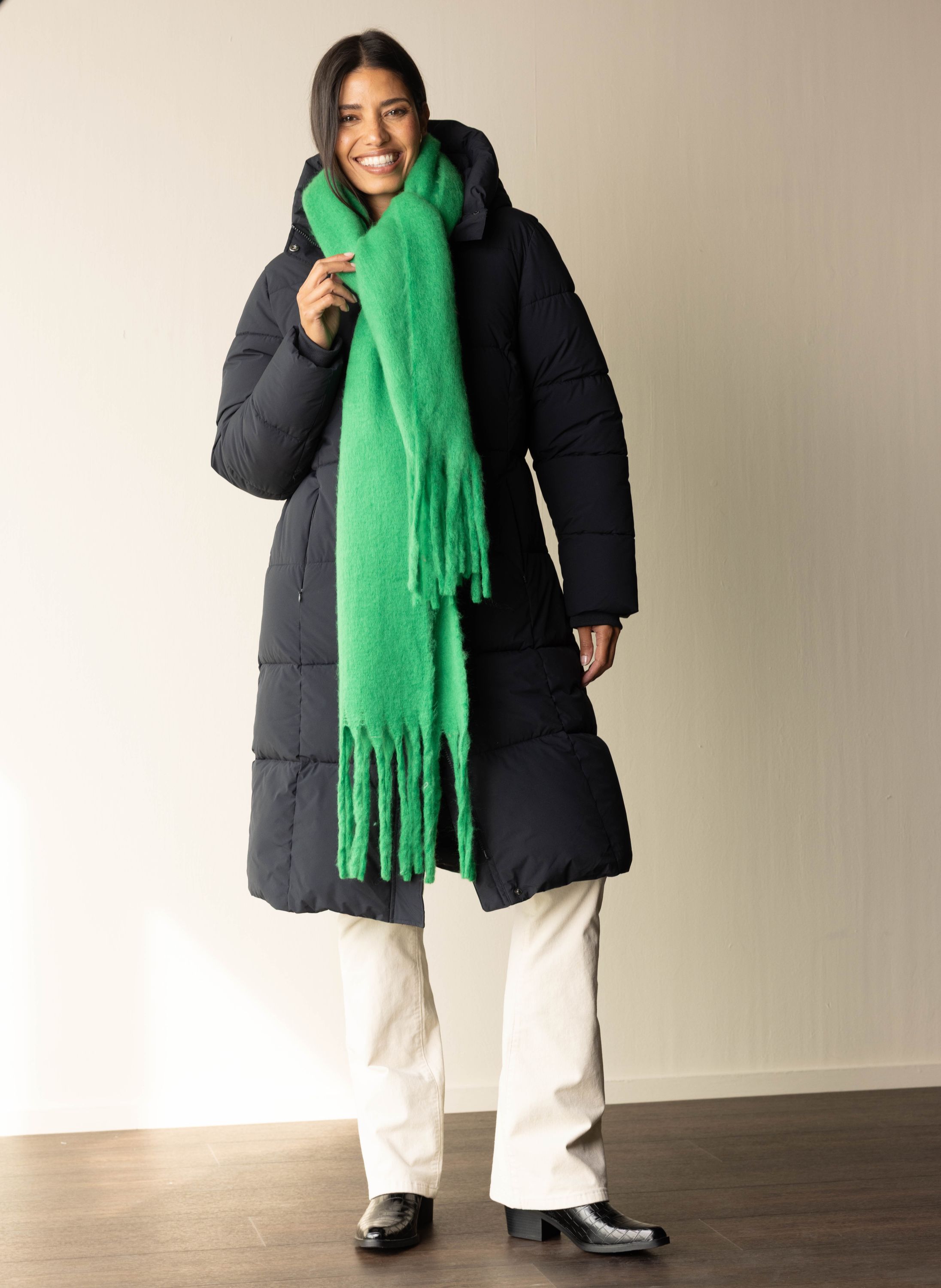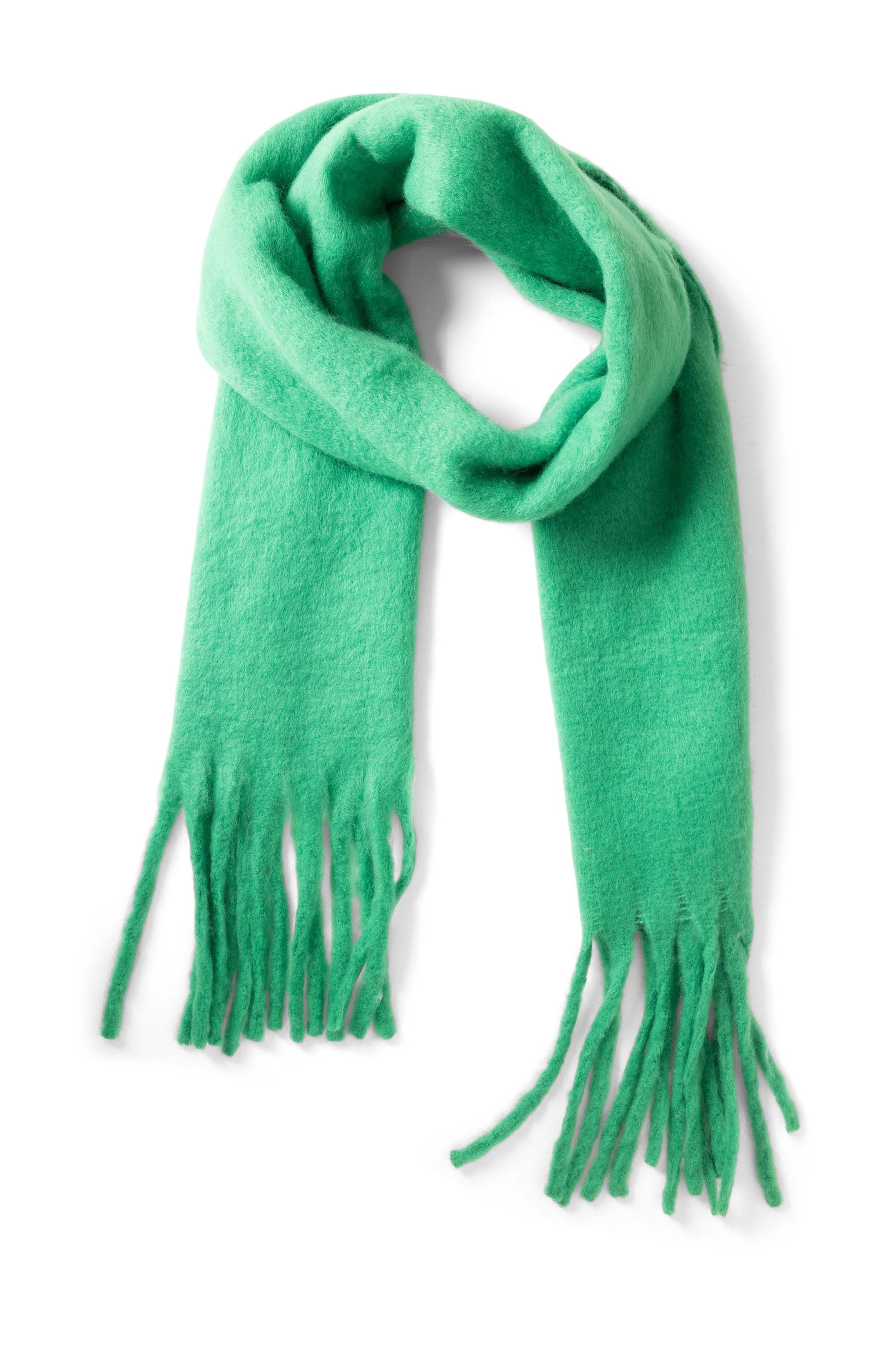 Deze gebreide zachte sjaal met franjes is een warm laagje voor frisse dagen.
