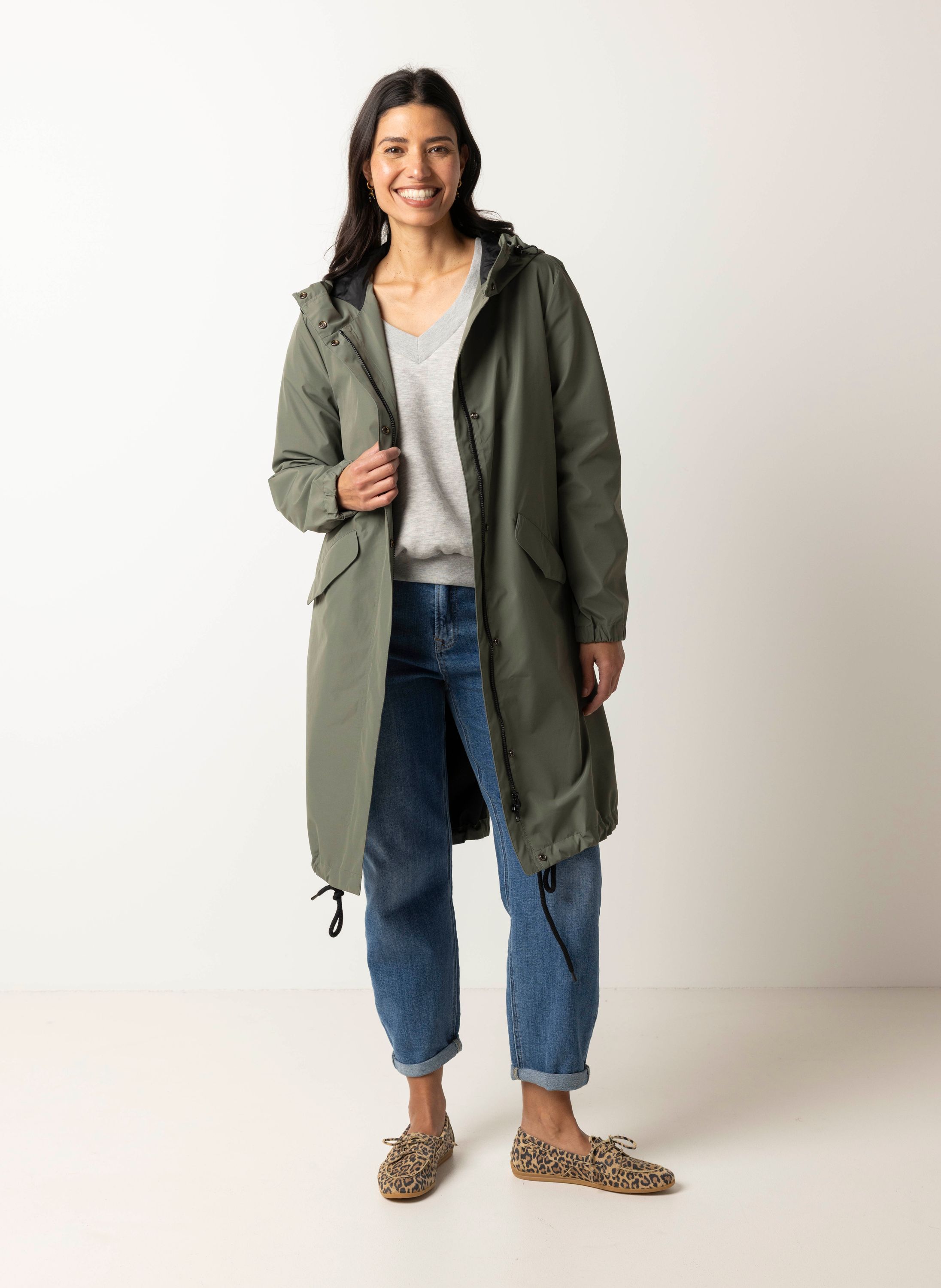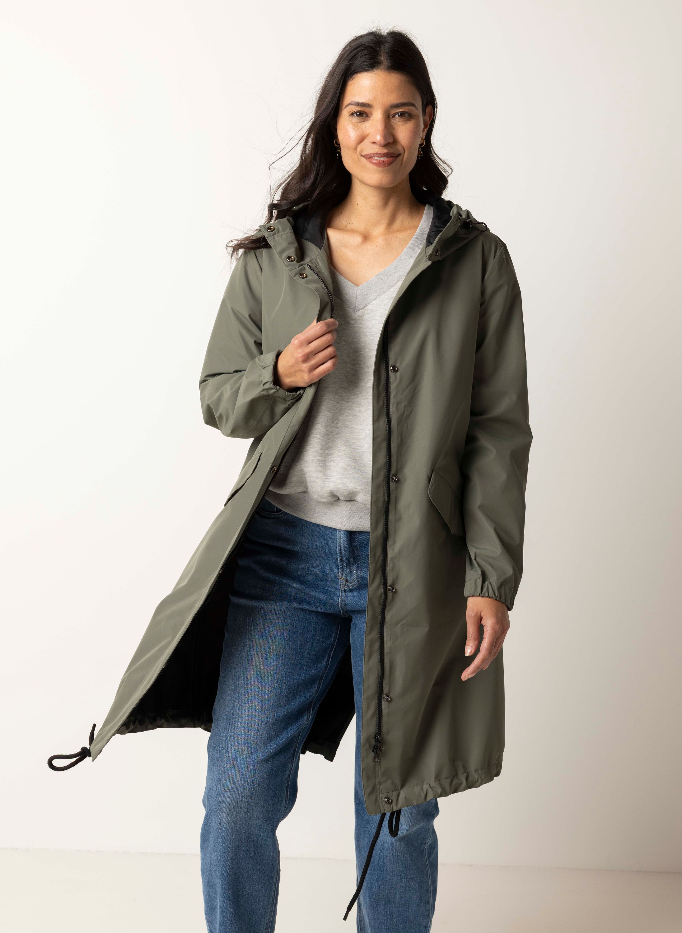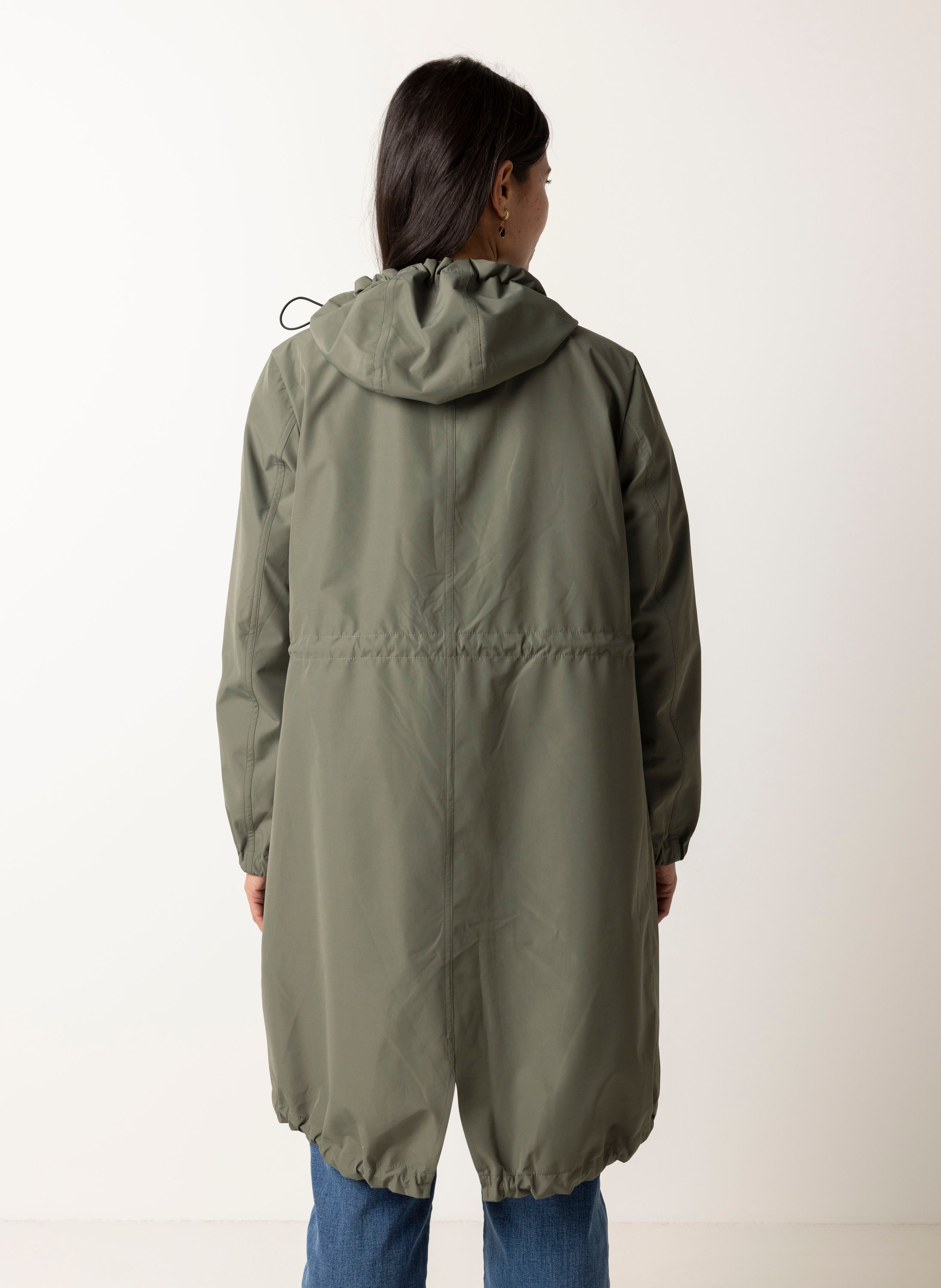 Deze groene parka heeft een capuchon, rits- en knoopsluiting en ruime klepzakken aan de voorzijde. Het lange model en het trekkoord aan de onderzijde zorgen voor een comfortabele pasvorm. De taille is aan de binnenzijde te tailleren met een trekkoord, voor een vrouwelijke look. Onder de oksels zitten ventilatiegaatjes voor extra draagcomfort en ook de capuchon is verstelbaar met een trekkoord.