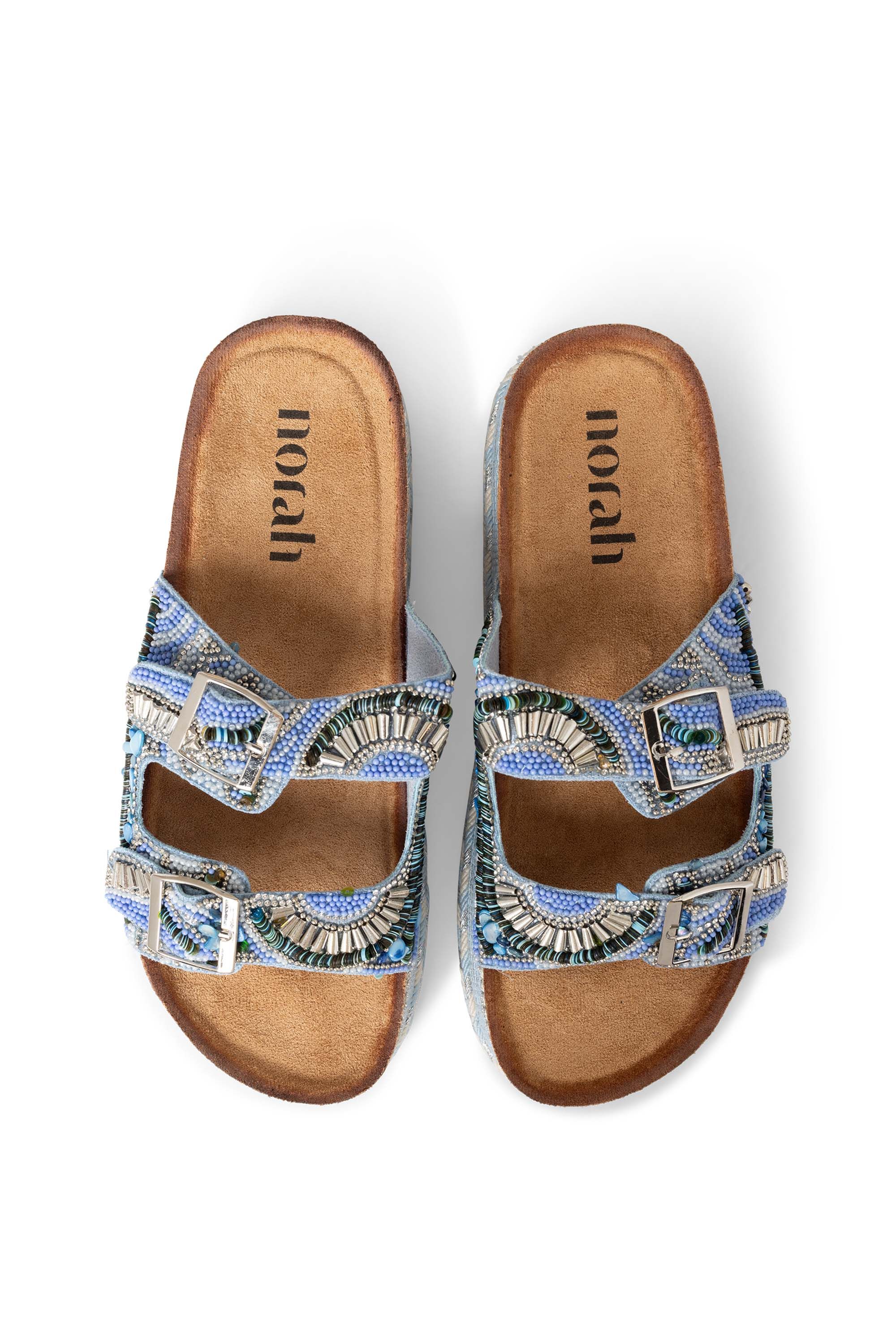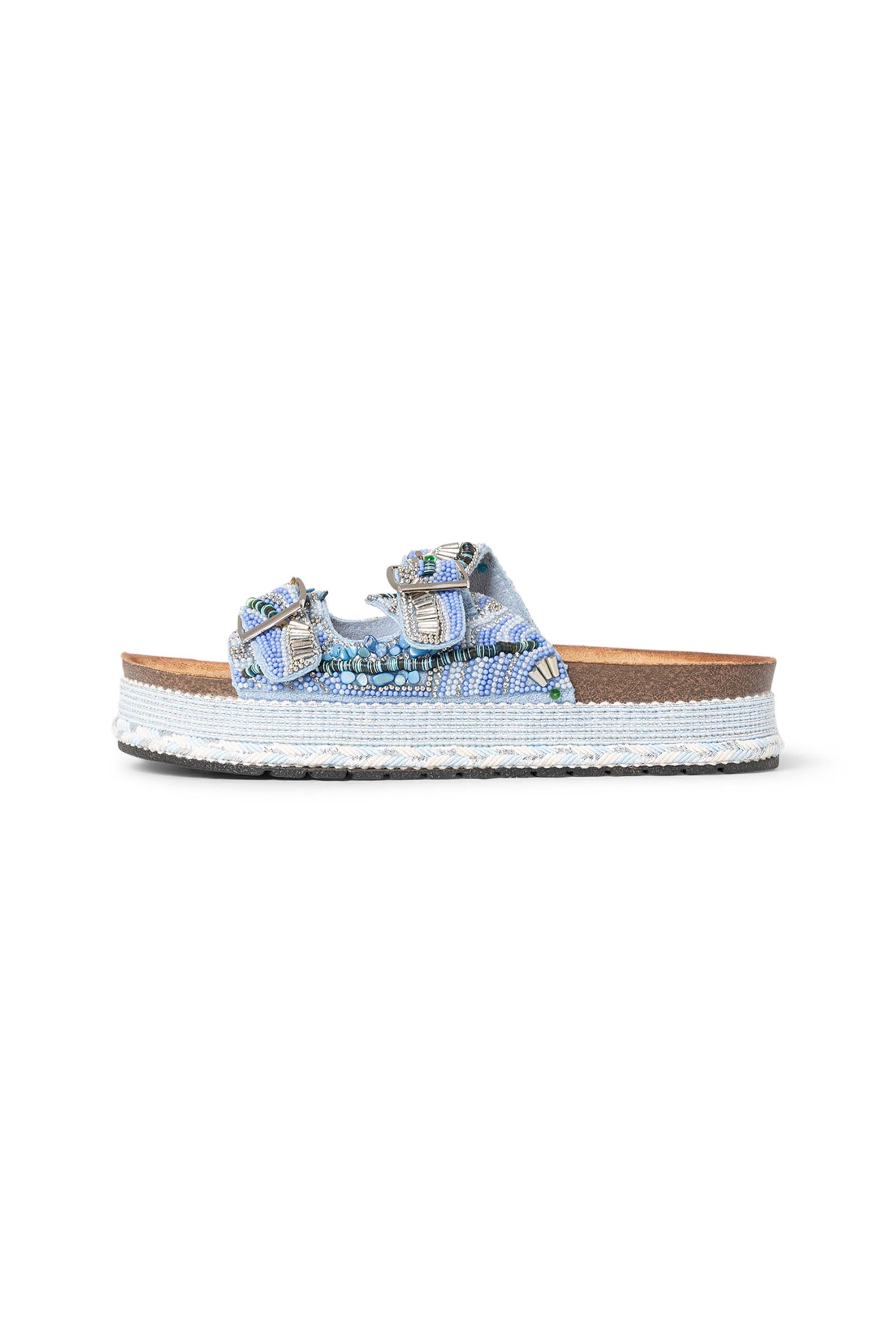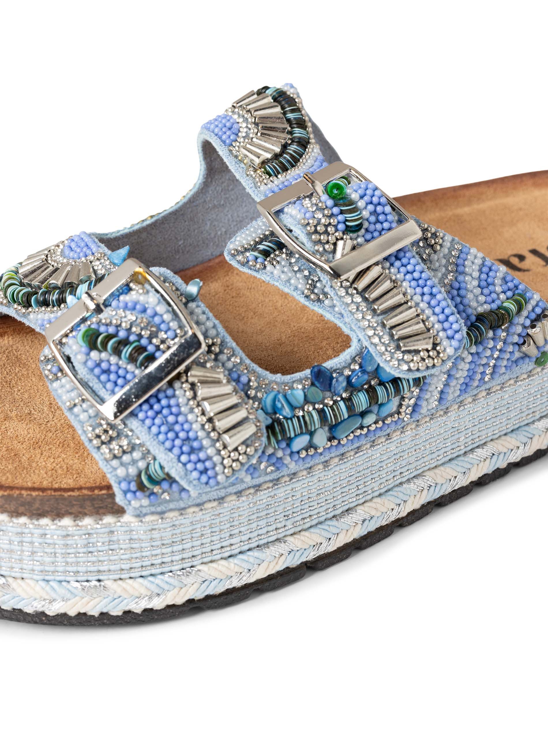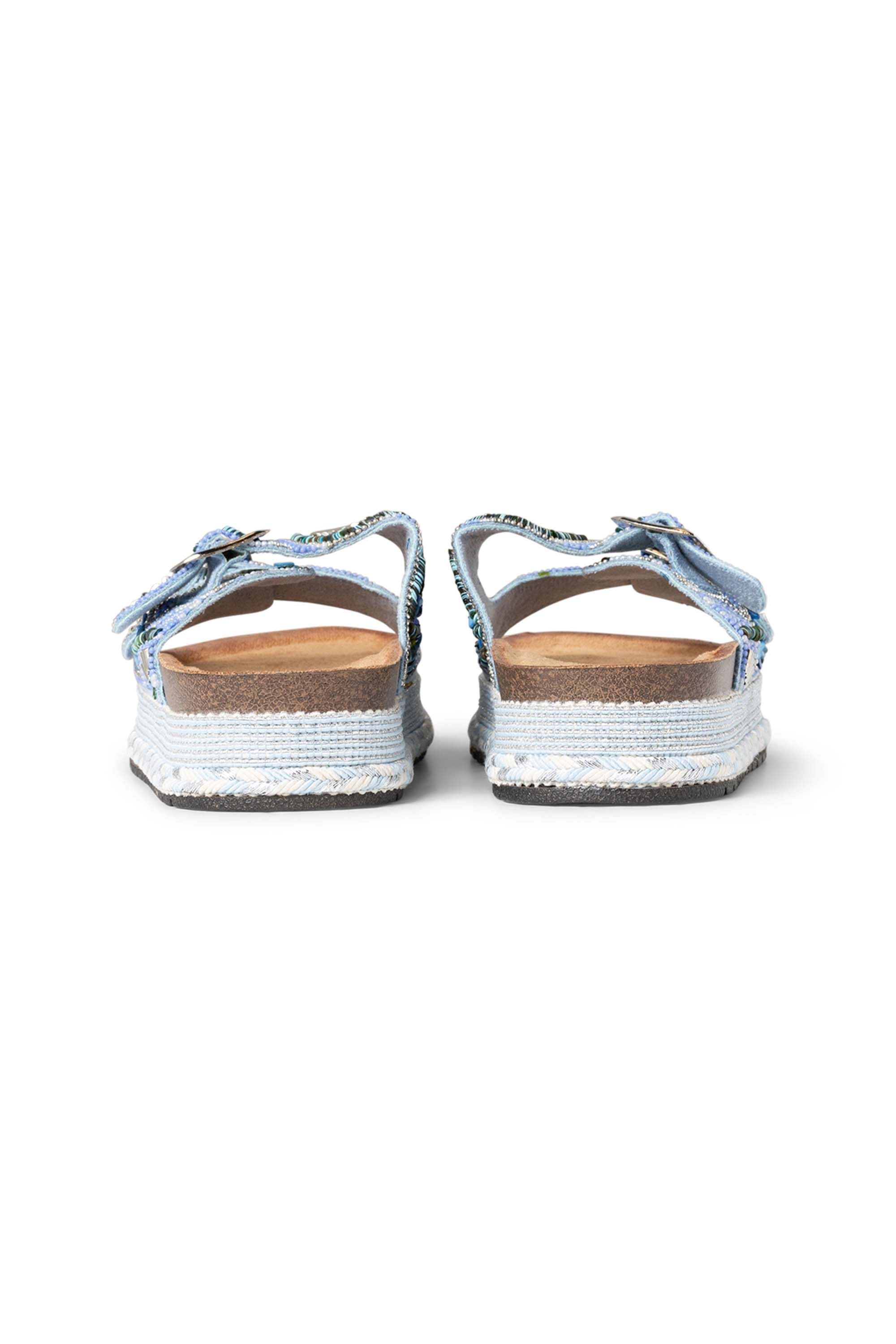 Deze slipper met gespen hebben een dikke zool van 4 cm en een rand met gekleurd touw voor een zomerse touch. De verstelbare gespen zorgen voor een goede pasvorm en het zachte voetbed biedt extra comfort. Deze slipper valt één maat kleiner. We adviseren je een maat groter te nemen.