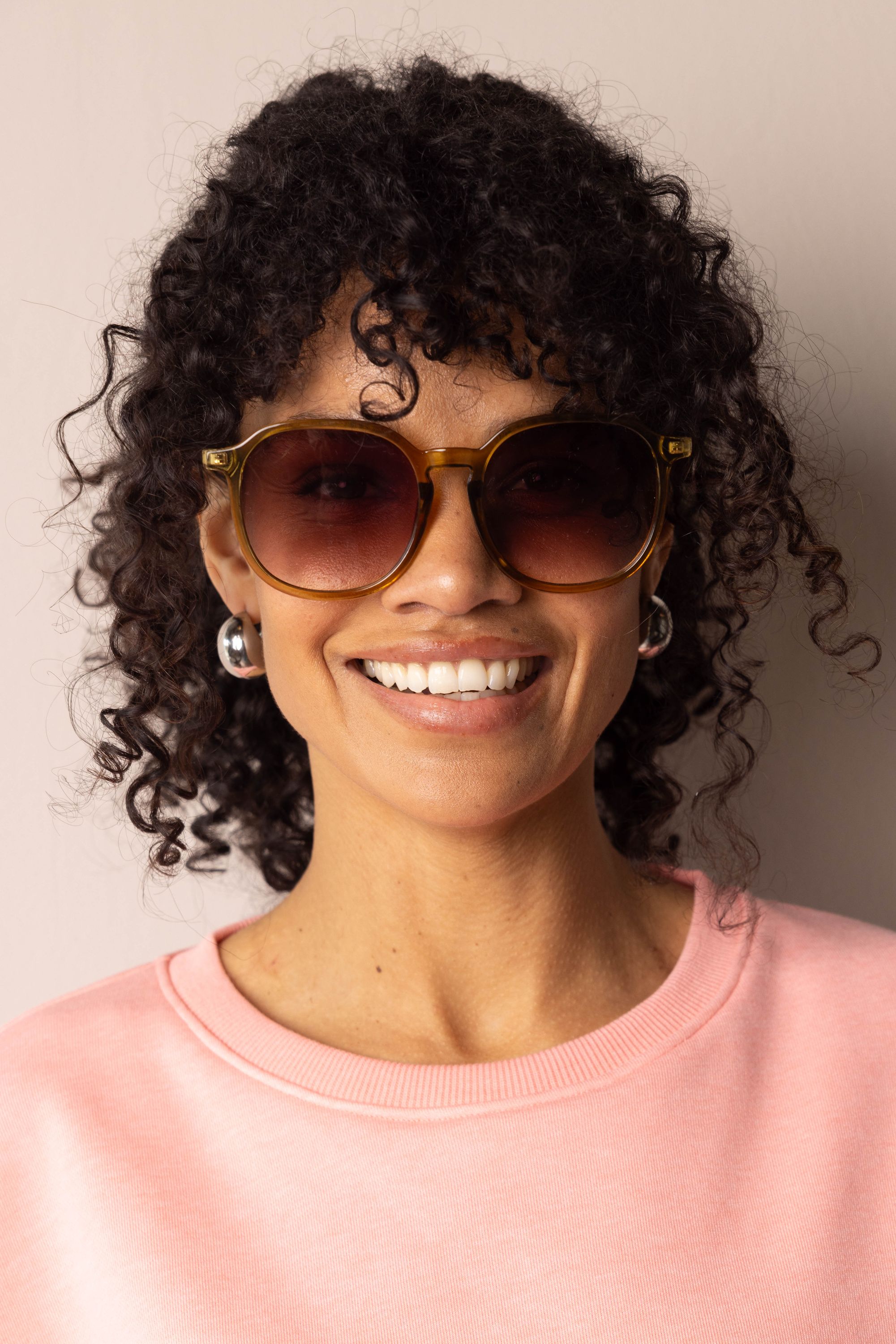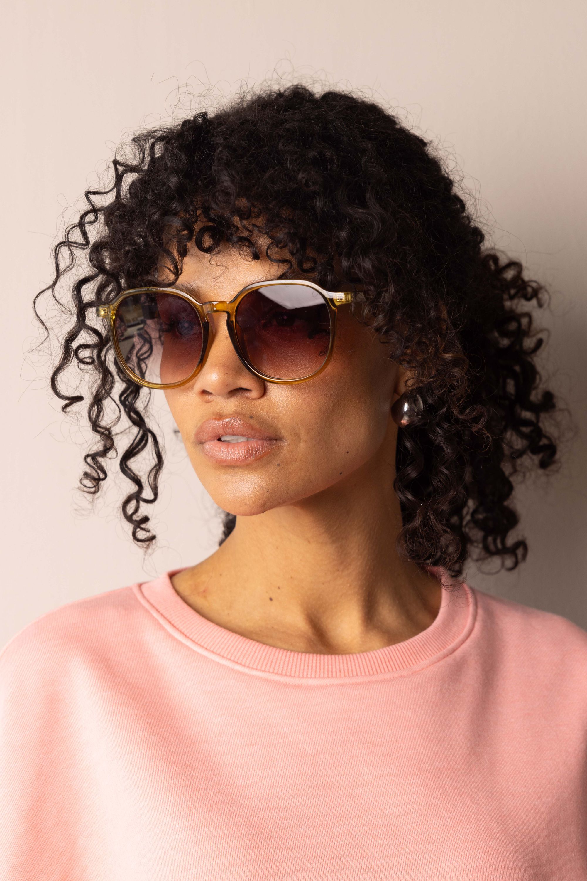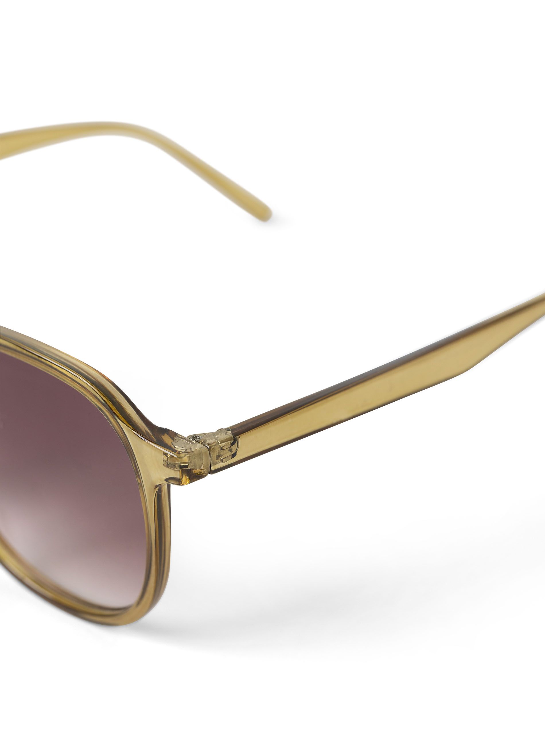 Zonnebril met groen montuur en lichtbruine glazen.