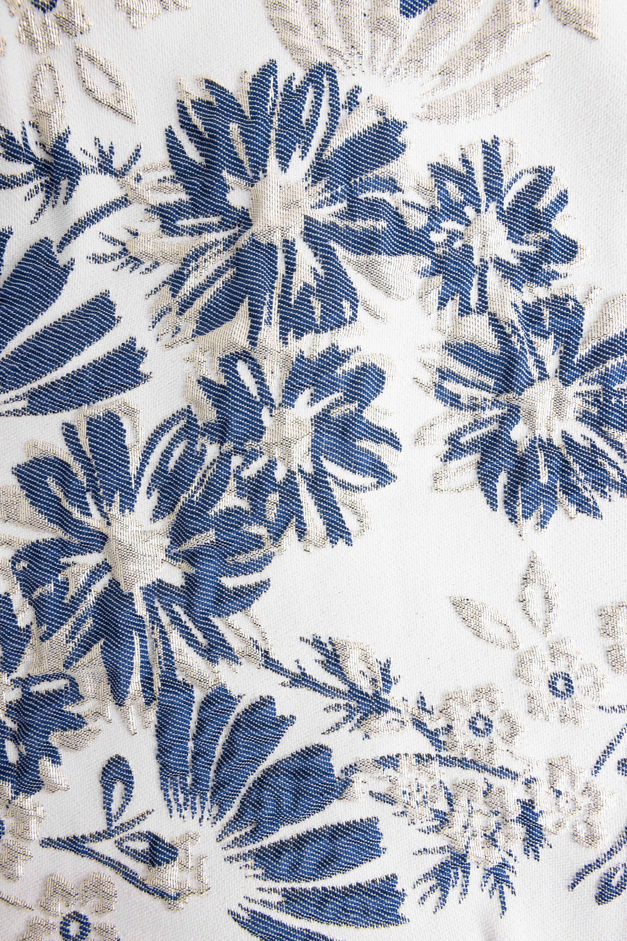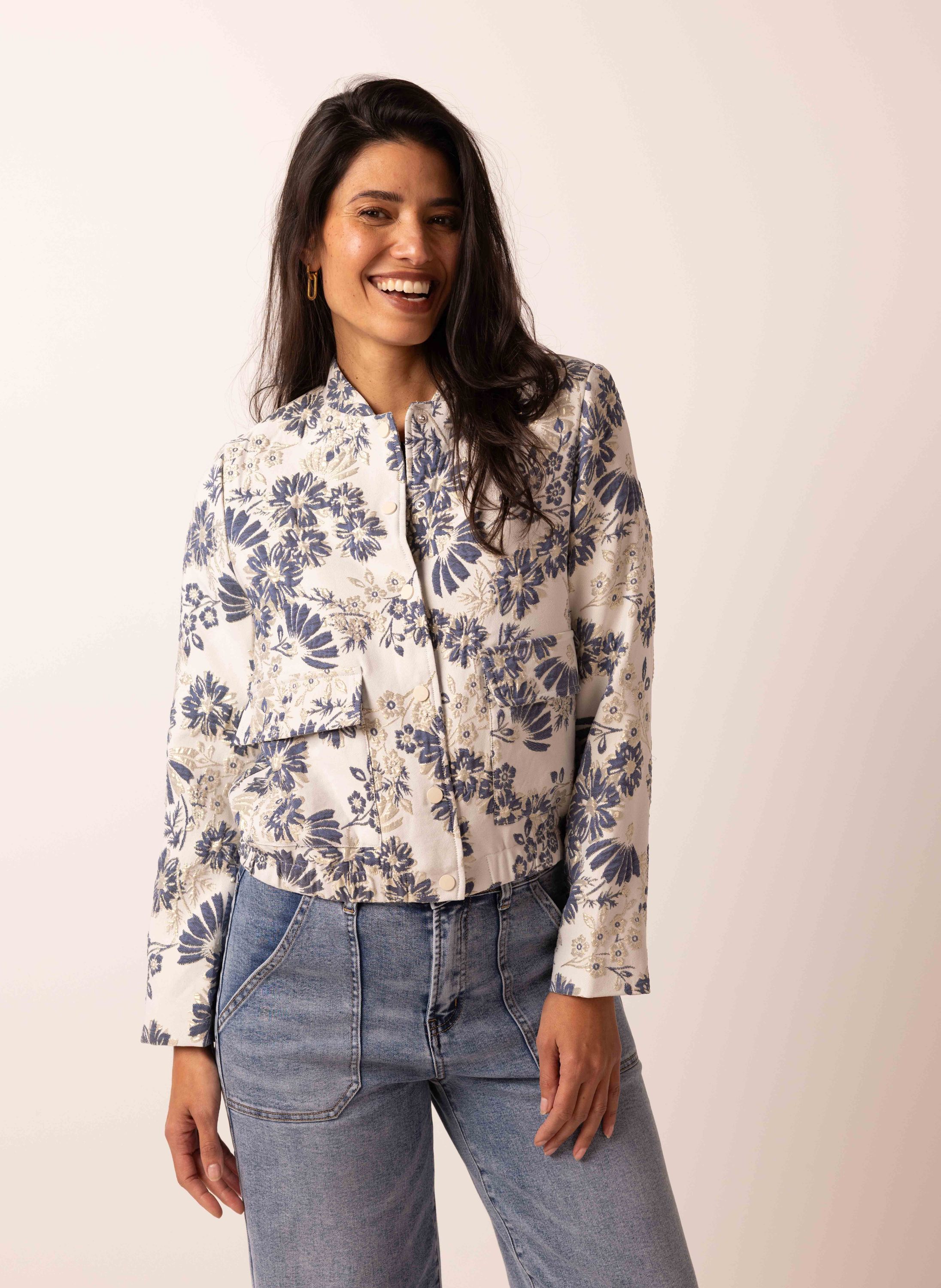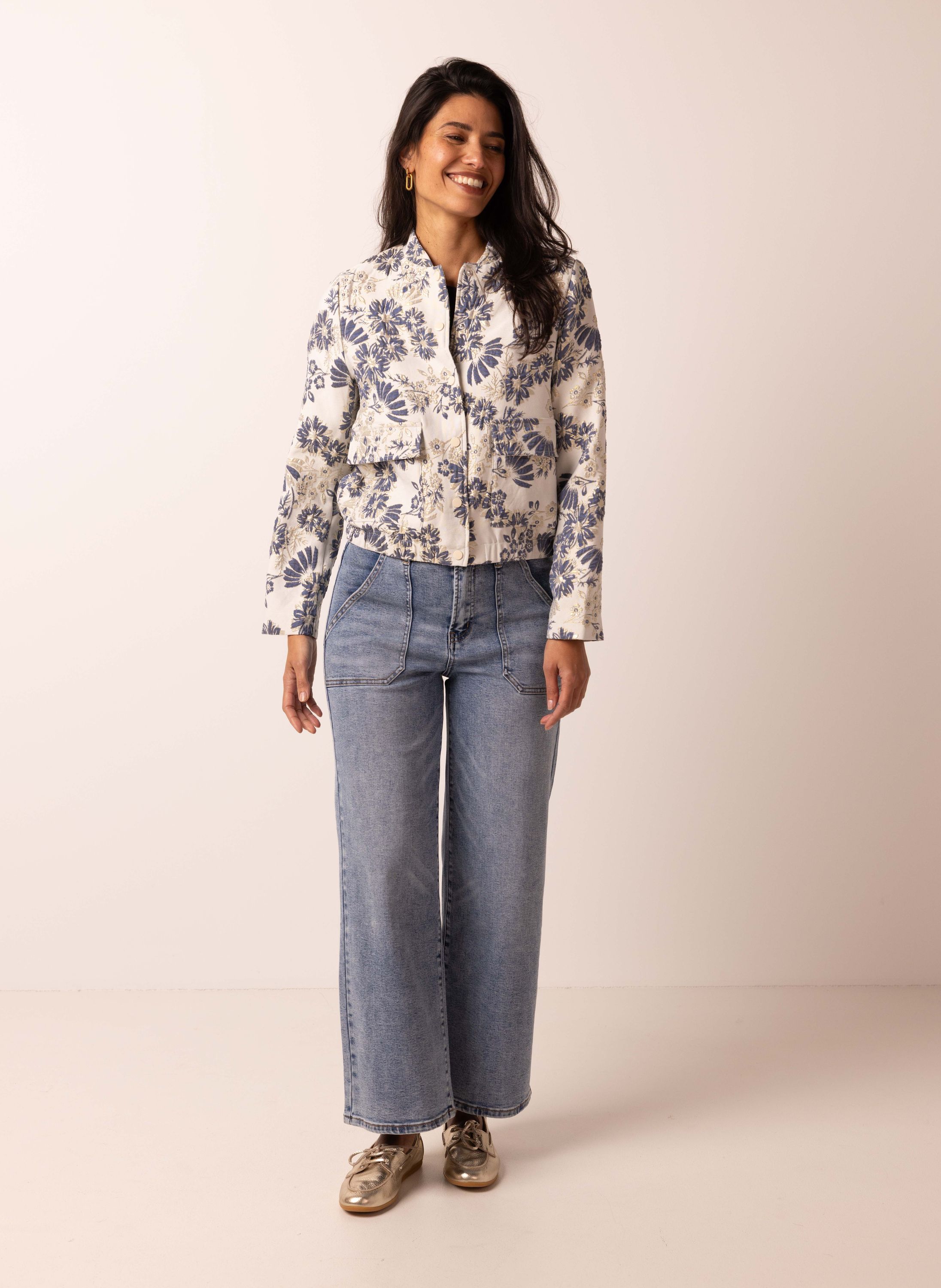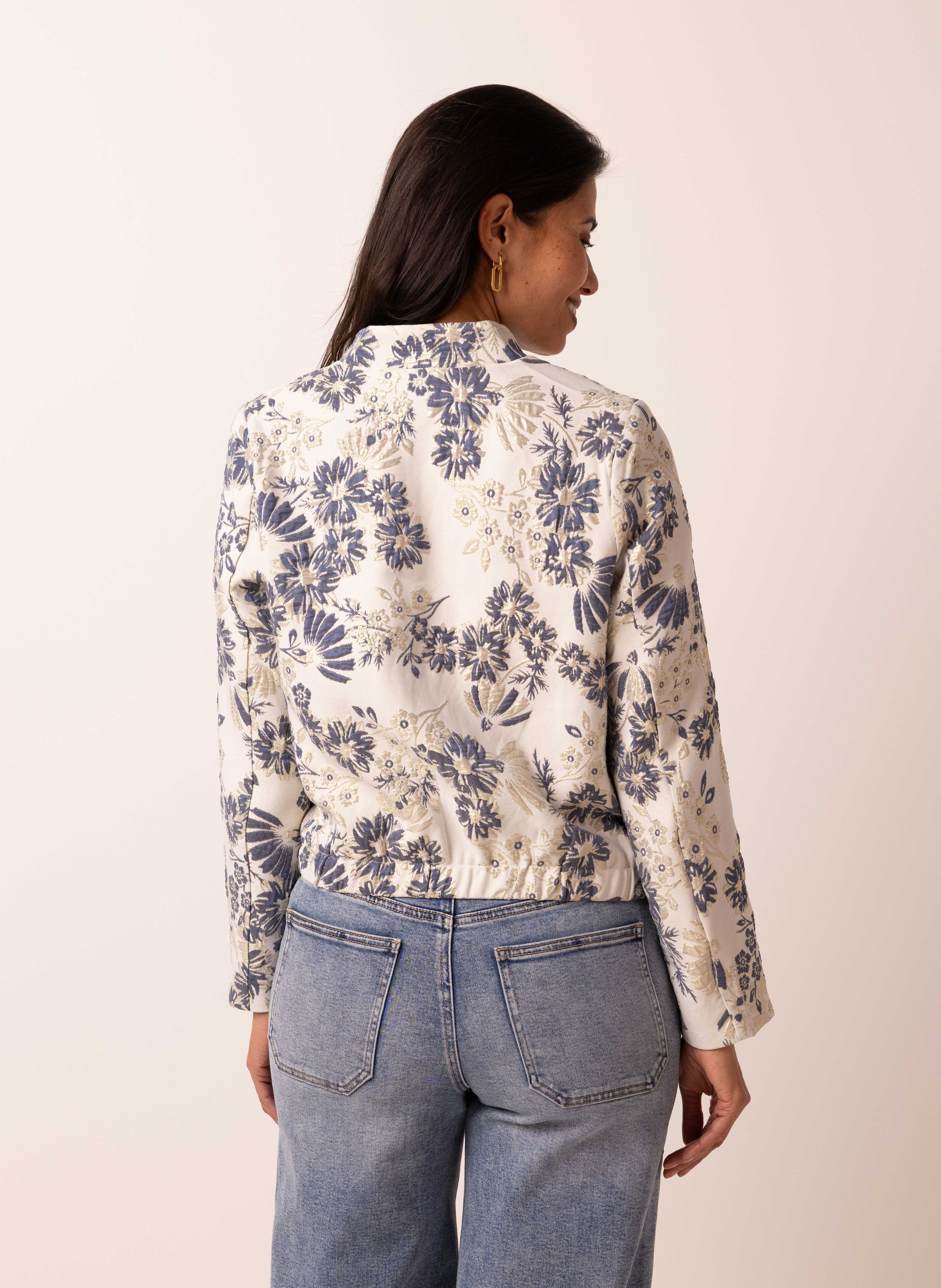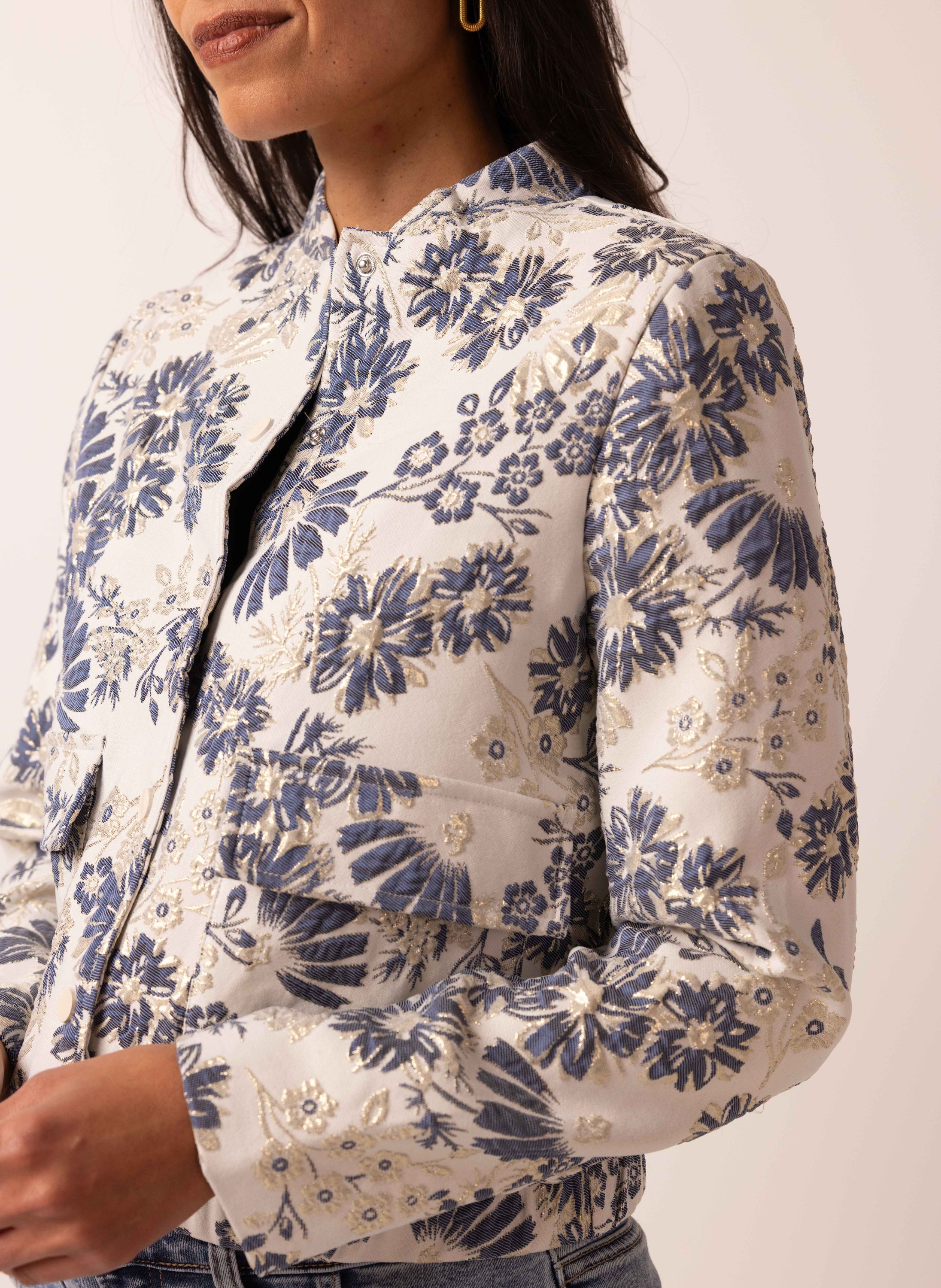 Dit jasje heeft een bloemenprint, een klassieke kraag en een knoopsluiting aan de voorzijde voor een vrouwelijke uitstraling.