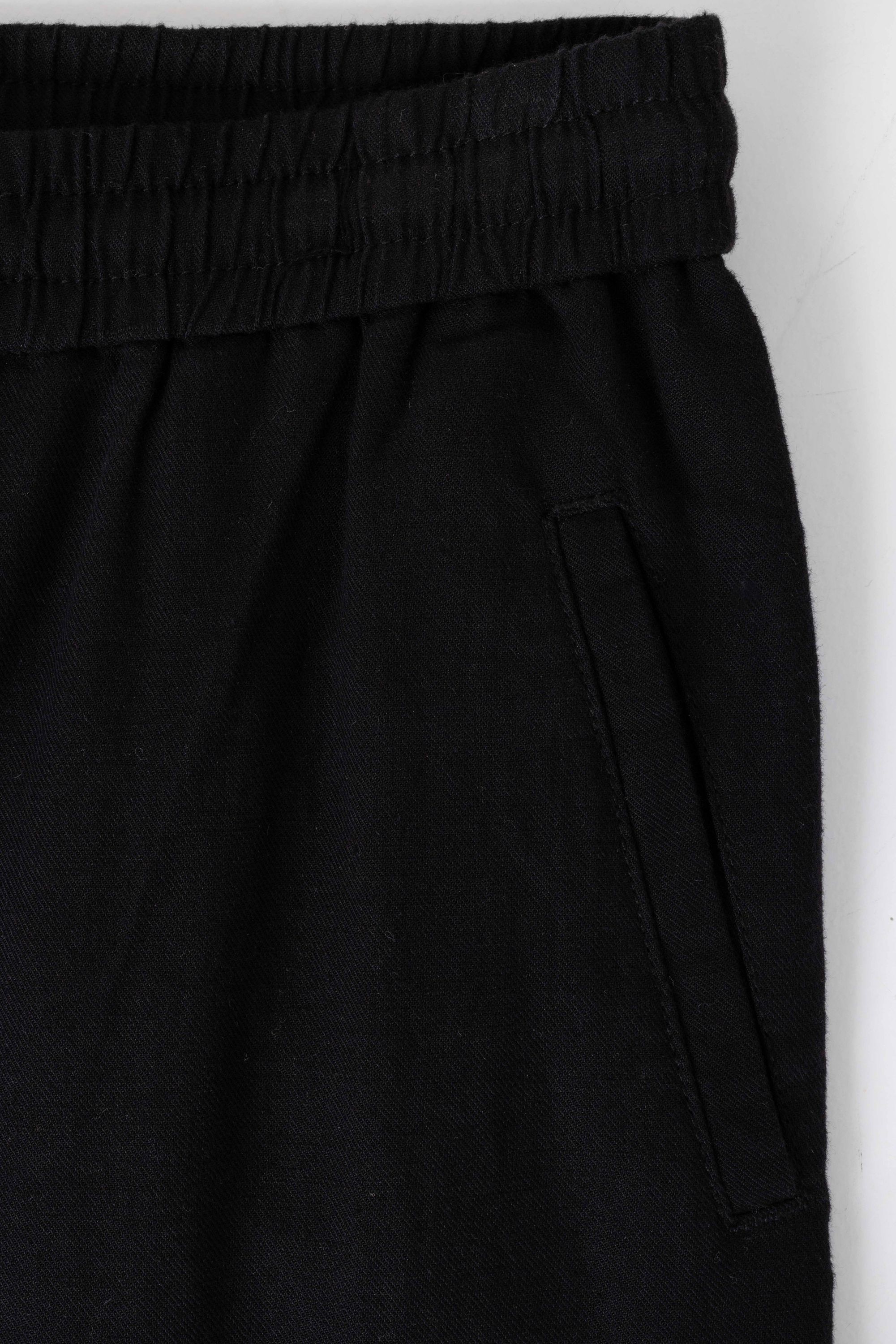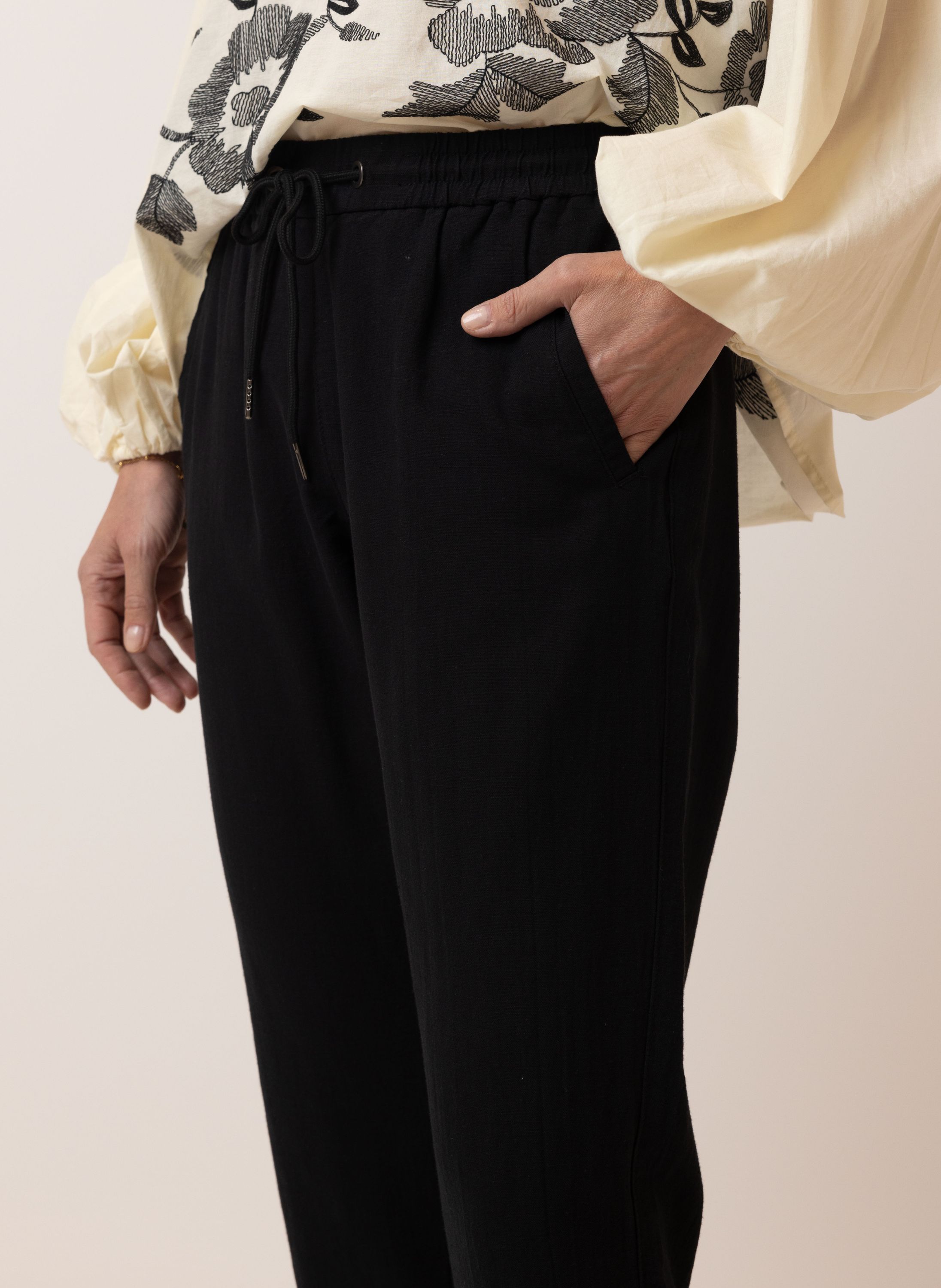 Deze high waist loose fit broek heeft een elastische tailleband met trekkoord voor extra comfort. Voorzien van steekzakken aan de voorkant en open zakken aan de achterkant.