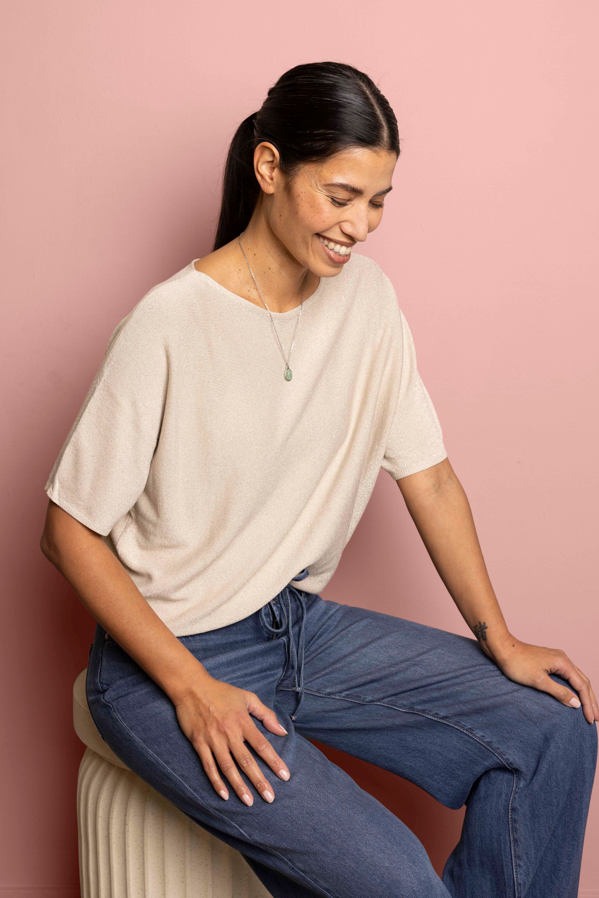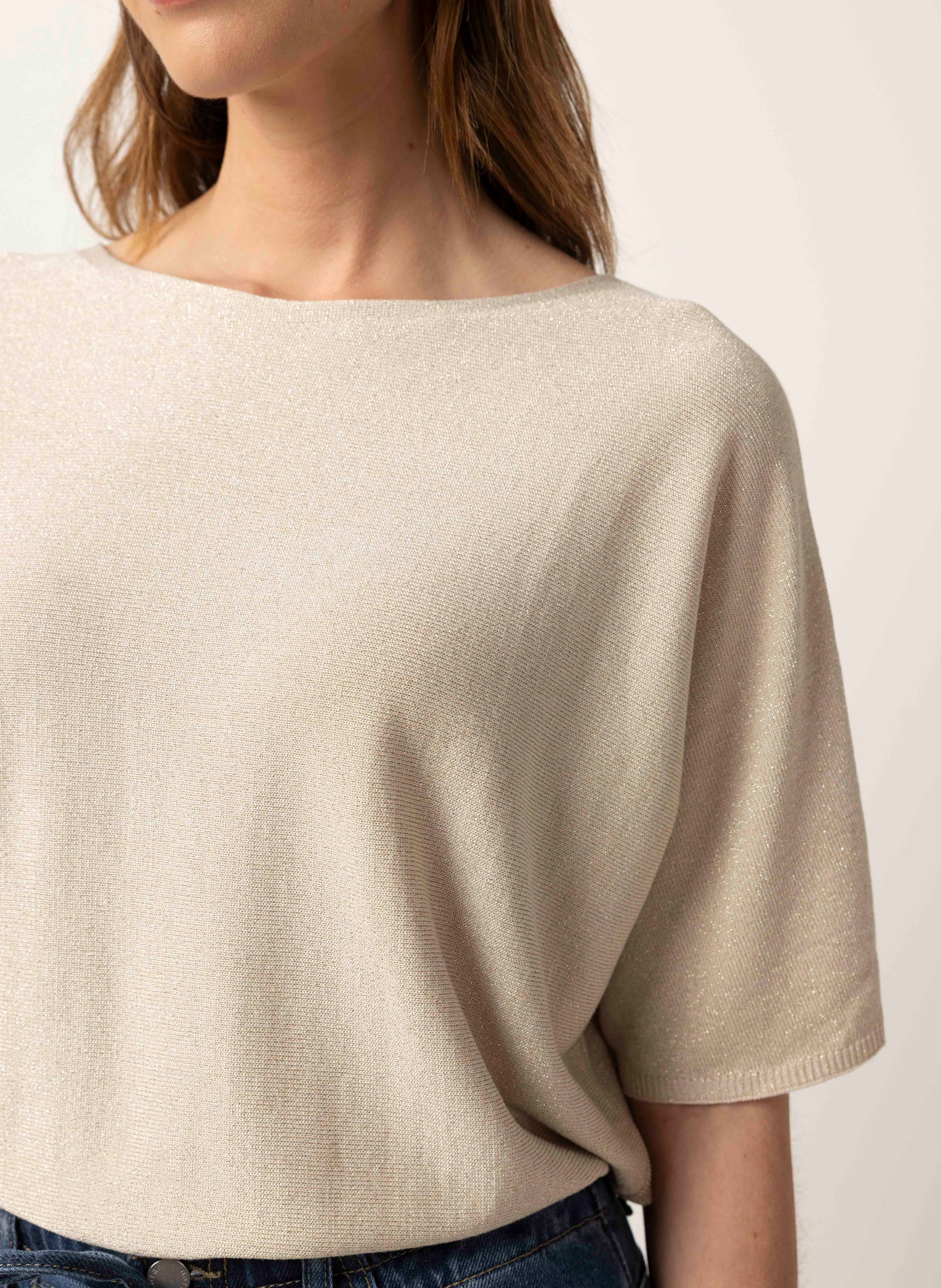 Deze fijngebreide trui met wijde ronde hals heeft korte mouwen en een comfortabele fit.
