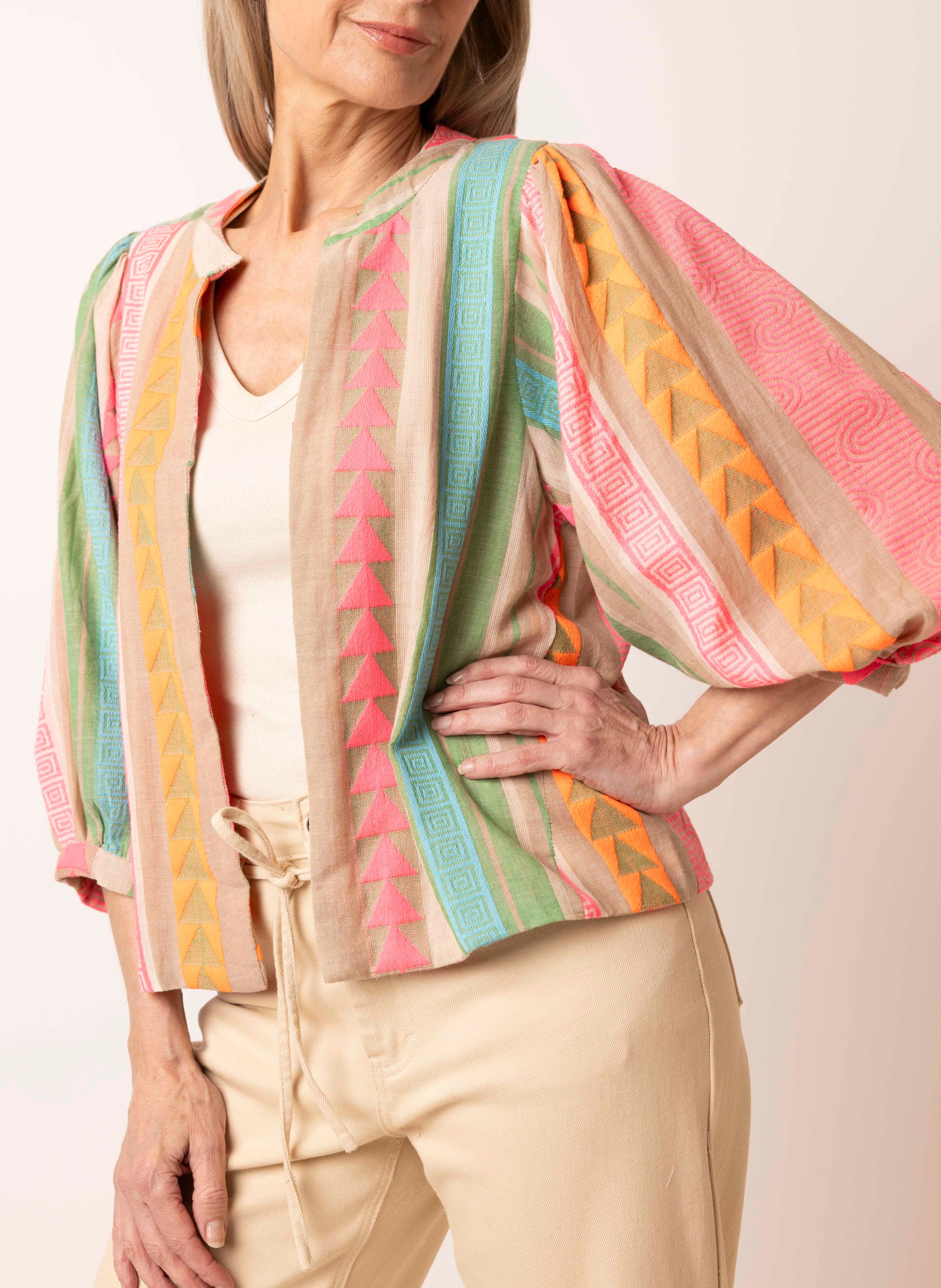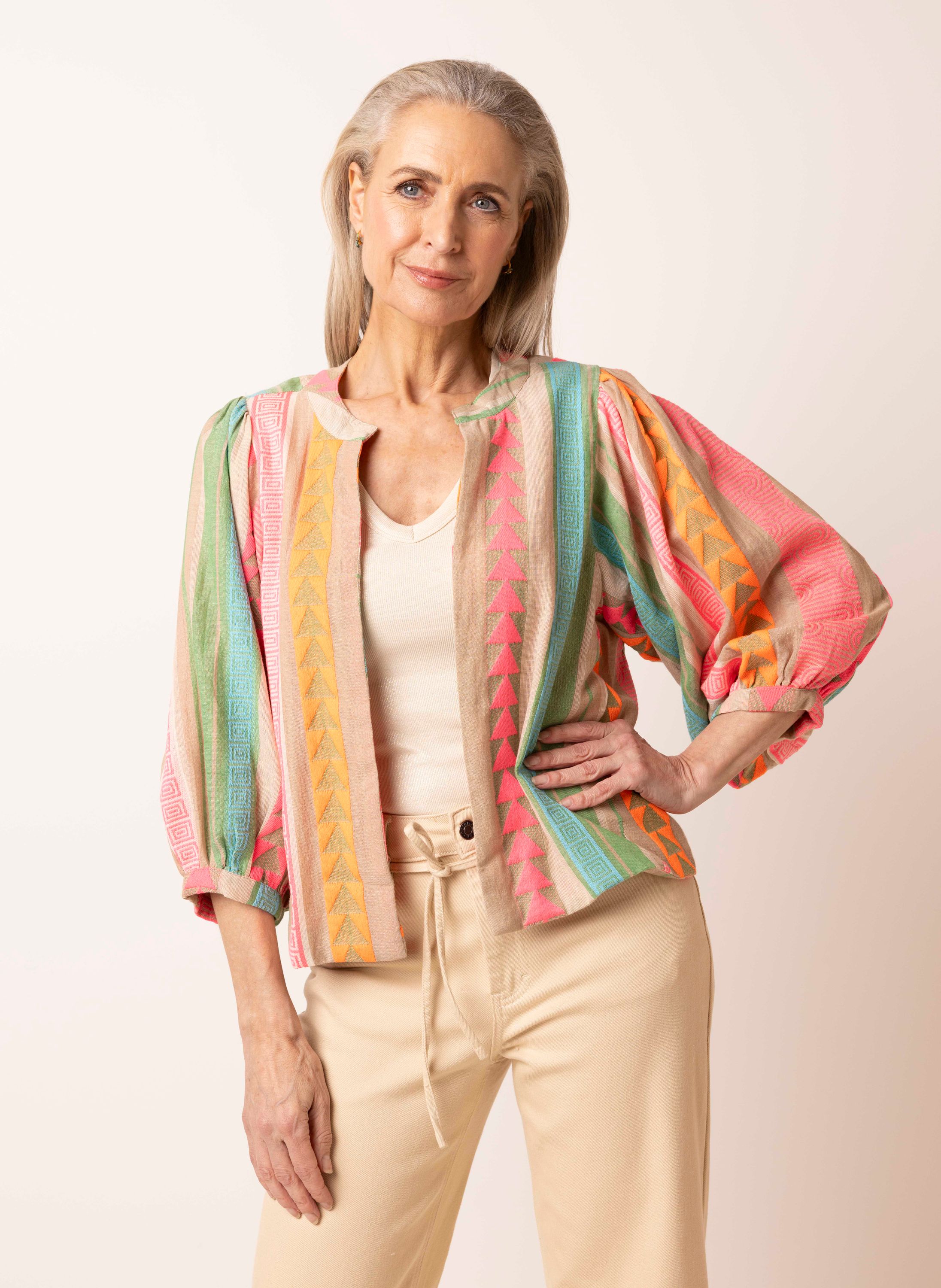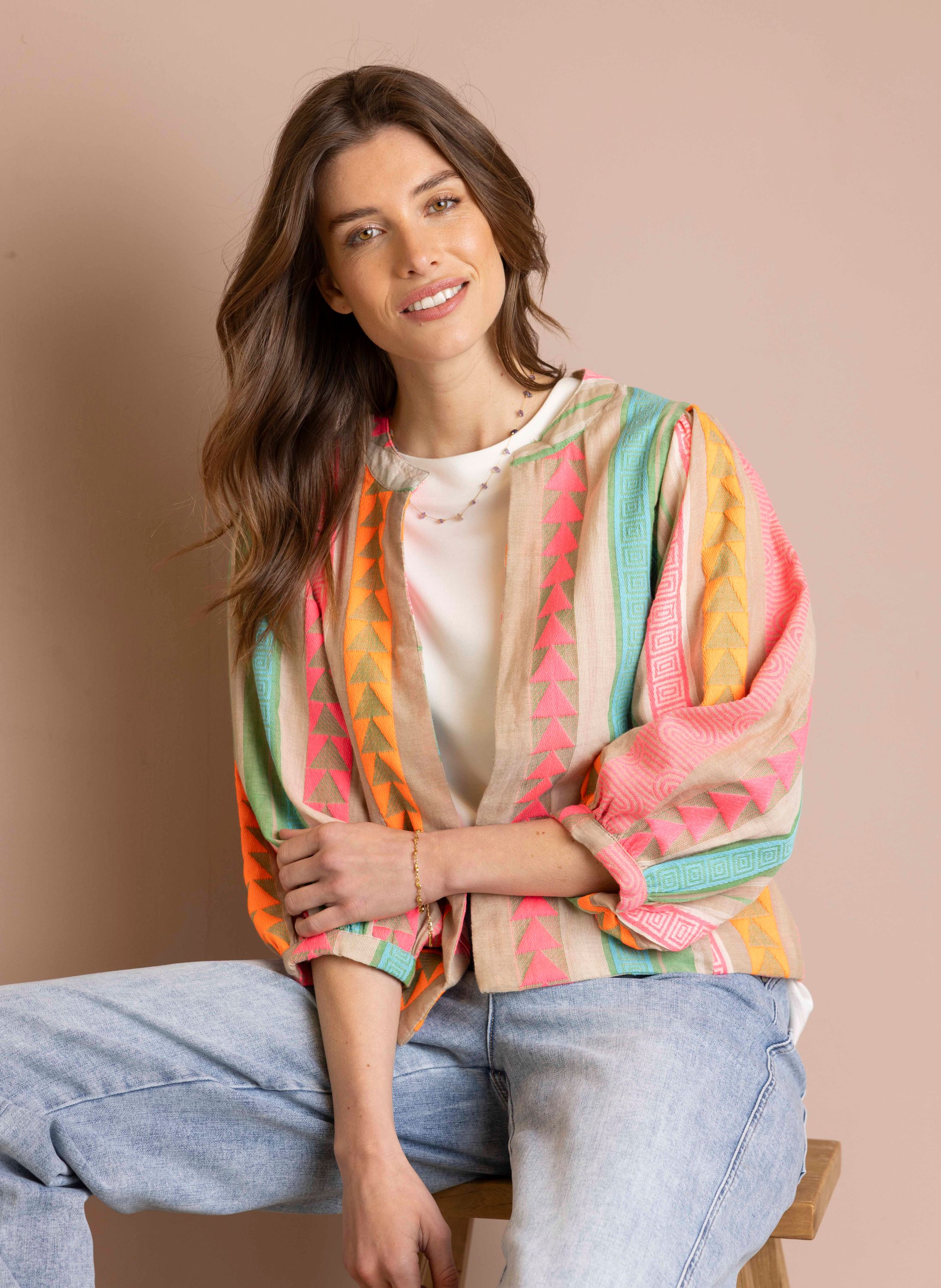 Dit open kimono jasje met driekwart ballonmouwen heeft een kleurrijke uitstraling.