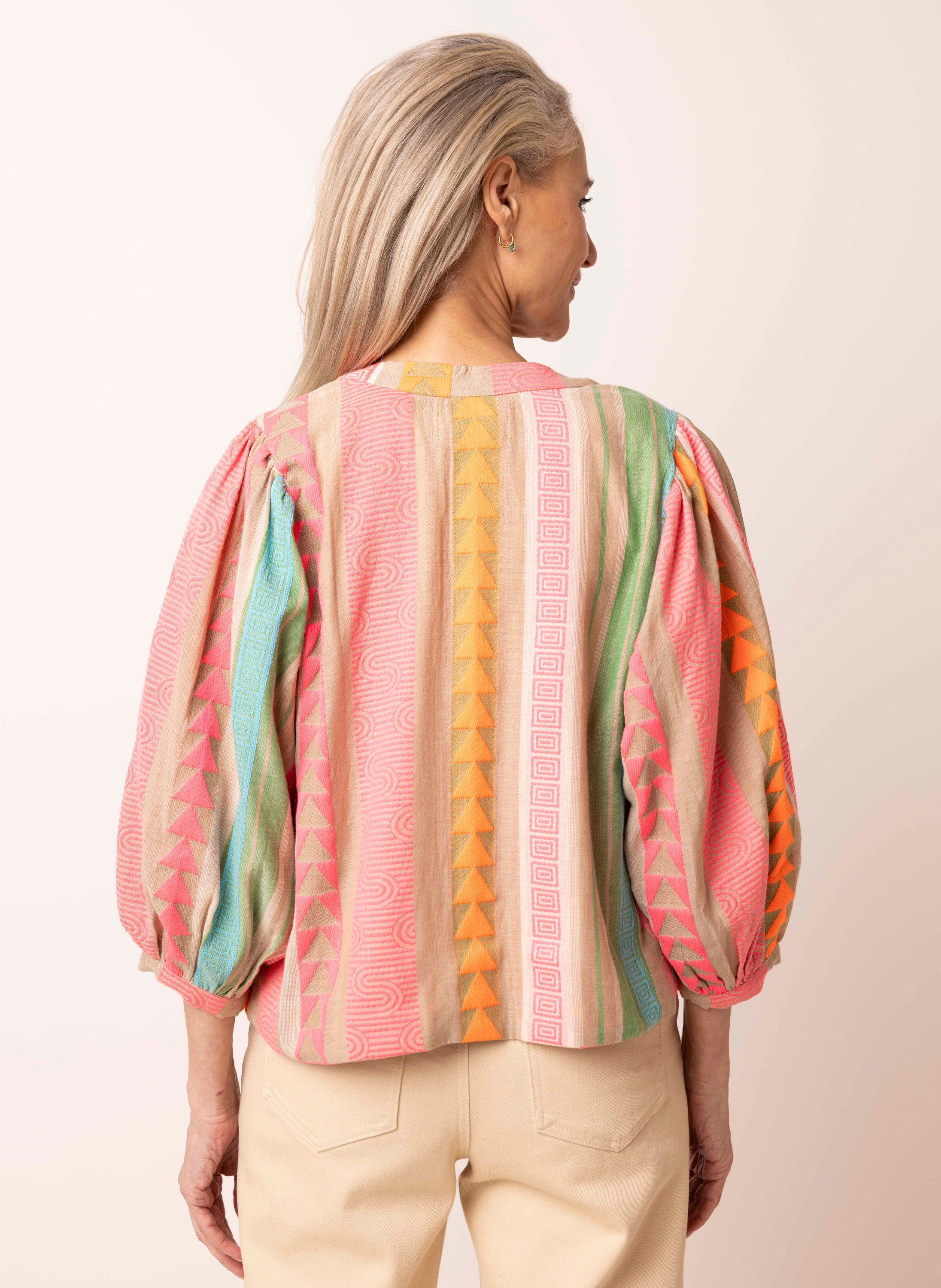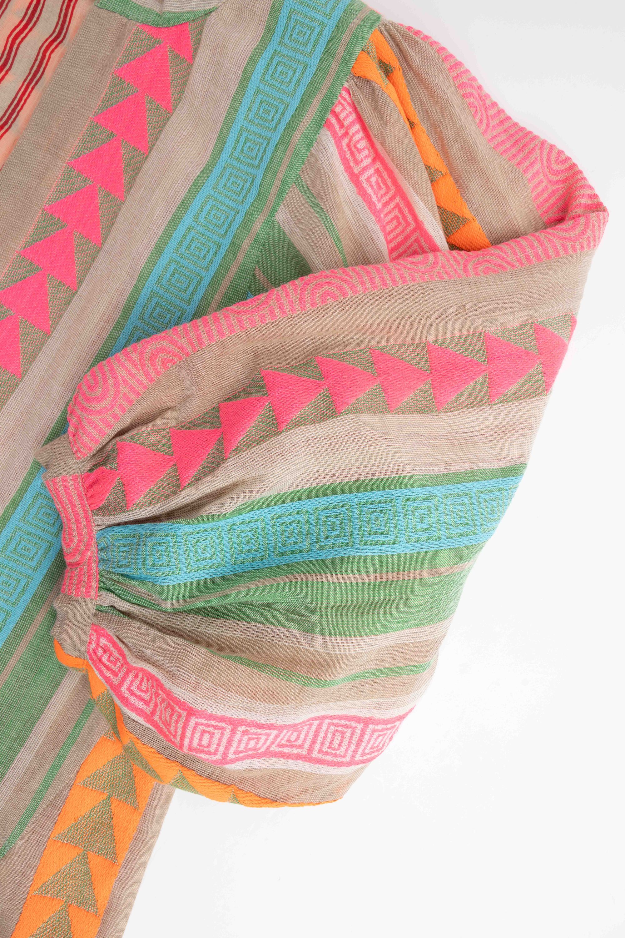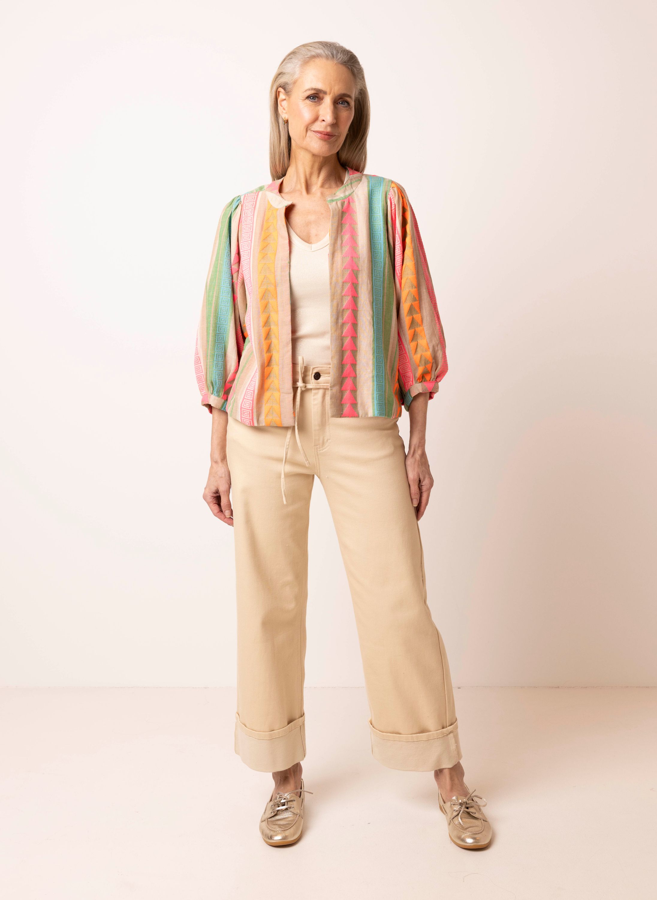 Dit open kimono jasje met driekwart ballonmouwen heeft een kleurrijke uitstraling.