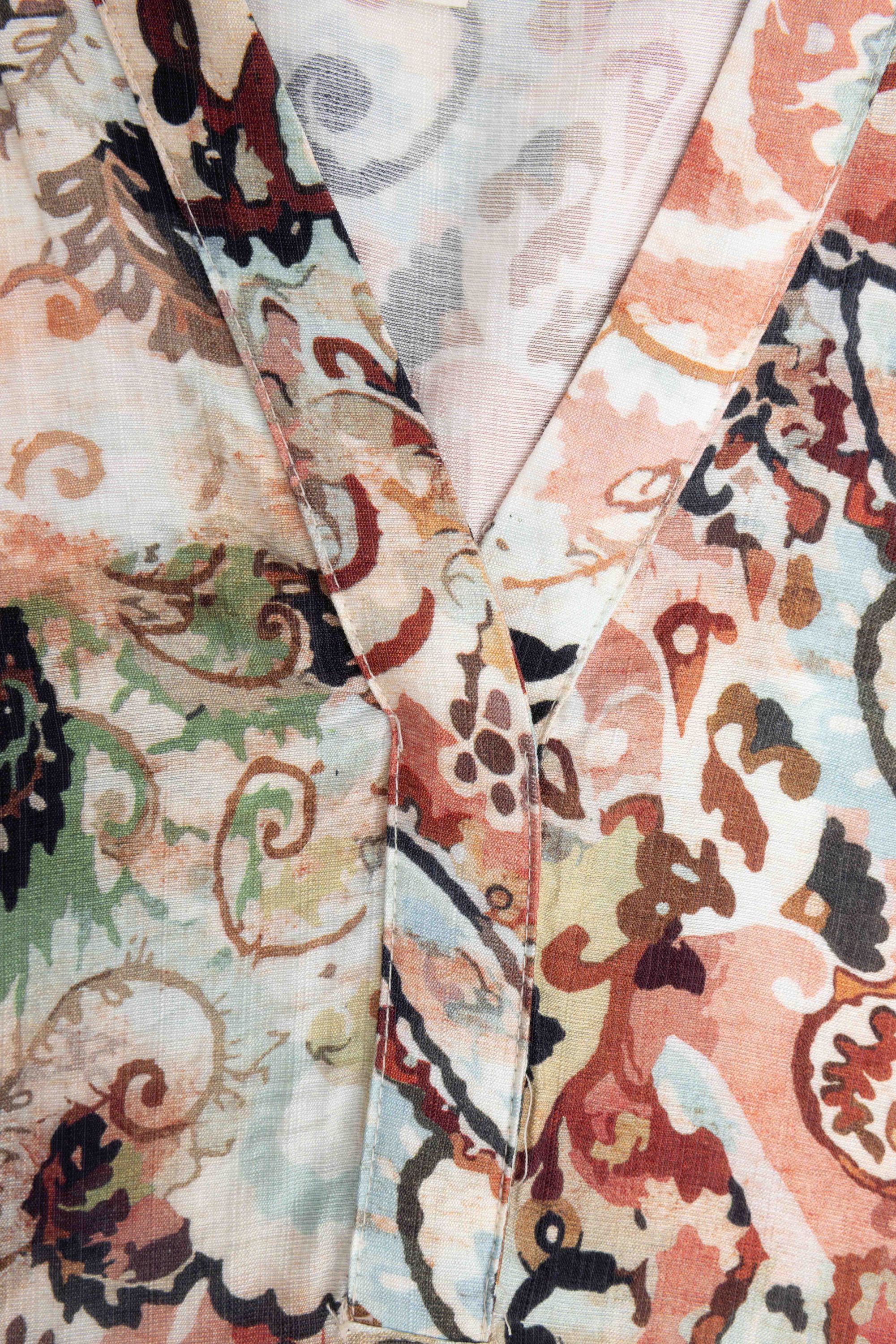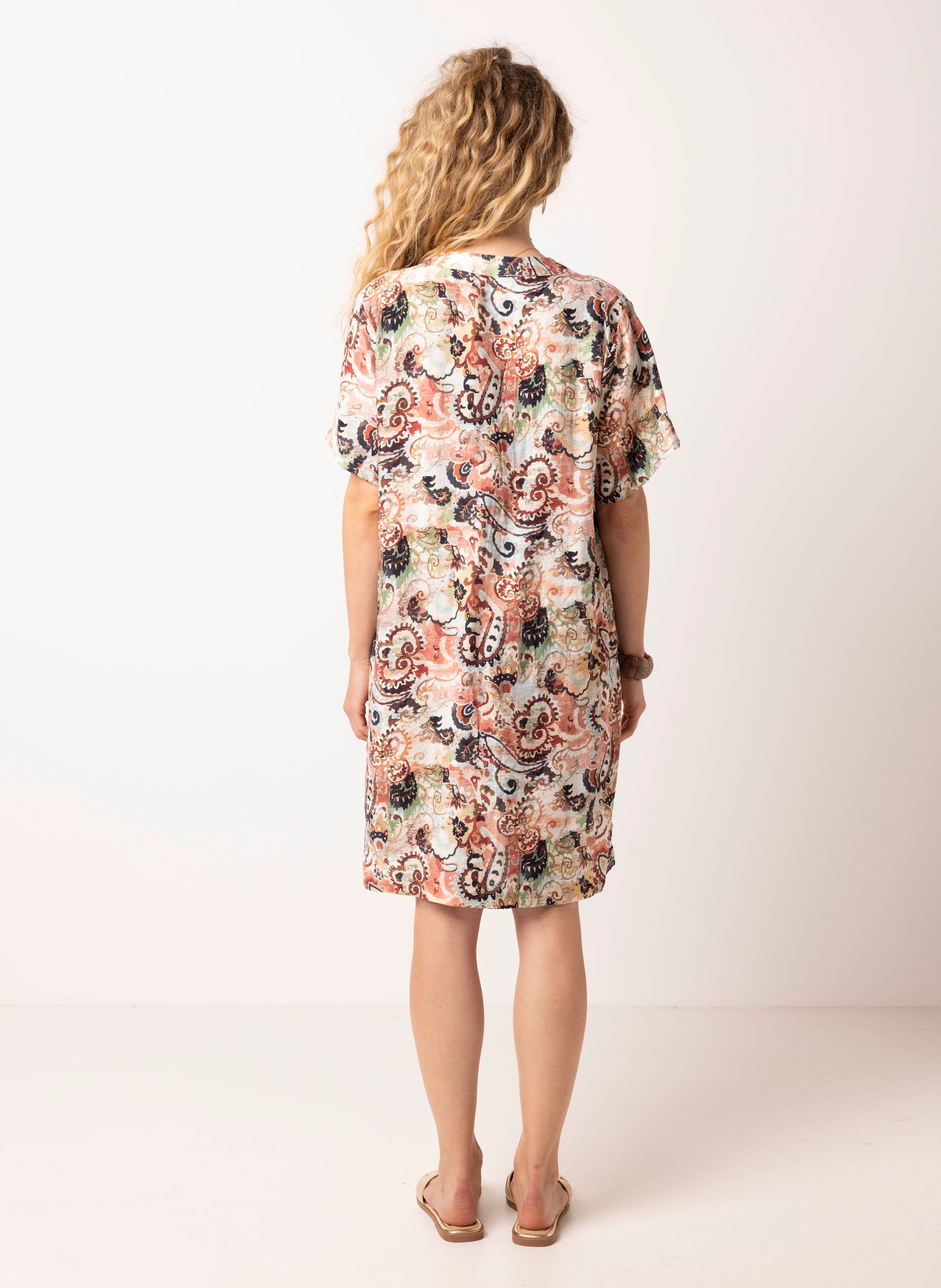 Deze losvallende midi jurk met V-hals en korte mouwen heeft een luchtige uitstraling.