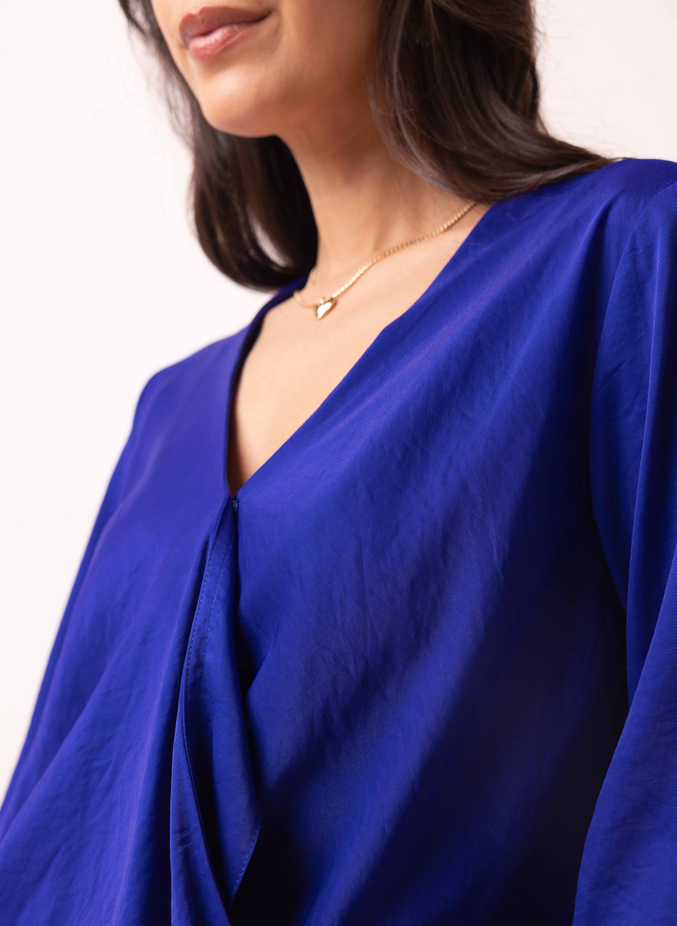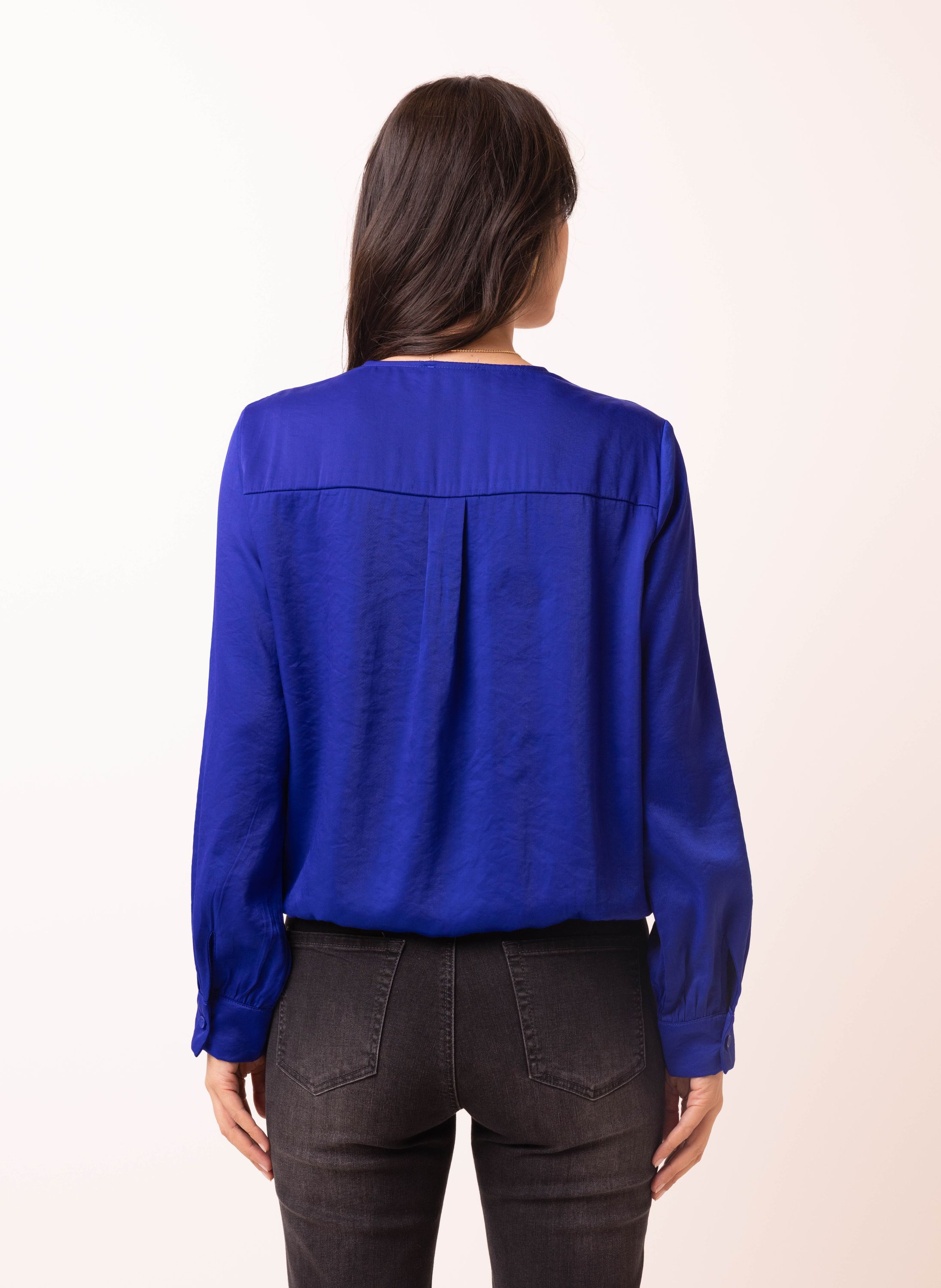 Deze subtiel glanzende blouse met V-hals, overslag met knoopsluiting, lange mouwen en plooirand op de achterzijde zorgt voor een vrouwelijke look. Dit item is exclusief verkrijgbaar in geselecteerde winkels en online. Controleer de winkelvoorraad om de beschikbaarheid in een winkel bij jou in de buurt te bekijken.