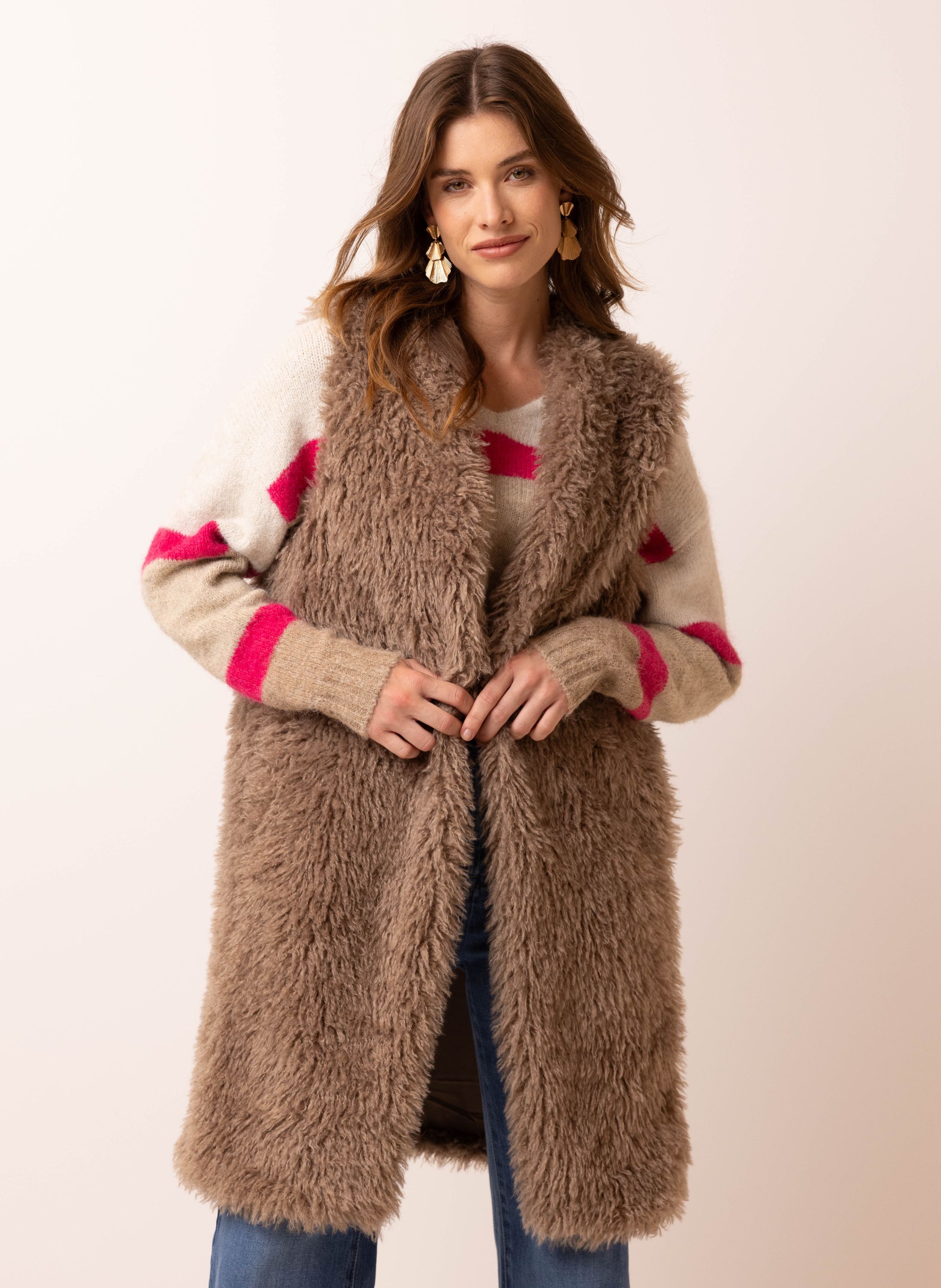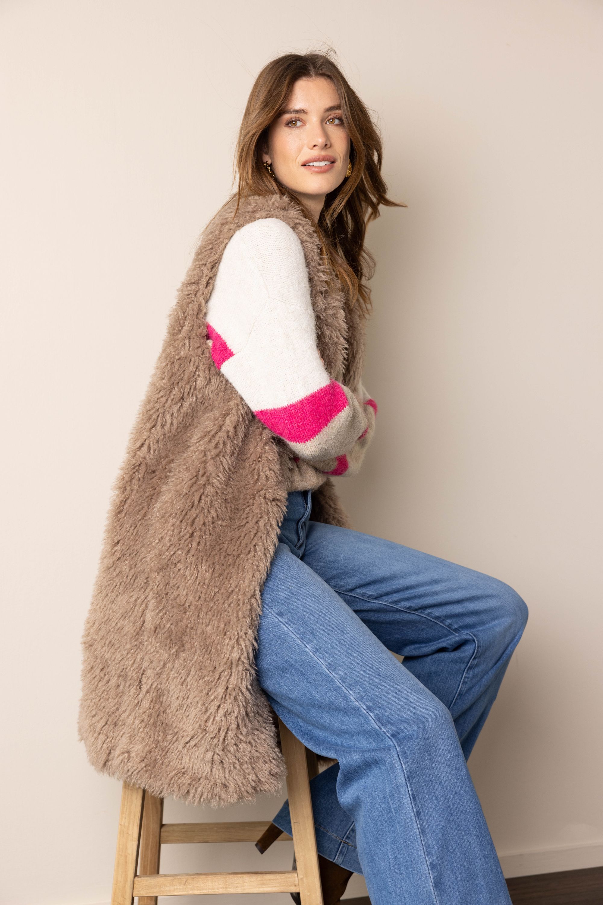 Dit lange open gilet van imitatiebont met steekzakken voelt heerlijk zacht aan.