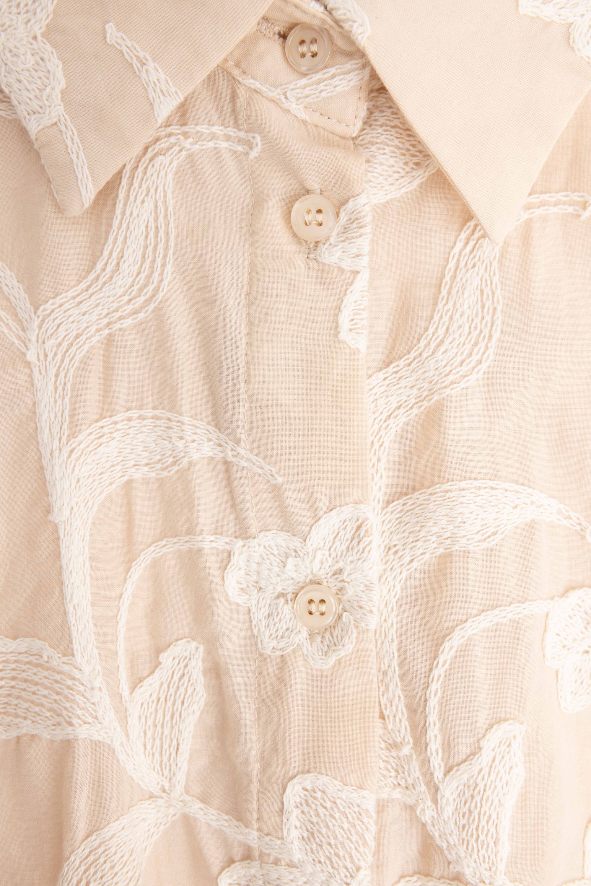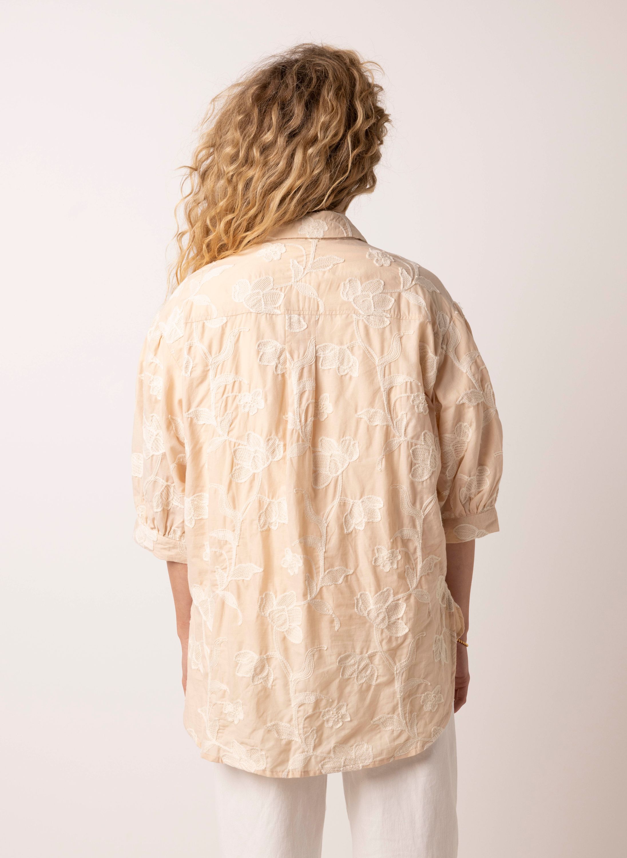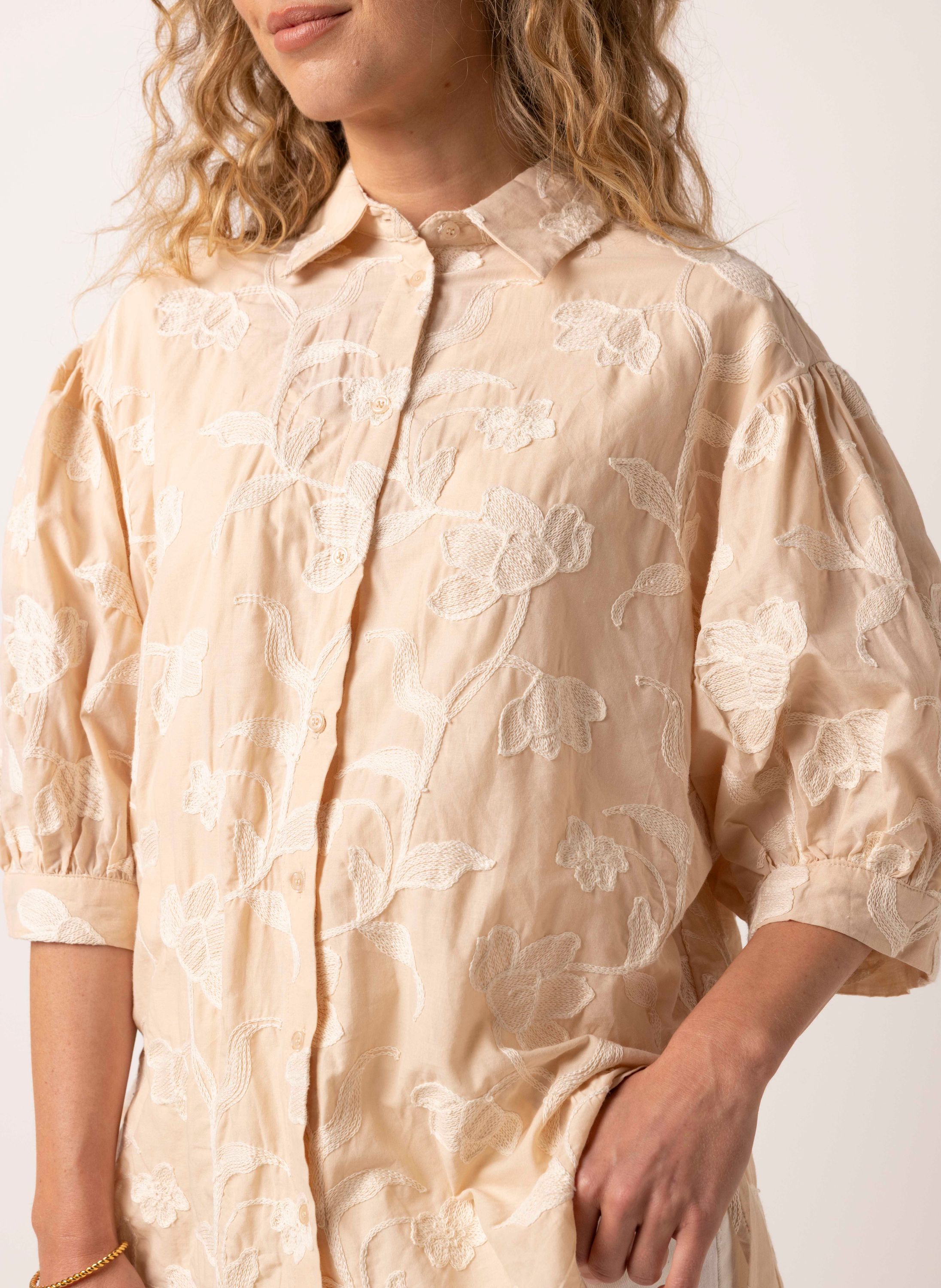 Deze katoenen lange blouse met klassieke kraag, V-hals en halflange pofmouwen heeft een vrouwelijke uitstraling.
