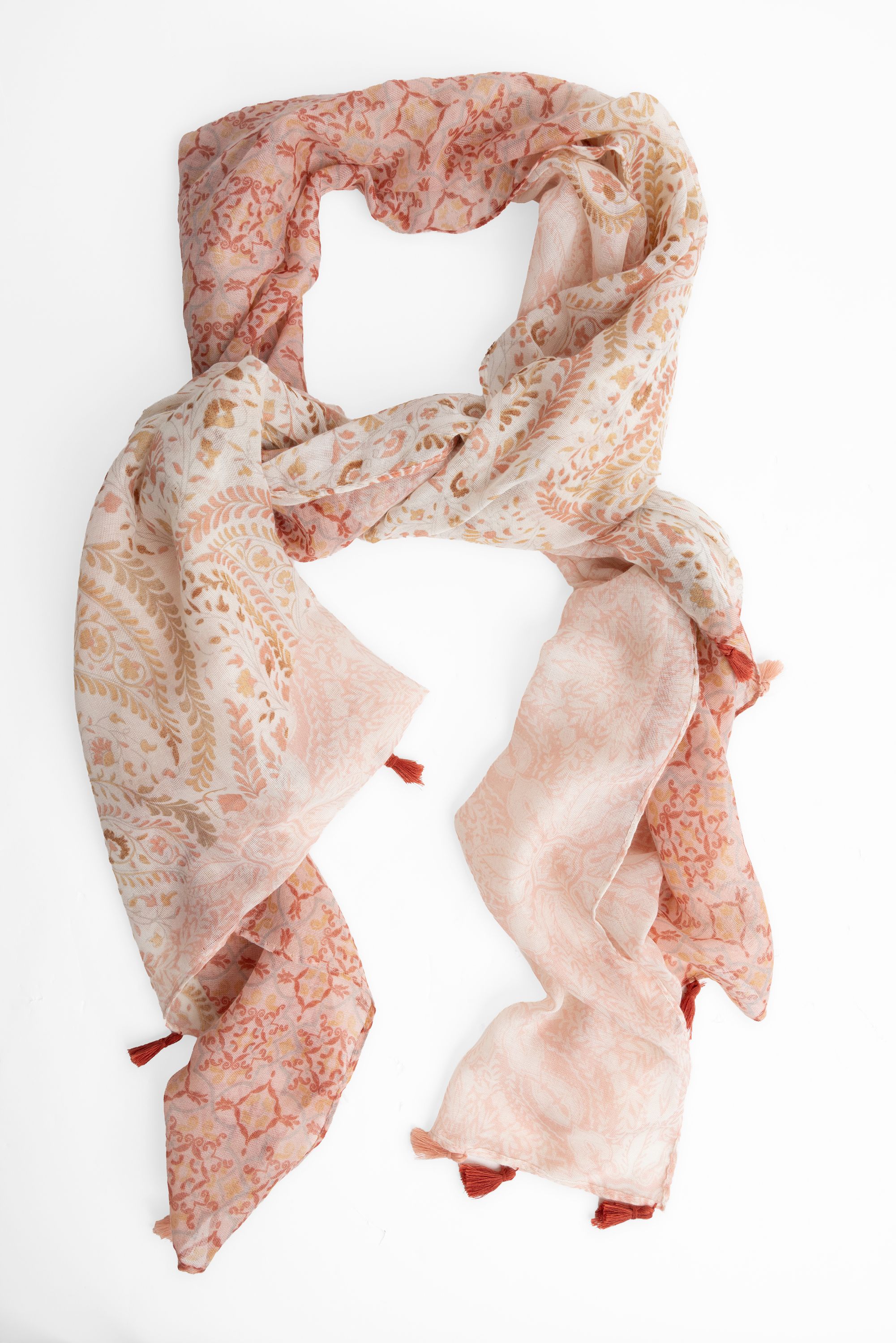 Deze fijngeweven sjaal met grafische print en kwastjes geeft je outfit een speels accent.