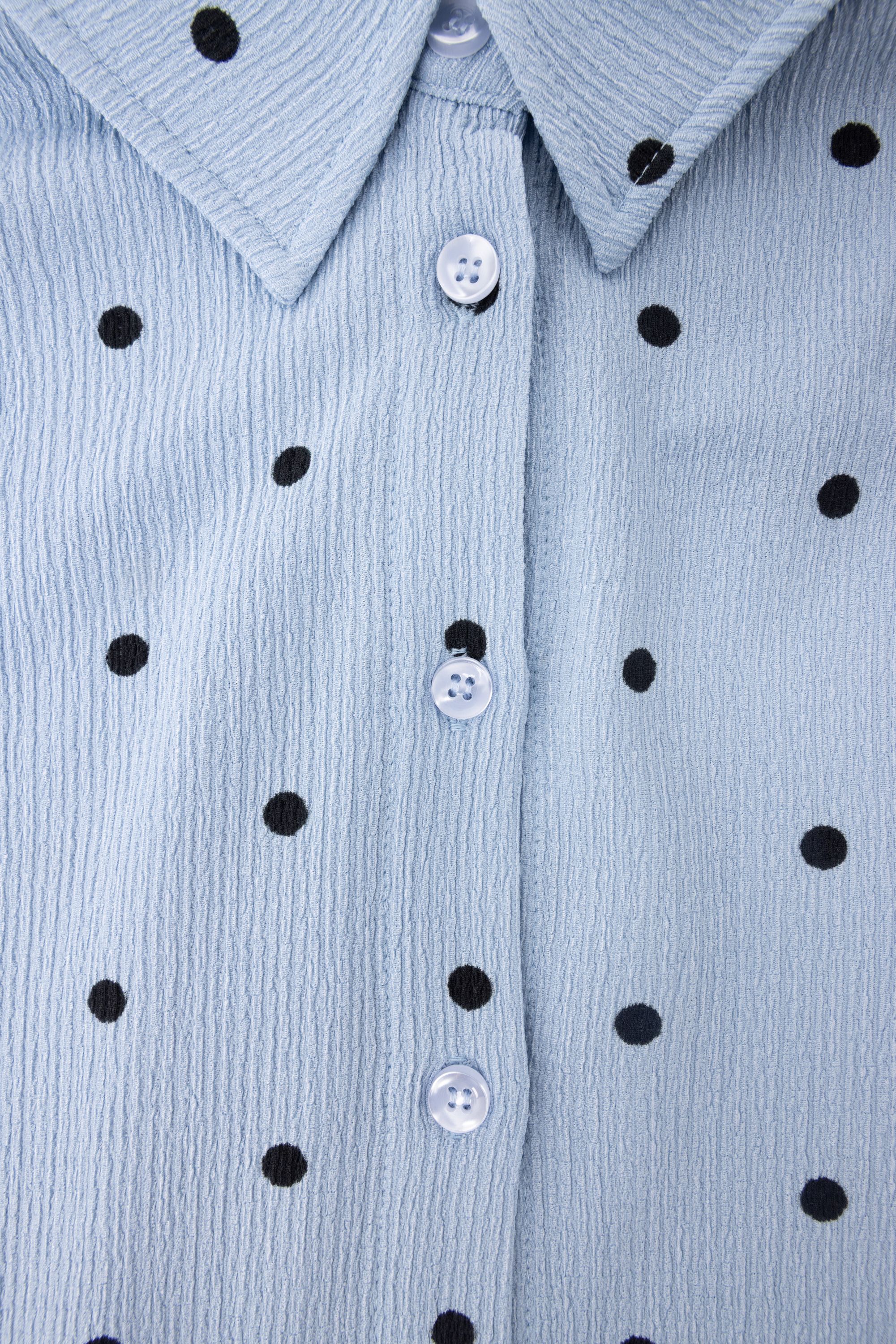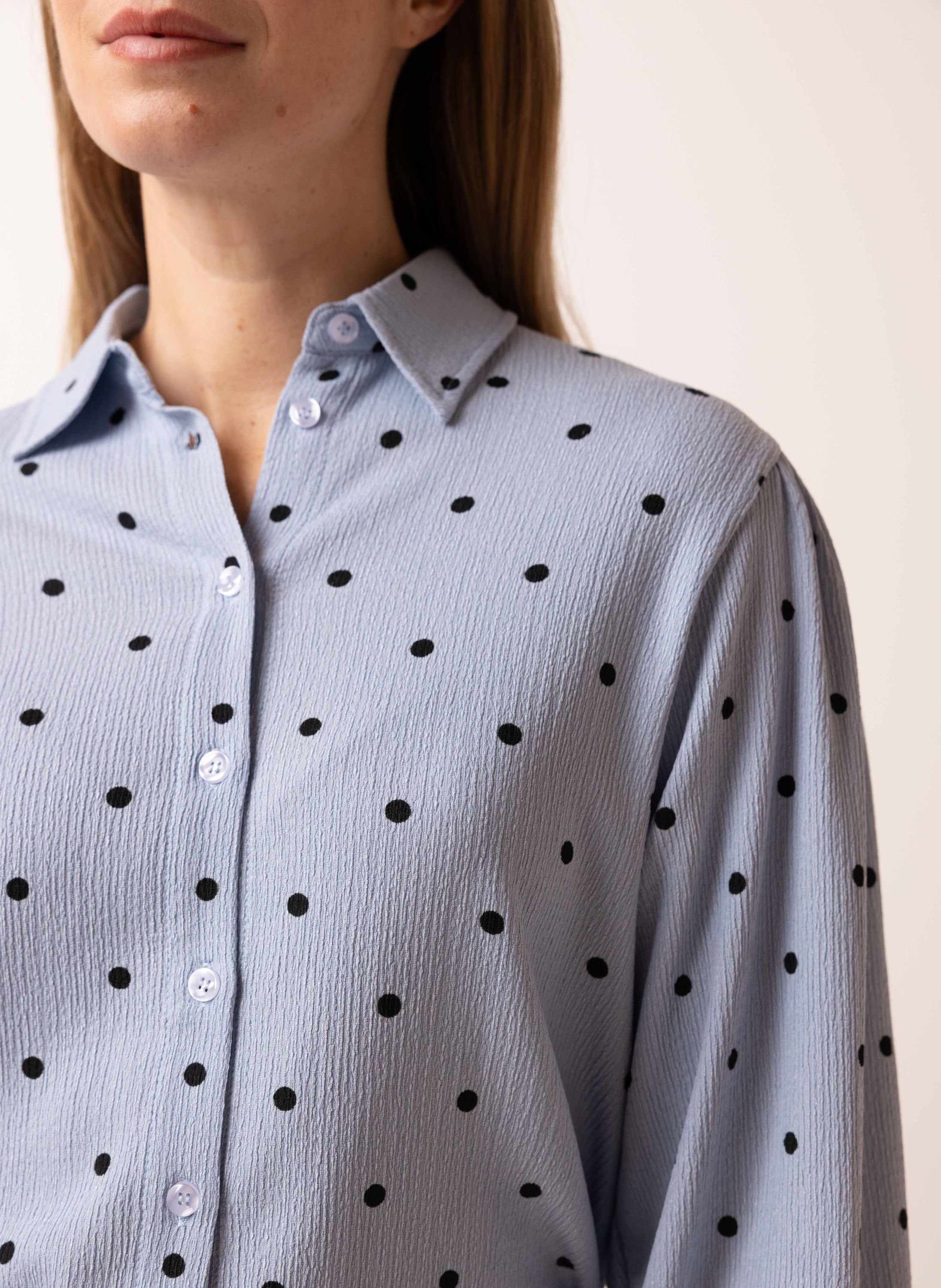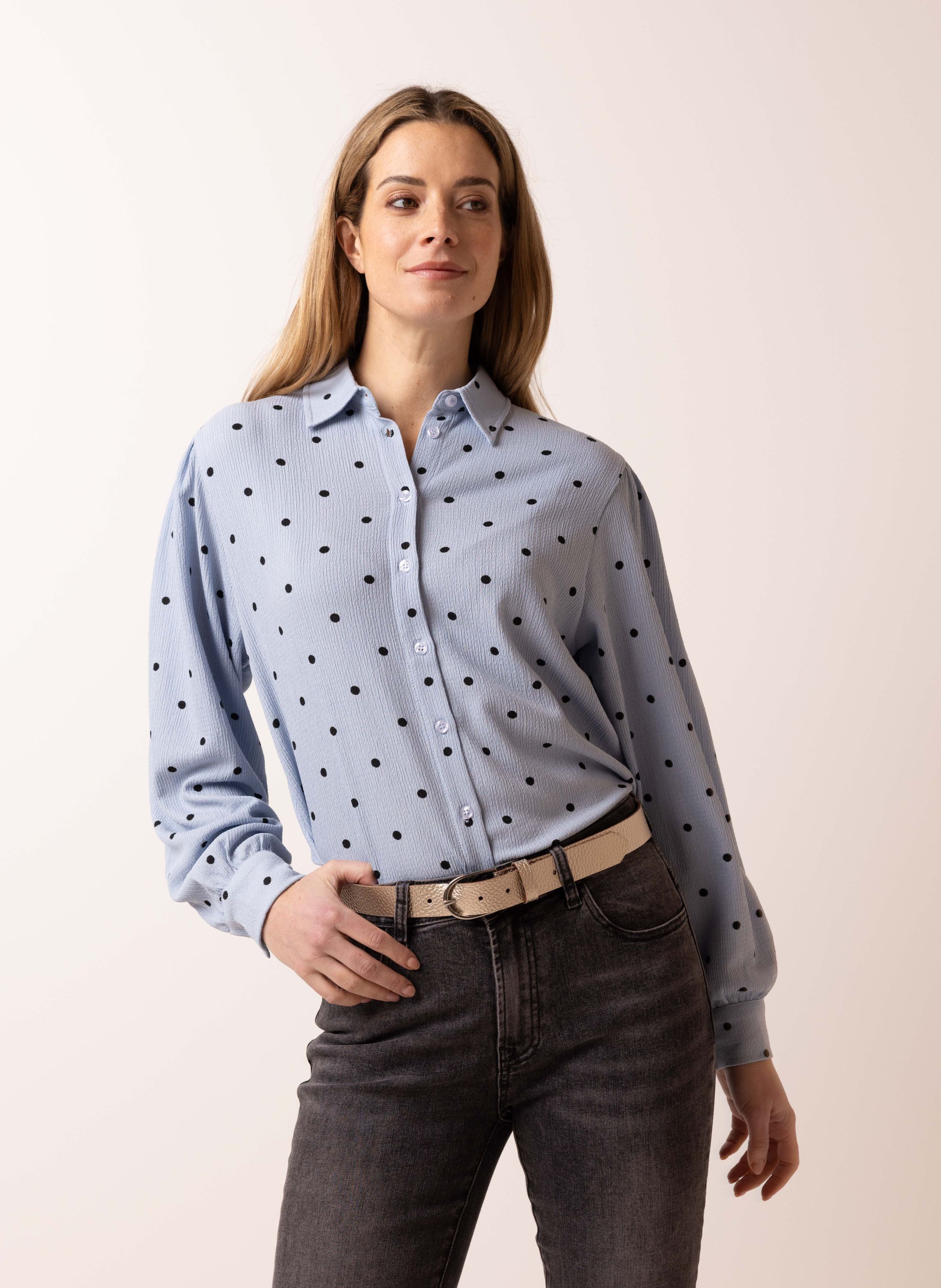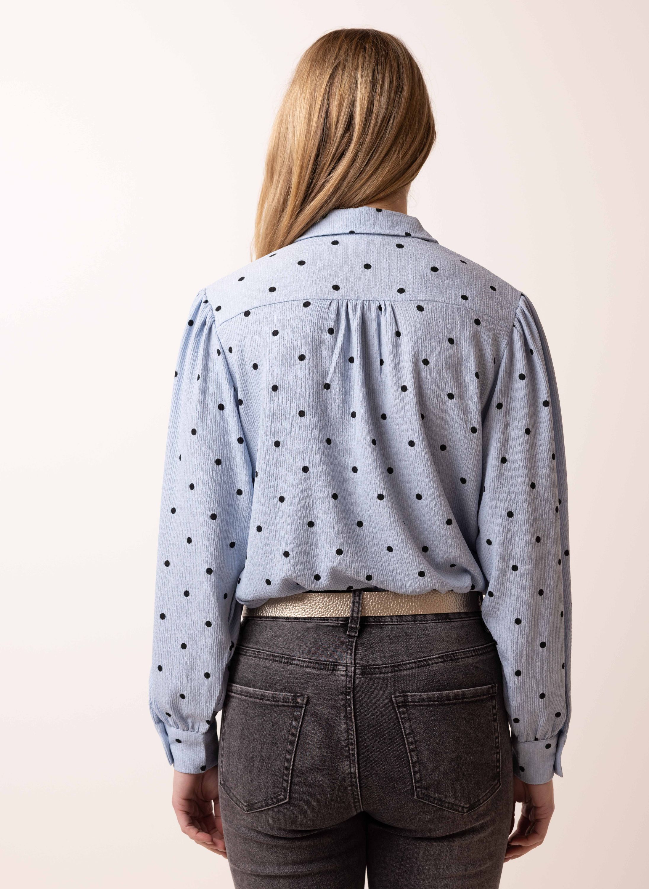 Deze blouse met klassieke kraag heeft een knoopsluiting, lange mouwen en een plooirand aan de achterzijde.