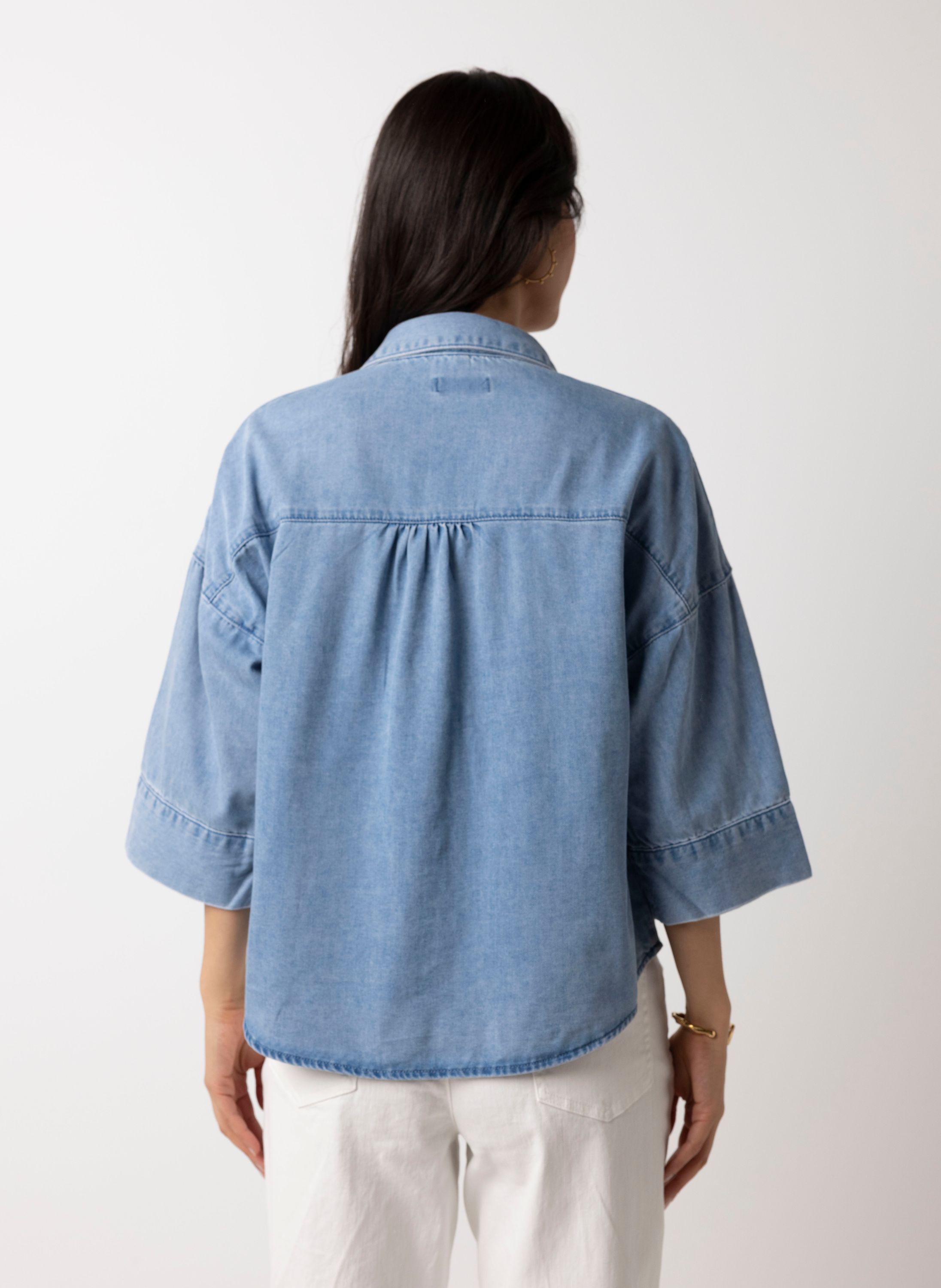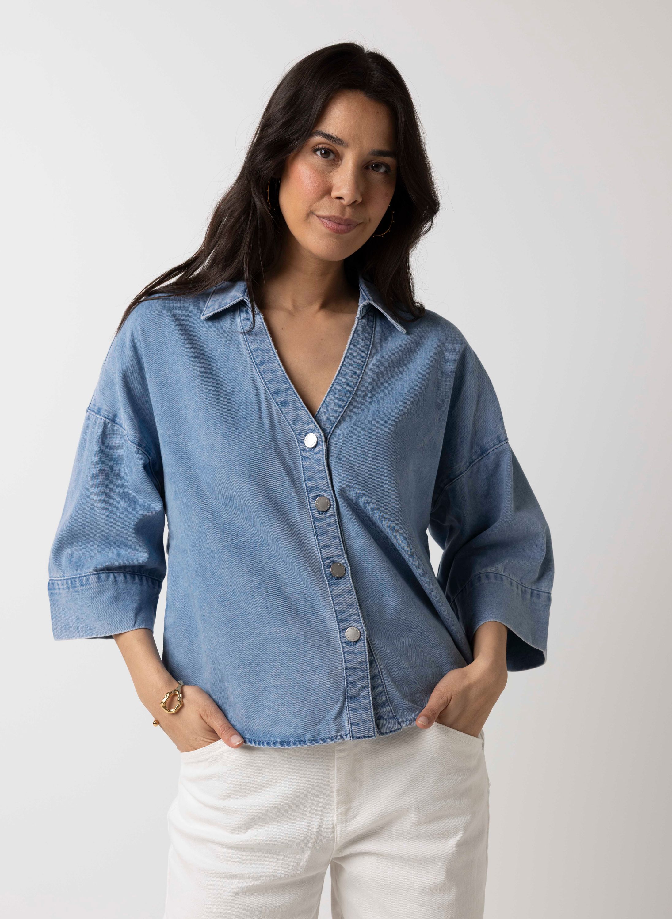 Deze denim blouse met V-hals, knoopsluiting, plooirand aan de achterzijde en driekwart mouwen heeft een stoere en vrouwelijke uitstraling.