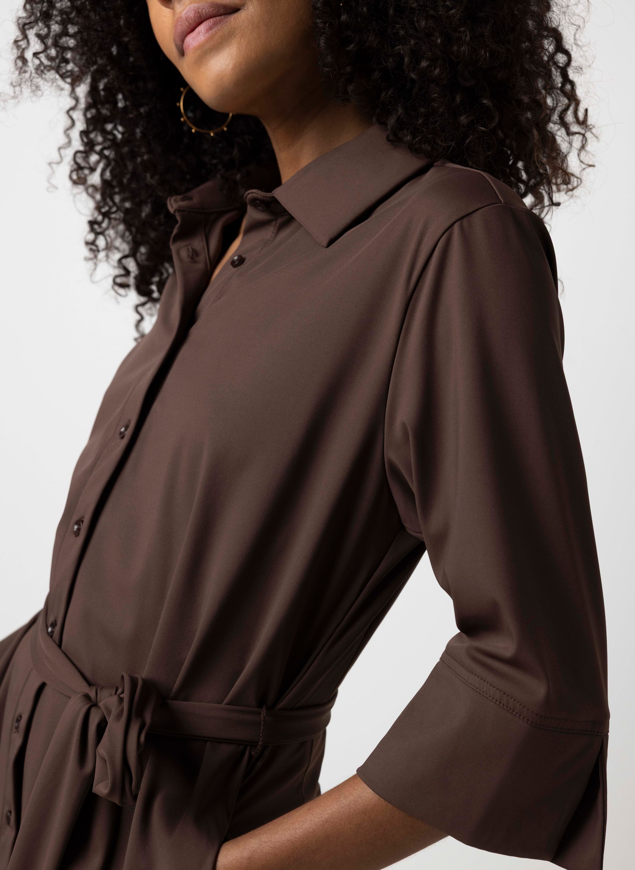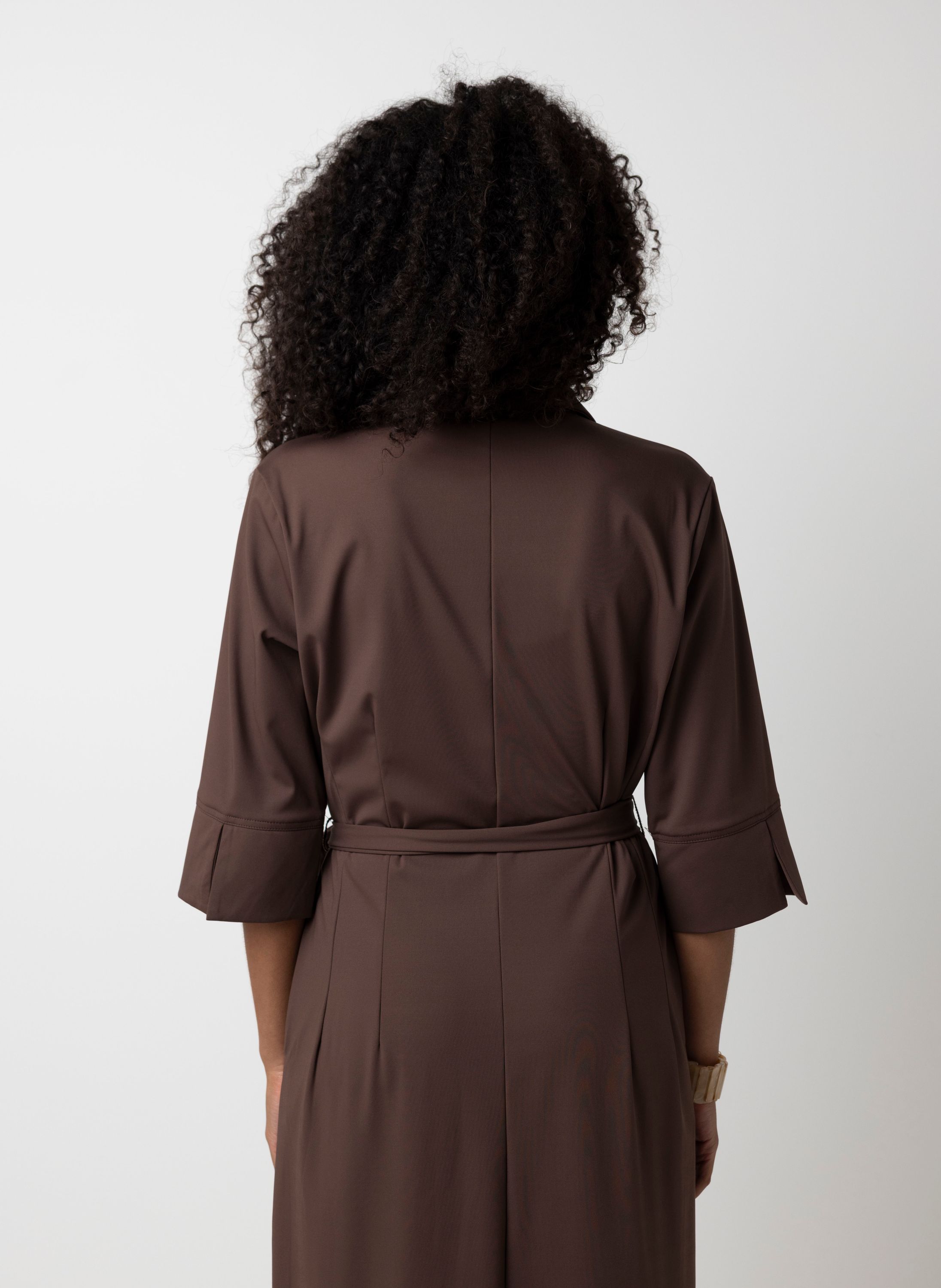 Maxi jurk met knoopsluiting, klassieke kraag, steekzakken, halflange mouwen en ceintuur die door de lusjes heen kan worden gedragen.