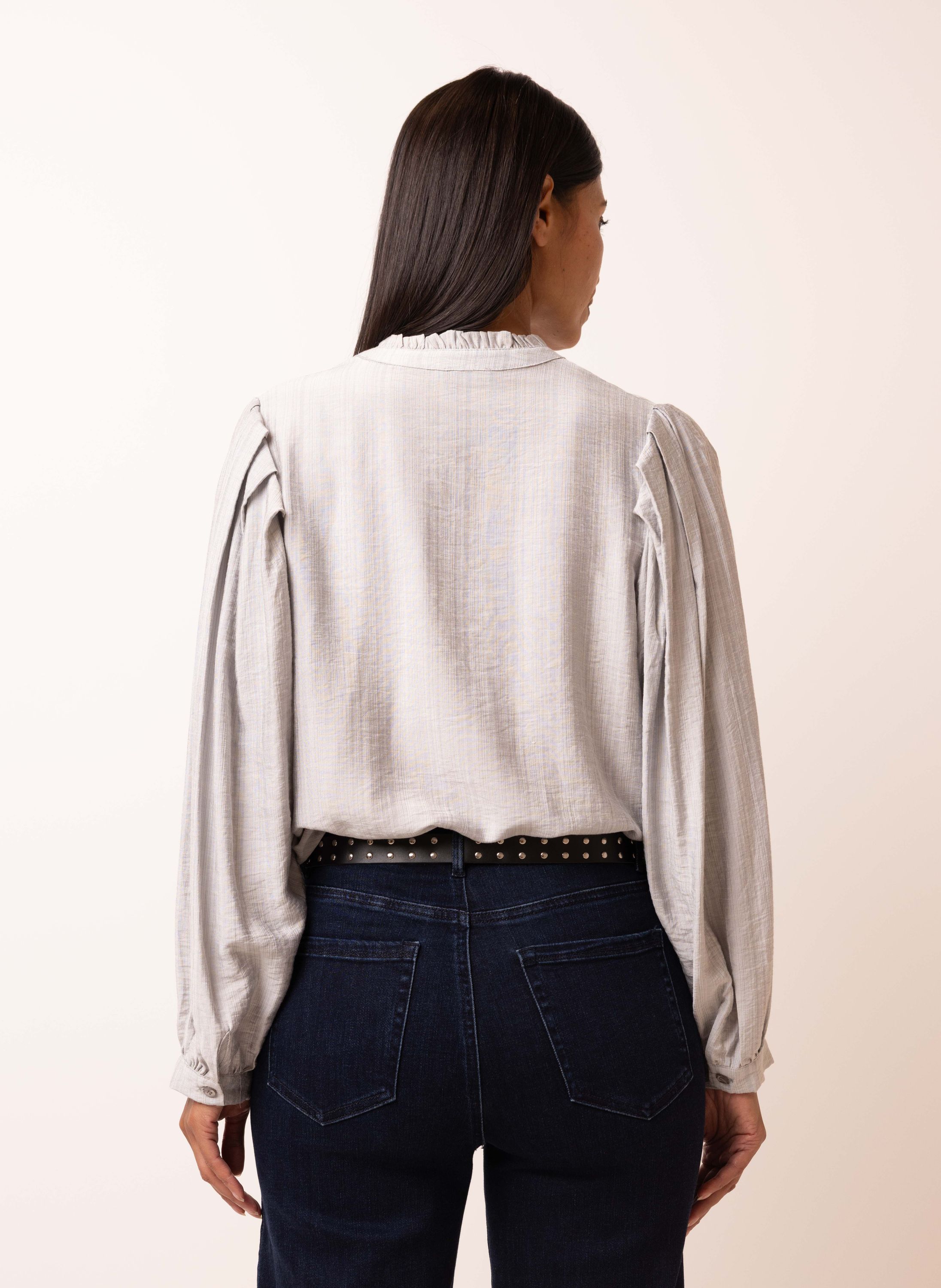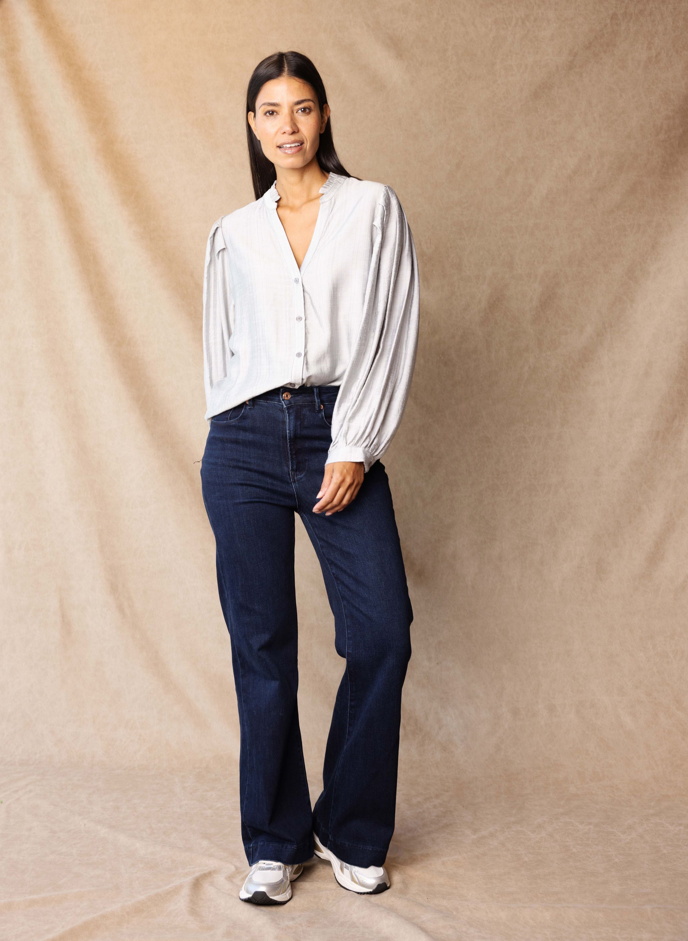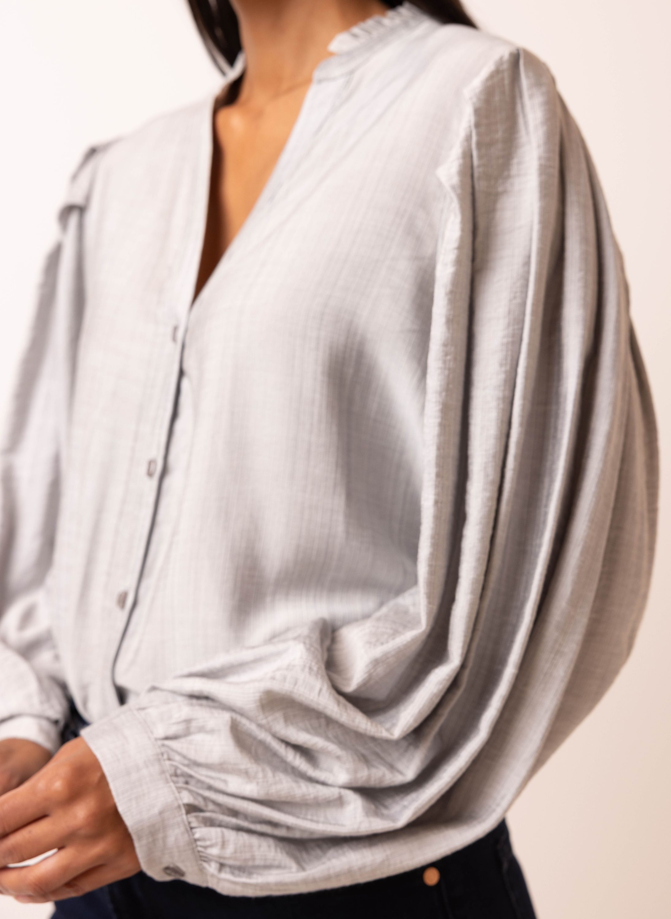 Deze blouse heeft een V-hals, ruches, knoopsluiting en lange pofmouwen. Dit item is exclusief verkrijgbaar in geselecteerde winkels en online. Controleer de winkelvoorraad om de beschikbaarheid in een winkel bij jou in de buurt te bekijken.